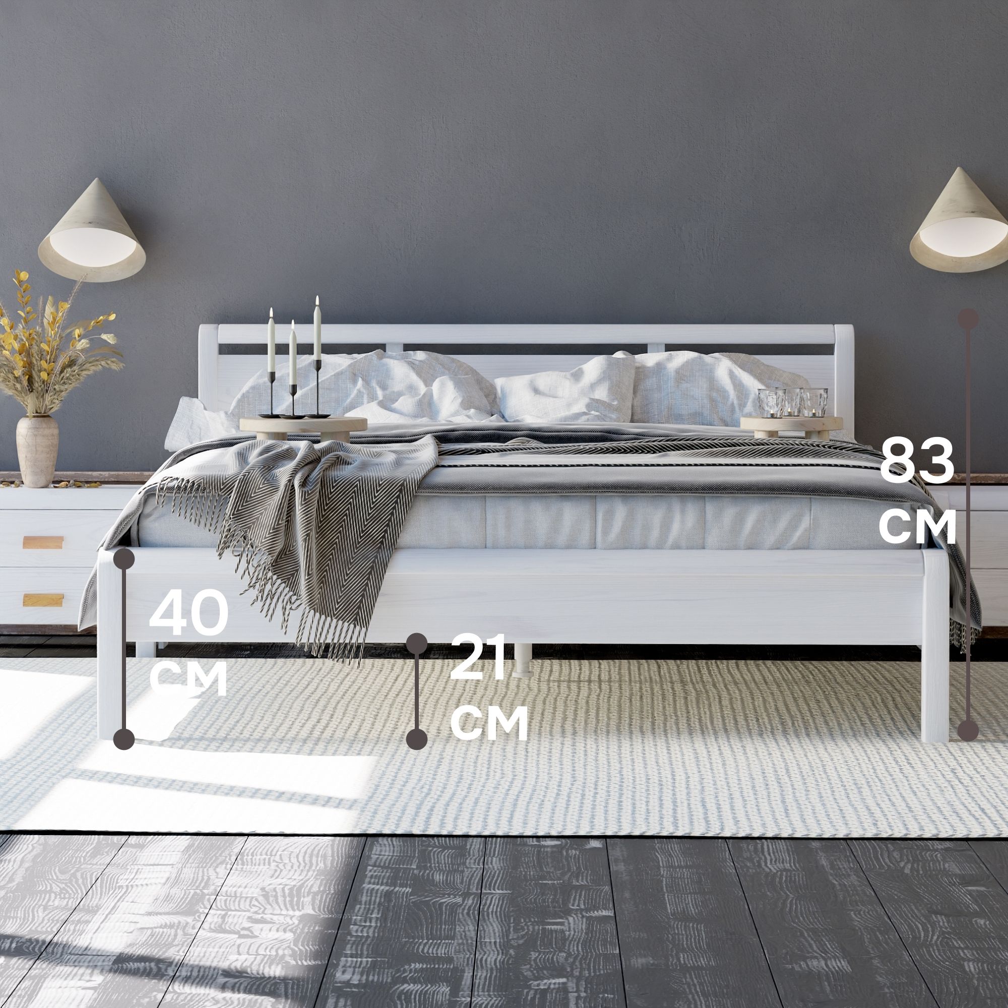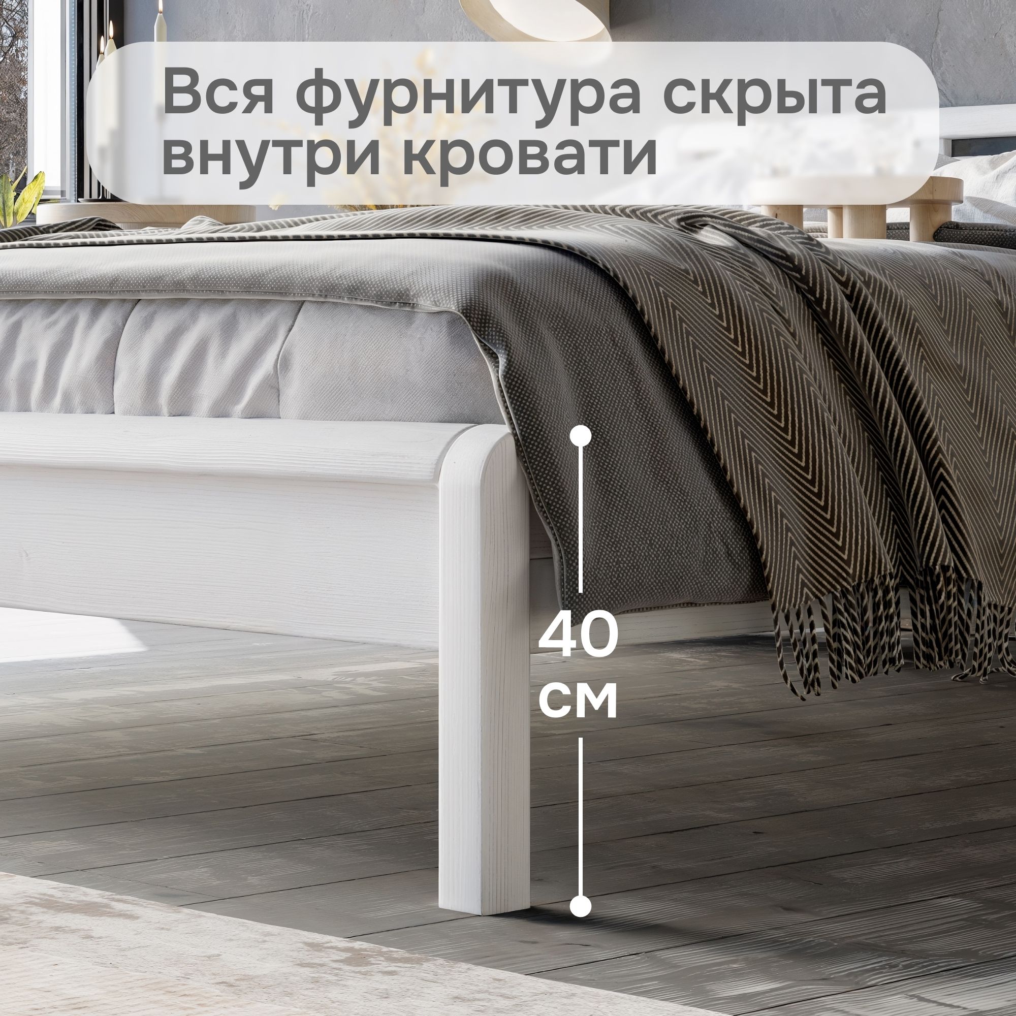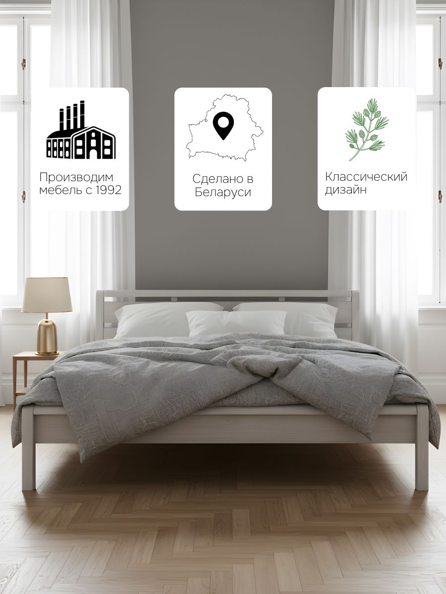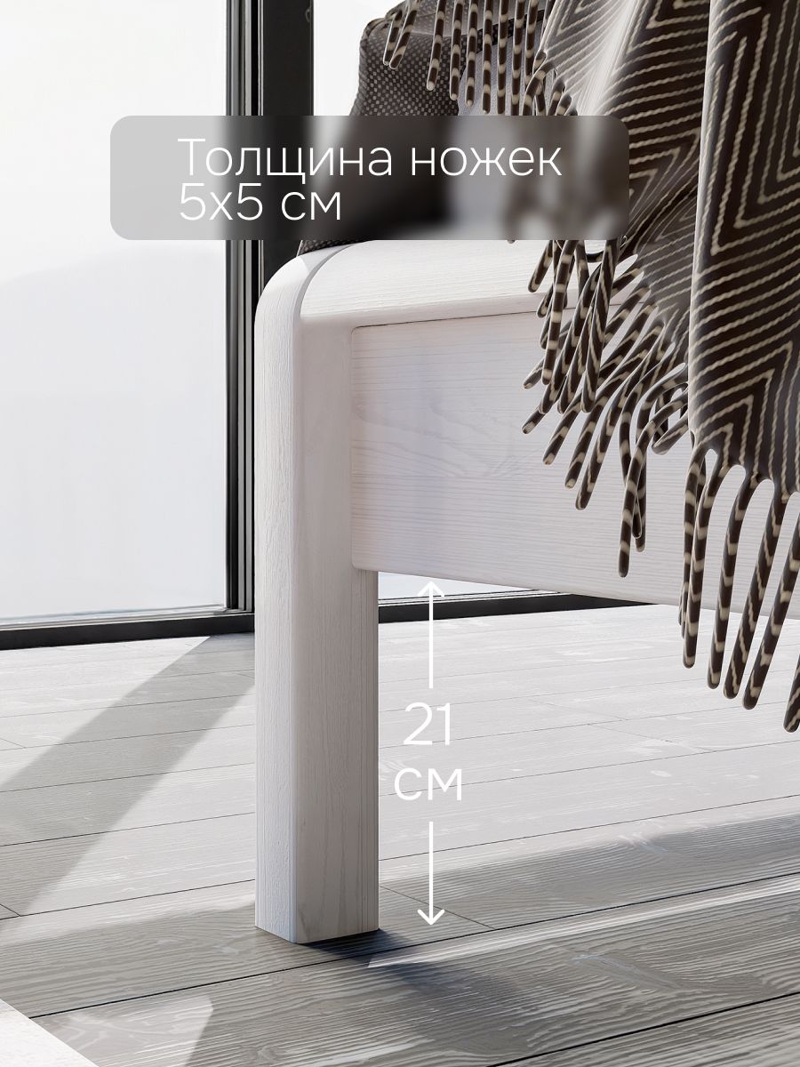 Кровать двуспальная Мадейра размером 160х200 см из массива сосны — идеальный выбор для тех, кто ценит натуральные материалы и современный дизайн. Кровать выполнена в белом цвете, покрыта натуральным воском, идеально дополняя интерьер вашей спальни или детской. Кровать серии Мадейра отличается особенной прочностью и долговечностью благодаря использованию высококачественных материалов. Эта двухспальная кровать имеет просторное спальное место размером 160х200 см, что обеспечивает максимальный комфорт и удобство во время сна. Она идеально подойдет для тех, кто ищет стильную кровать в натуральном и экологичном исполнении.В конструкции кровати используется прочное основание, которое надежно поддерживает матрас и способствует правильному распределению веса, предотвращая деформацию матраса.Особенности двуспальной кровати Мадейра:- Размер спального места: 160х200 см- Материал: массив сосны в натуральной отделке (белый воск)- Прочное и надежное основание из сосны 80х200 см - 2 штЭта деревянная кровать станет великолепным дополнением любого интерьера, будь то классический, скандинавский или стиль лофт. Она легко собирается и будет служить вам долгие годы благодаря прочному деревянному каркасу.Если вы ищете белую двуспальную кровать 160х200, которая будет отличаться высокой прочностью и экологичностью, кровать Мадейра — это идеальный выбор. Она объединяет в себе функциональность, стиль и природную красоту натурального дерева.Кровать Мадейра идеально подойдет для творческих людей, которые желают создать уникальный дизайн своей спальни. Удобная и прочная кровать из дерева подойдет для комнаты в стиле лофт, сканди, ретро. Спинка кровати позволит легко и надежно зафиксировать мягкое изголовье.Кровать легко собирается. Отличается легкостью в уходе. Дополнительную прочность и жесткость конструкции придает перфорированная лента под настилом. Поставляется без матраса и без текстиля, реечное дно без ножек (сечение реек 90х14). Ножки кровати закруглены, сечение ножек 50х50 мм.Кровать двуспальная Мадейра 160х200 см из массива сосны – это гармония простоты и элегантности, которая создаст идеальные условия для вашего комфортного сна.