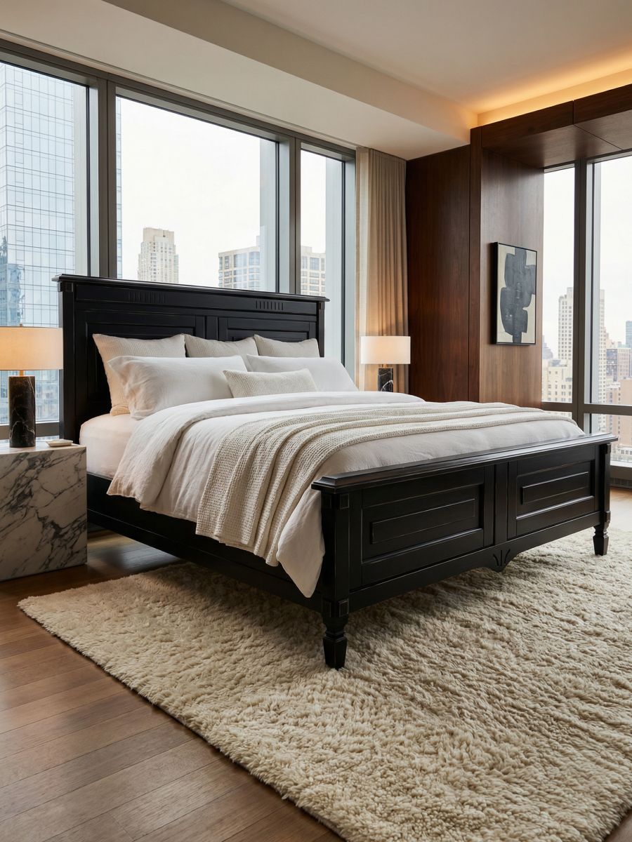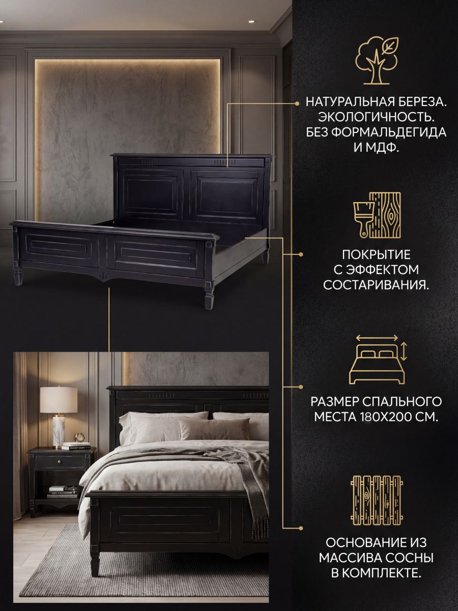 Эта двуспальная кровать выполнена из натурального массива берёзы с эмалевым покрытием, что гарантирует долговечность и экологичность. Чёрный цвет придаёт изделию стильный, современный вид, идеально сочетающийся с любыми интерьерами. Прочная деревянная конструкция с ножками и реечным основанием обеспечивает надежную опору для матраса любого типа.