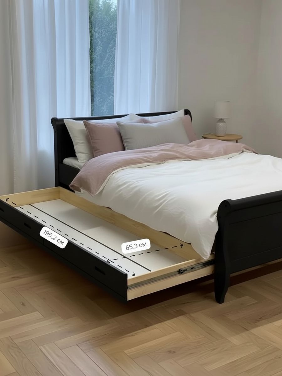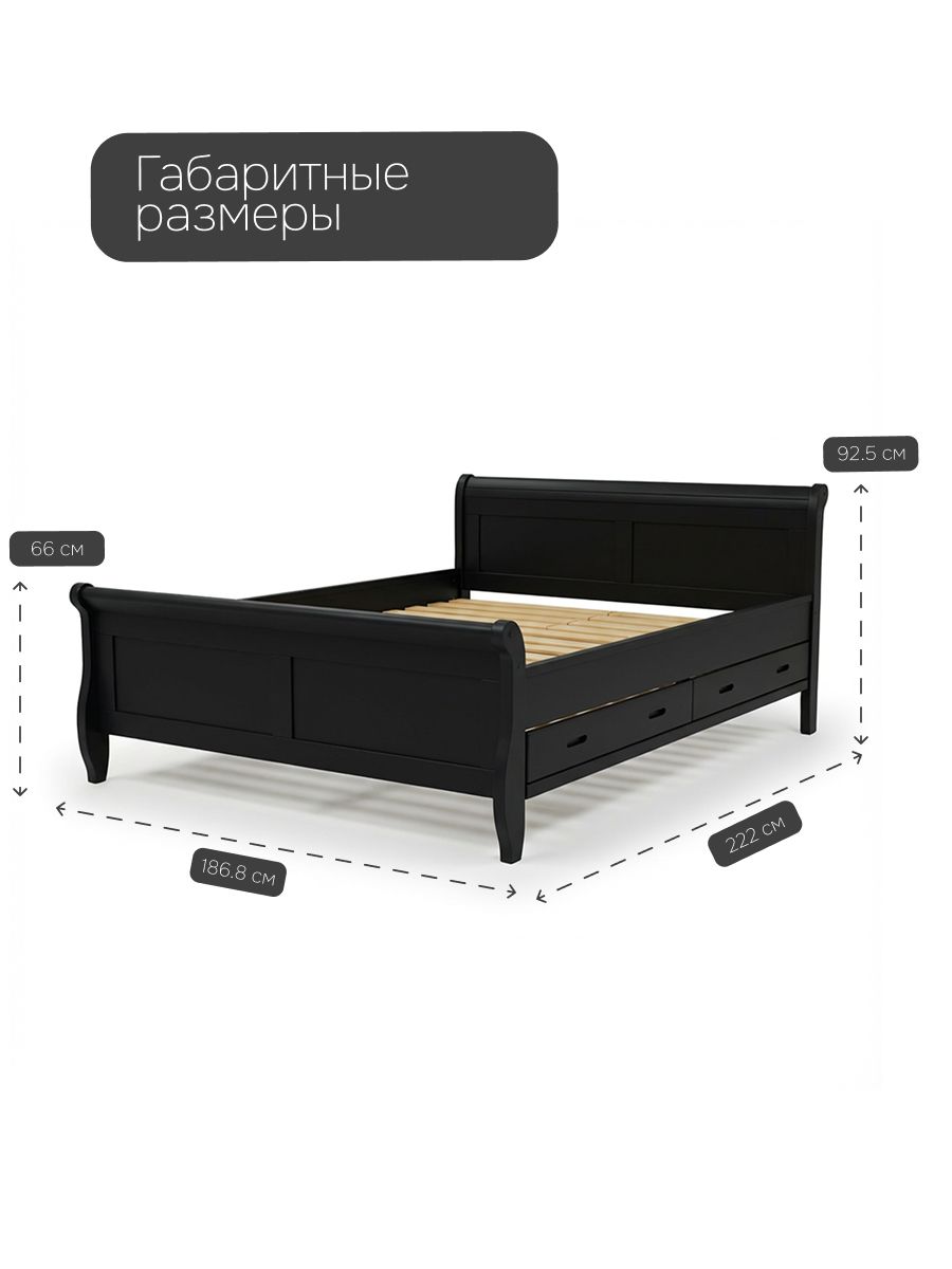Выполненная в классическом стиле "сани" (sleigh bed), она очаровывает плавными, закругленными линиями изголовья и изножья, напоминающими изящные очертания старинных саней. Этот традиционный дизайн сочетает в себе утонченную элегантность французского провинциального стиля с современной функциональностью, идеально вписываясь в интерьеры от классики до минимализма. Черный цвет, нанесенный экологичными красками, подчеркивает натуральную текстуру дерева, создавая ощущение глубины и роскоши, которое так манит прикоснуться.