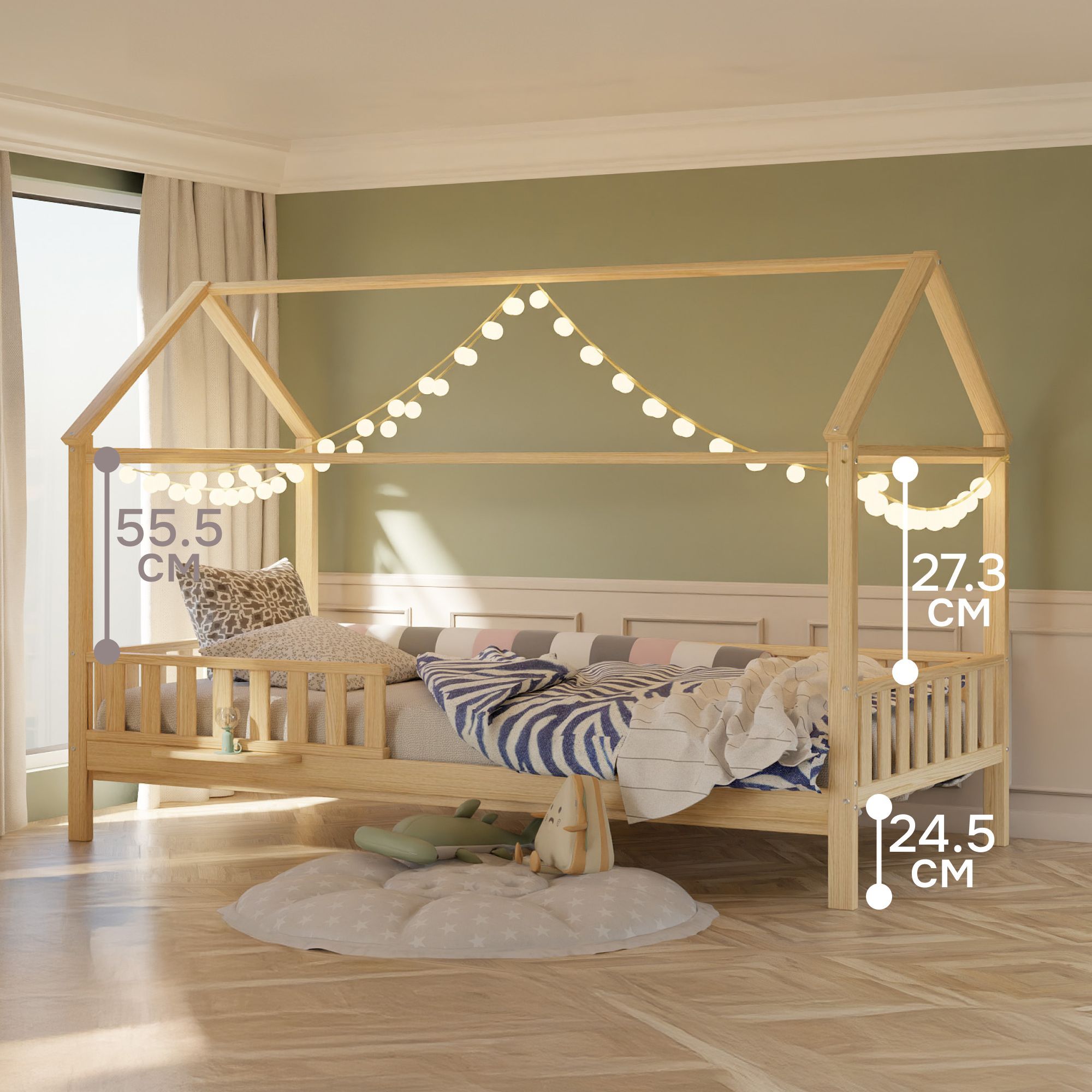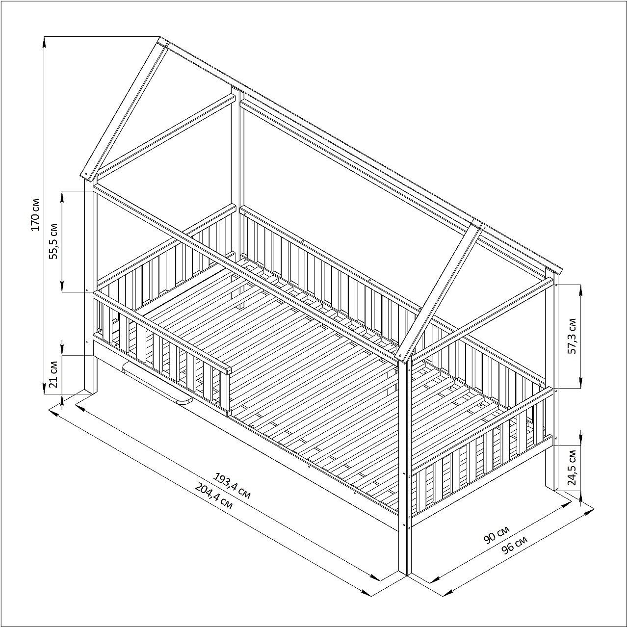 К детской кровати-домику можно дополнительно установить балдахин, оборудовать подсветкой и украсить по своему усмотрению. Размеры кровати в собранном виде – высота – 170 см, ширина – 204,4 см, глубина – 96 см. В комплектации 1 полка съемная - крепиться к царге, к стене не крепится, борт-решетка переставная (установка на левую или правую сторону), в сборе идут борт-решетка задняя, боковая, и передняя съемная, а также настил, сечение ног 5x5 см, высота до царги 21 см.