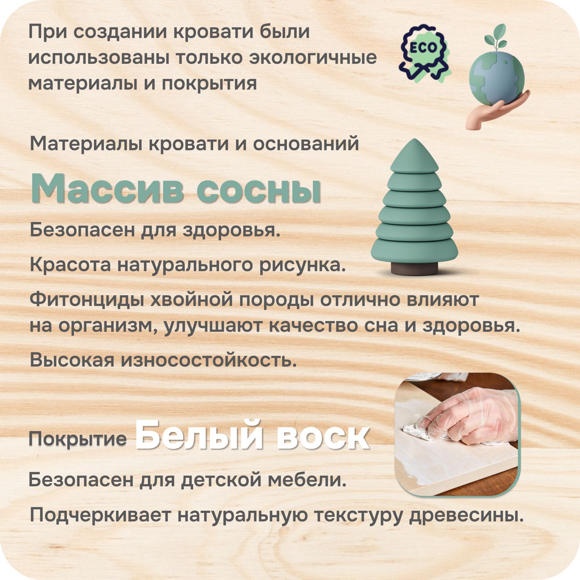 Кровать создана из натурального материала - массива сосны - экологически чистого и устойчивого к внешним воздействиям. Отделка товара - белый укрывистый воск, а это означает, что покрытие будет плотным, в то же время хорошо сохраняя полезные качества дерева. Данный вид покрытия относится к натуральным на водной основе и соответствует всем требованиям экологичности. Внешний вид изделия кровать деревянная 90х200 и тонкий, едва уловимый, запах сосны создадут ощущения тепла и комфорта.