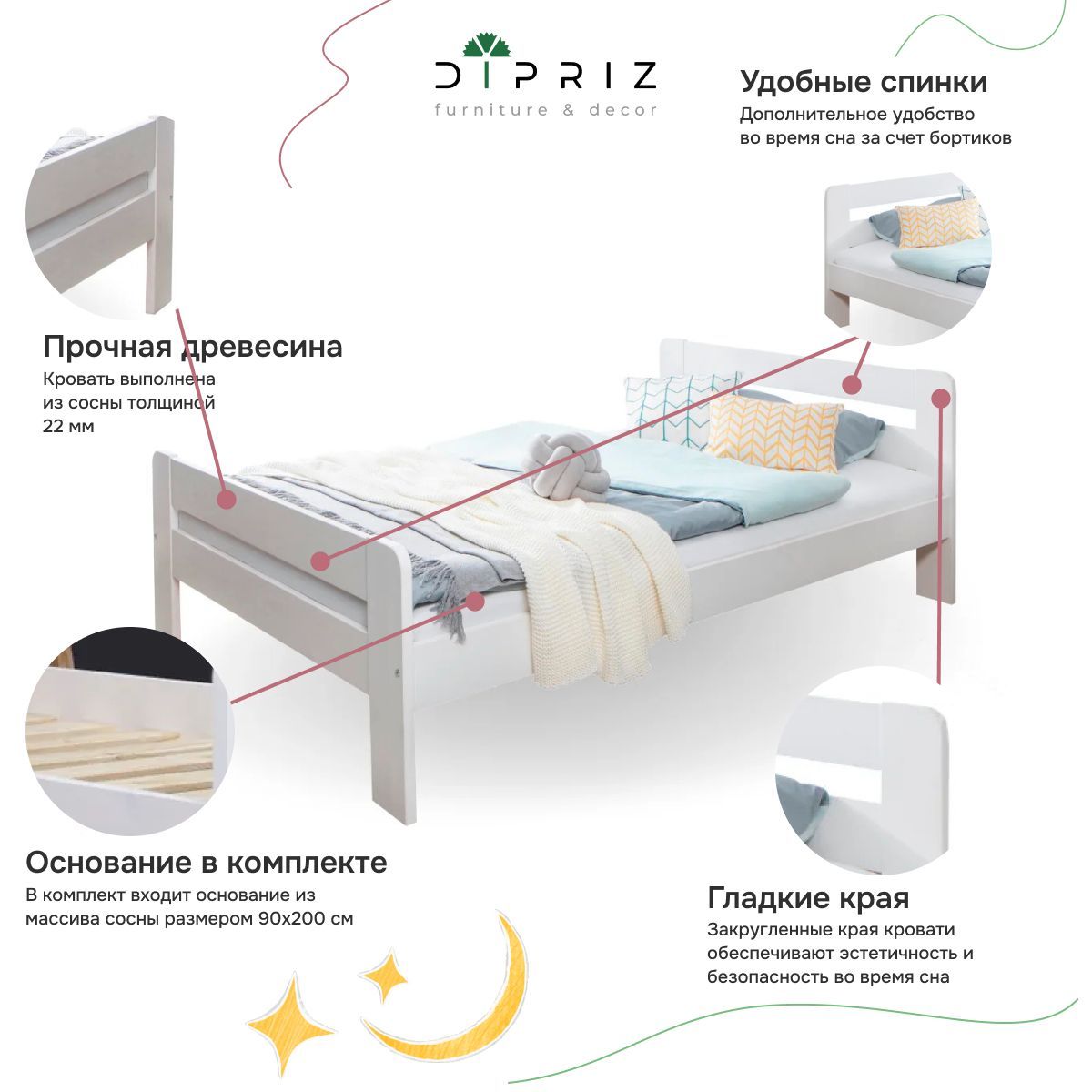 Уютная кровать односпальная 90х200 от белорусского производителя мебели dipriz (размер спального места 90х200) изготовлена из массива сосны. Наша кровать 90х200 сделает Ваш сон крепким, а отдых - безмятежным.