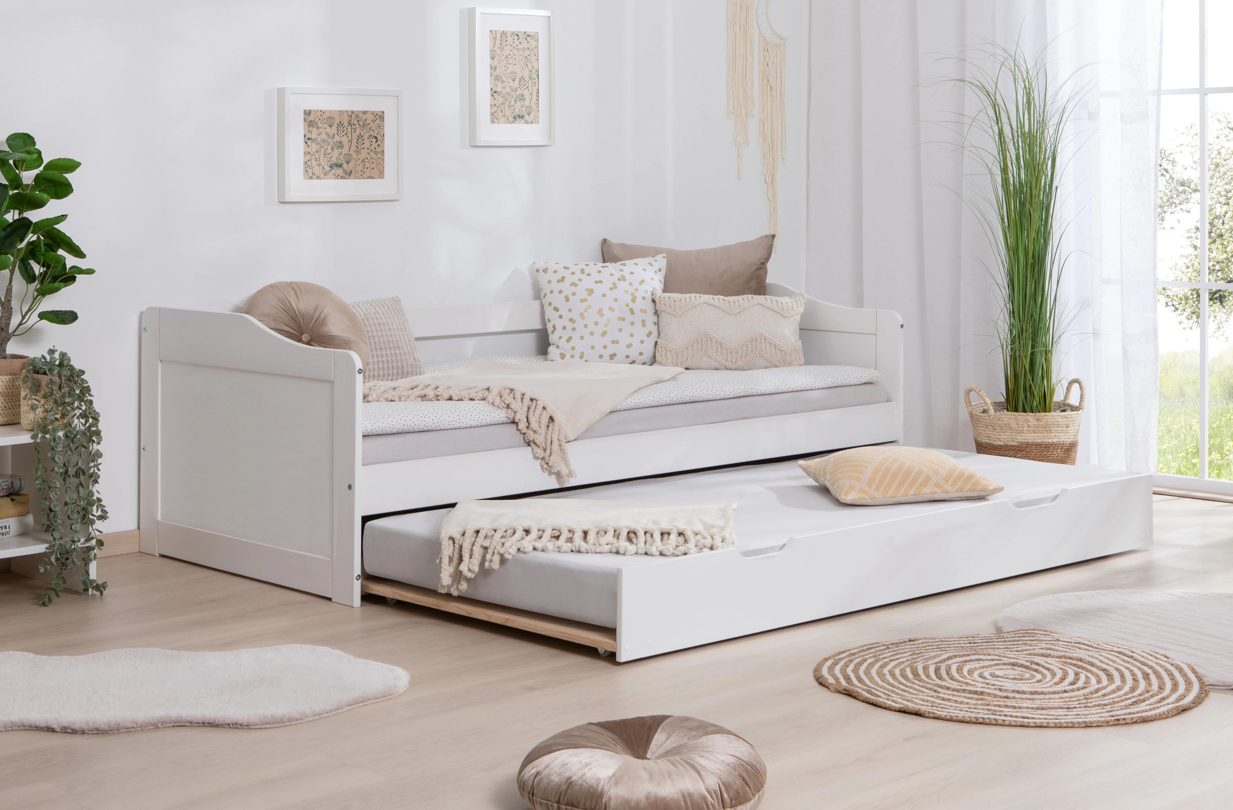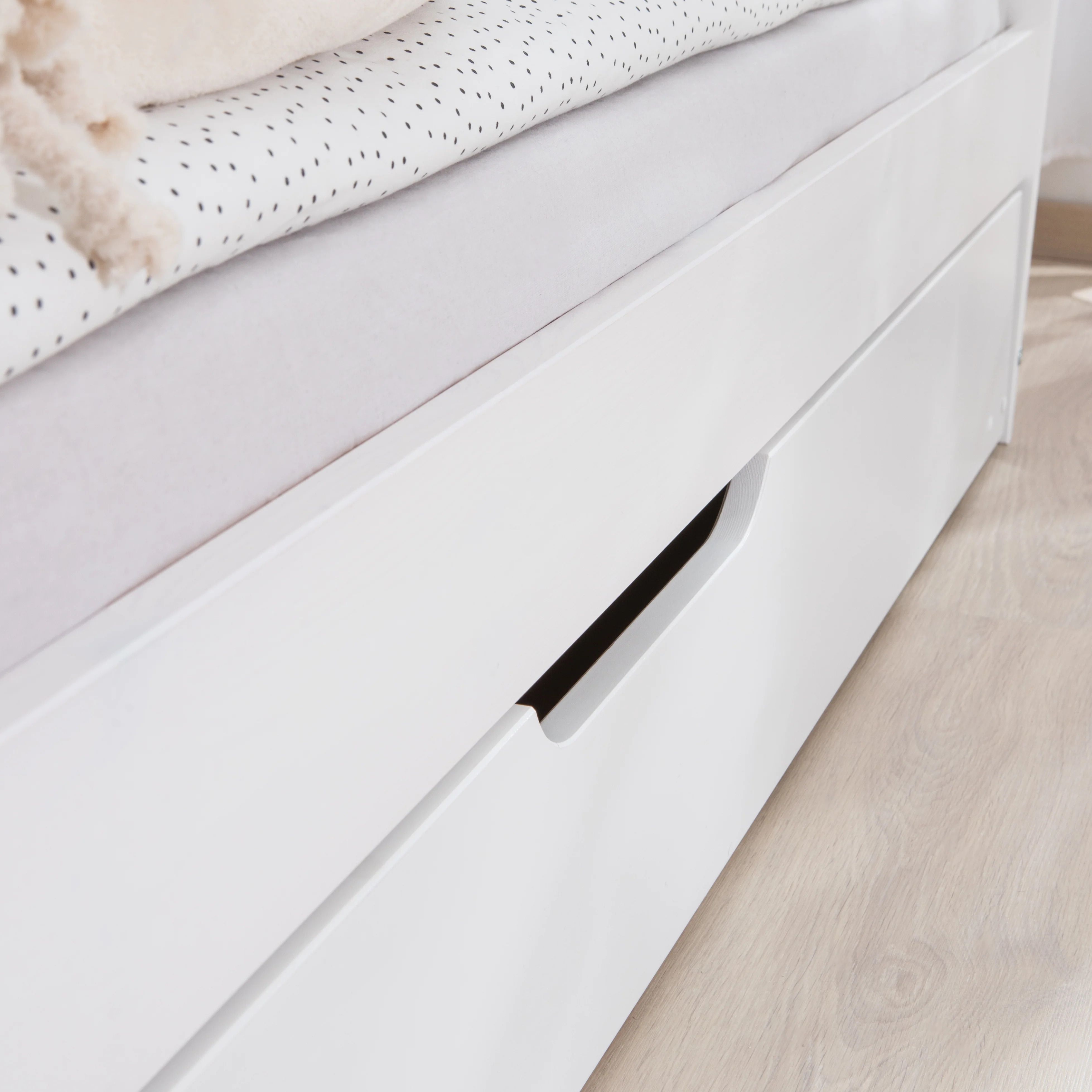 Два спальных места размерами 90х200 см обеспечат удобное размещение для взрослых и детей. Деревянные основания 90х200 см под каждое спальное место изготовлены из массива сосны. Выдвижной ящик на колесиках дополнен удобными ручками. Максимальная допустимая нагрузка на спальное место составляет до 150 кг, что позволяет легко использовать ее для двух человек.
