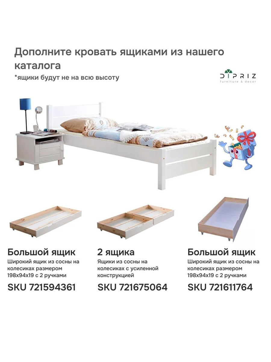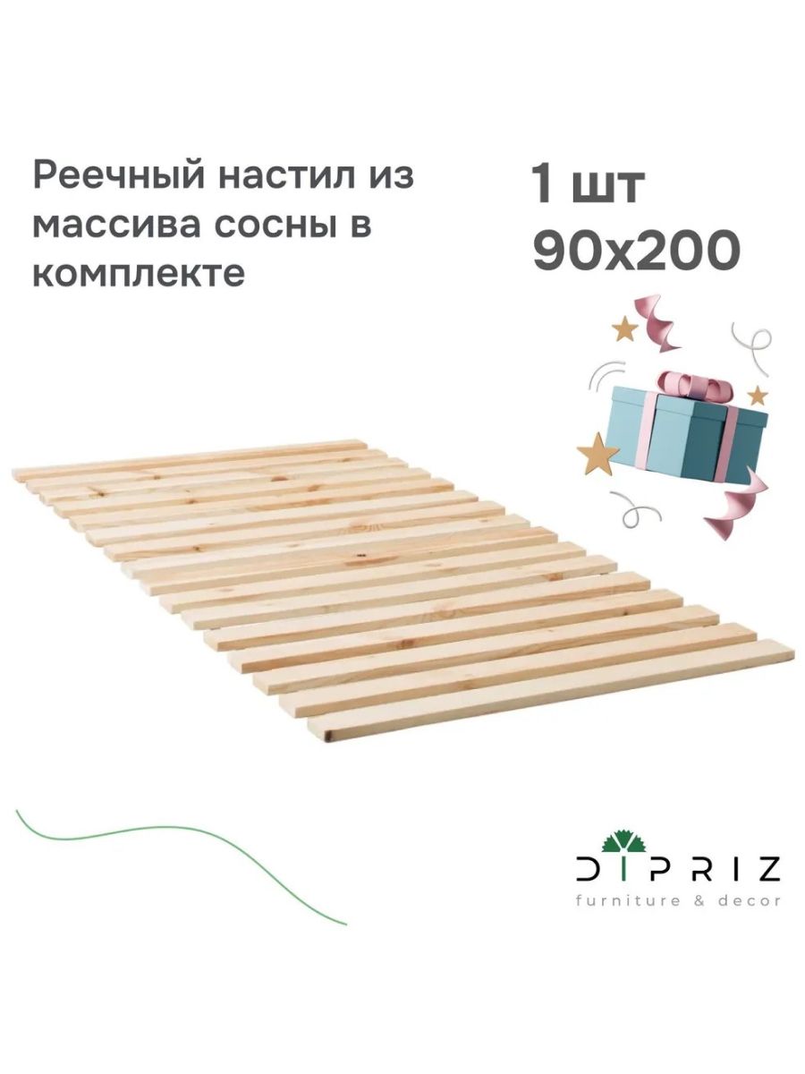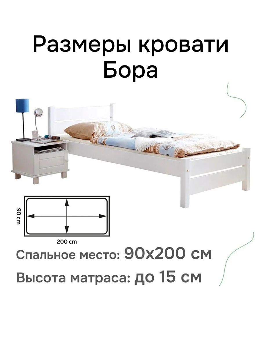 Габариты деревянной кровати: длина - 210 см, ширина - 97,2 см, высота от пола до верха спинки - 72,5 см, высота от пола до низа царги - 26,5 см. Максимально допустимая нагрузка - до 150 кг. Кровать односпальная 90х200 укомплектована реечным основанием 90х200 см из массива сосны, матрас и текстиль докупаются отдельно.
