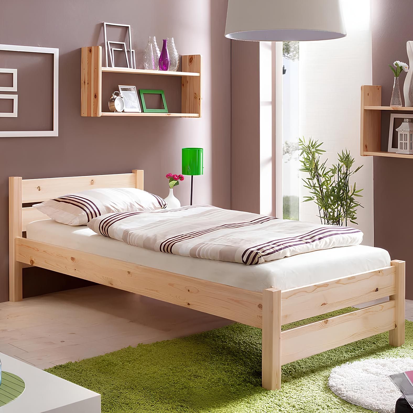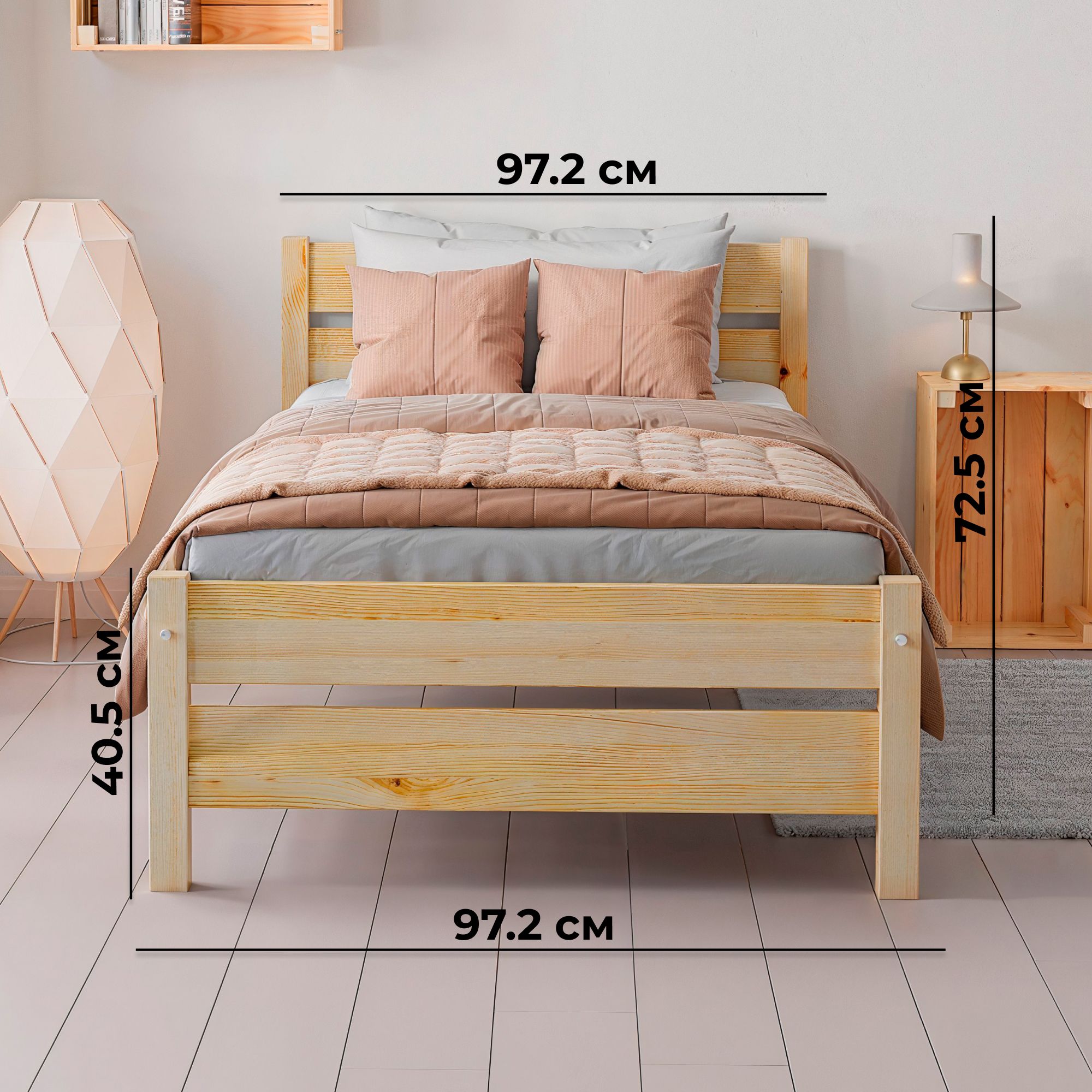 Габариты деревянной кровати: длина - 210 см, ширина - 97,2 см, высота от пола до верха спинки - 72,5 см, высота от пола до низа царги - 26,5 см. Максимально допустимая нагрузка - до 150 кг. Кровать 90*200 укомплектована реечным основанием 90х200 см из массива сосны, матрас и текстиль докупаются отдельно.