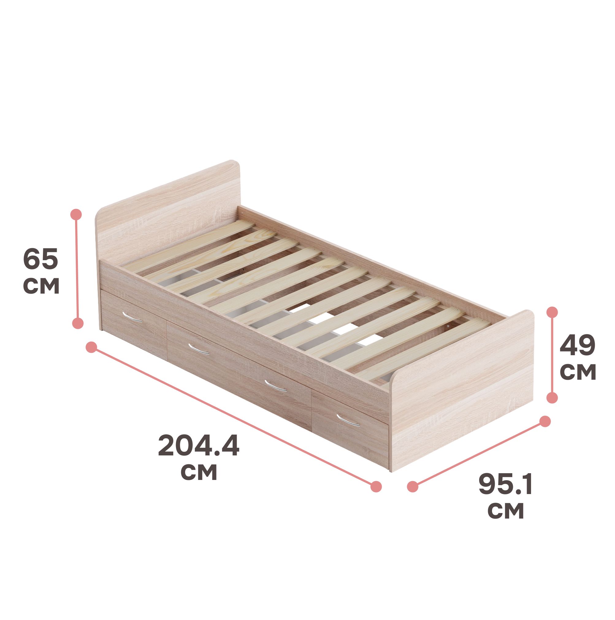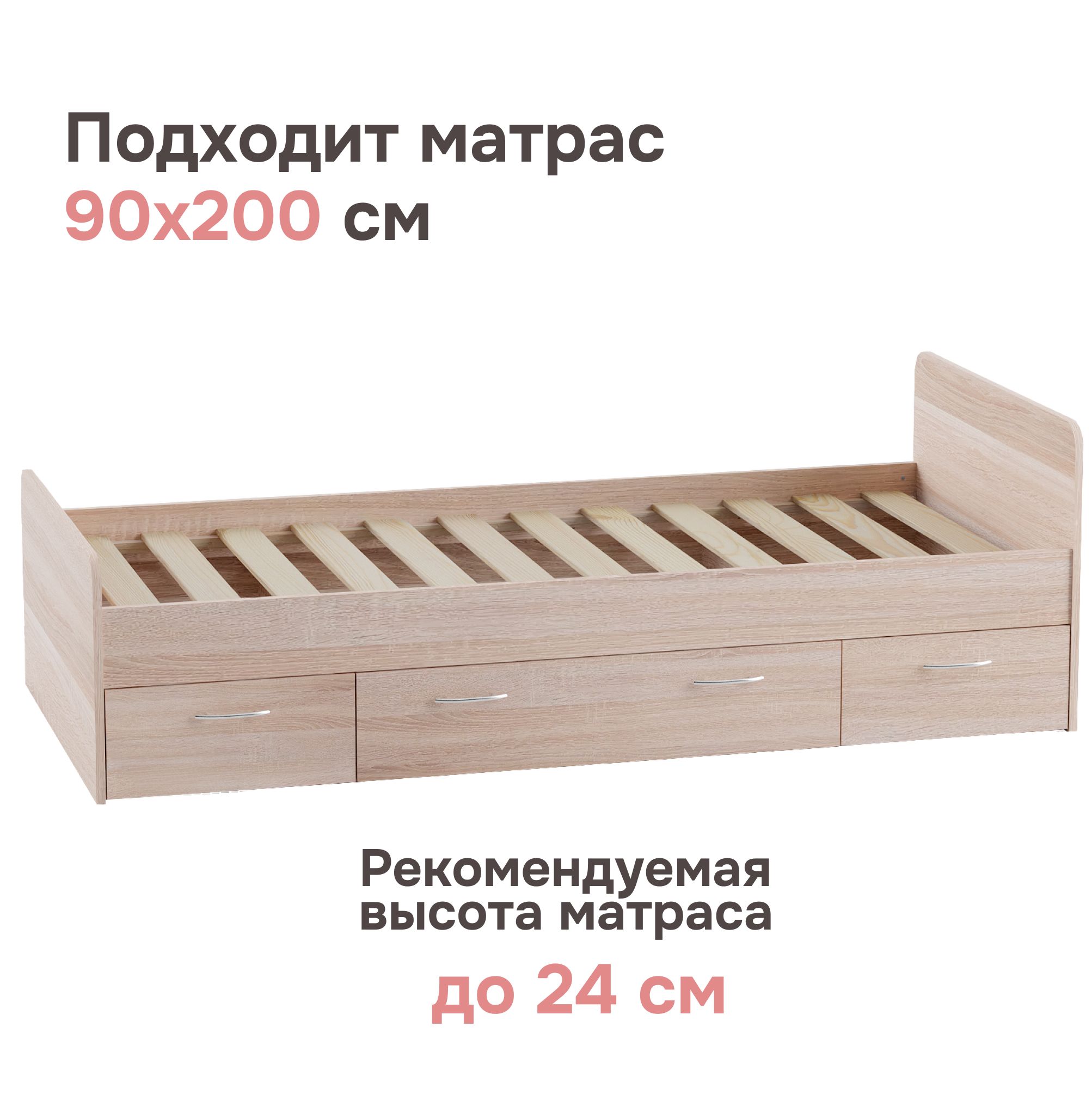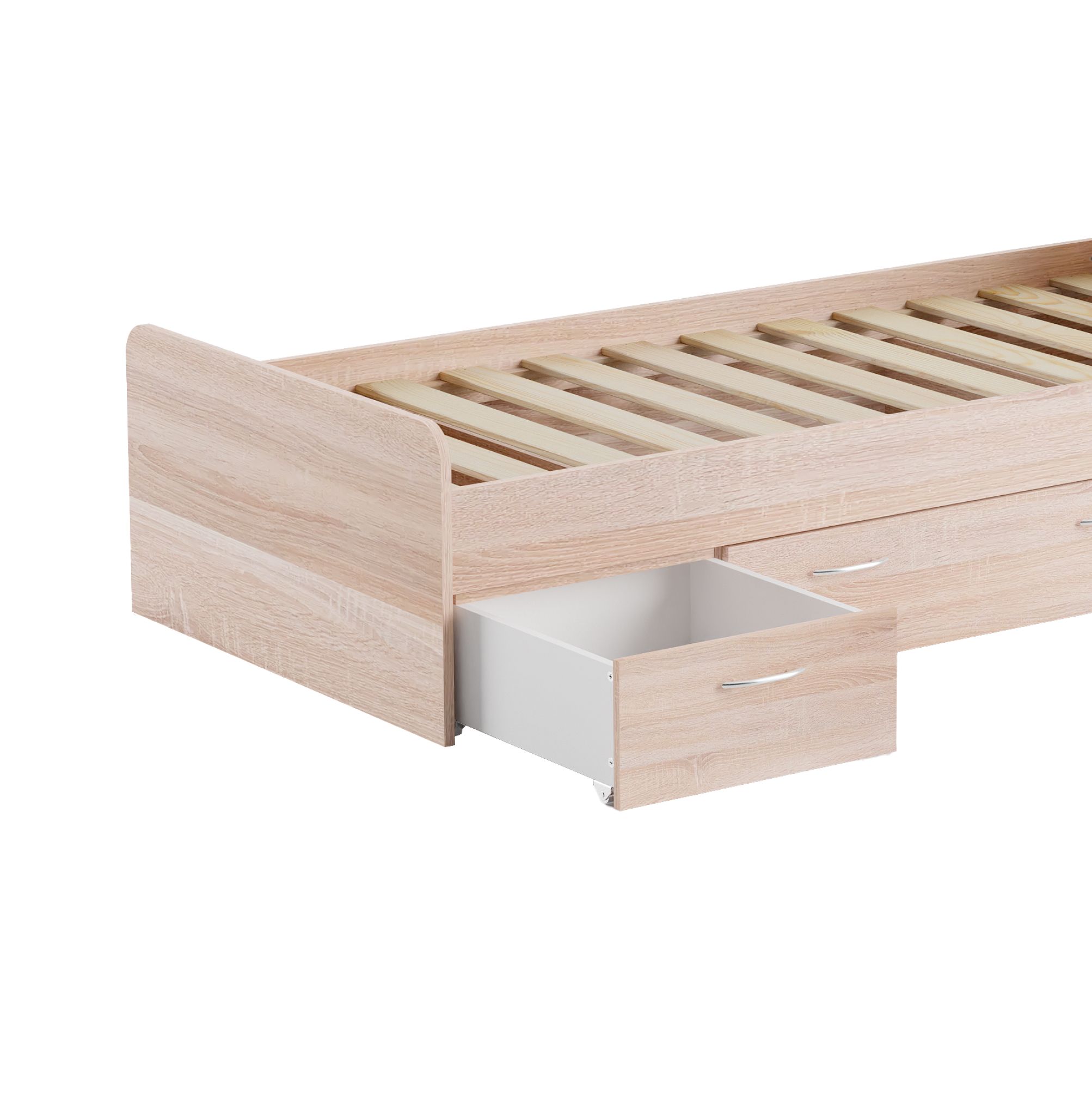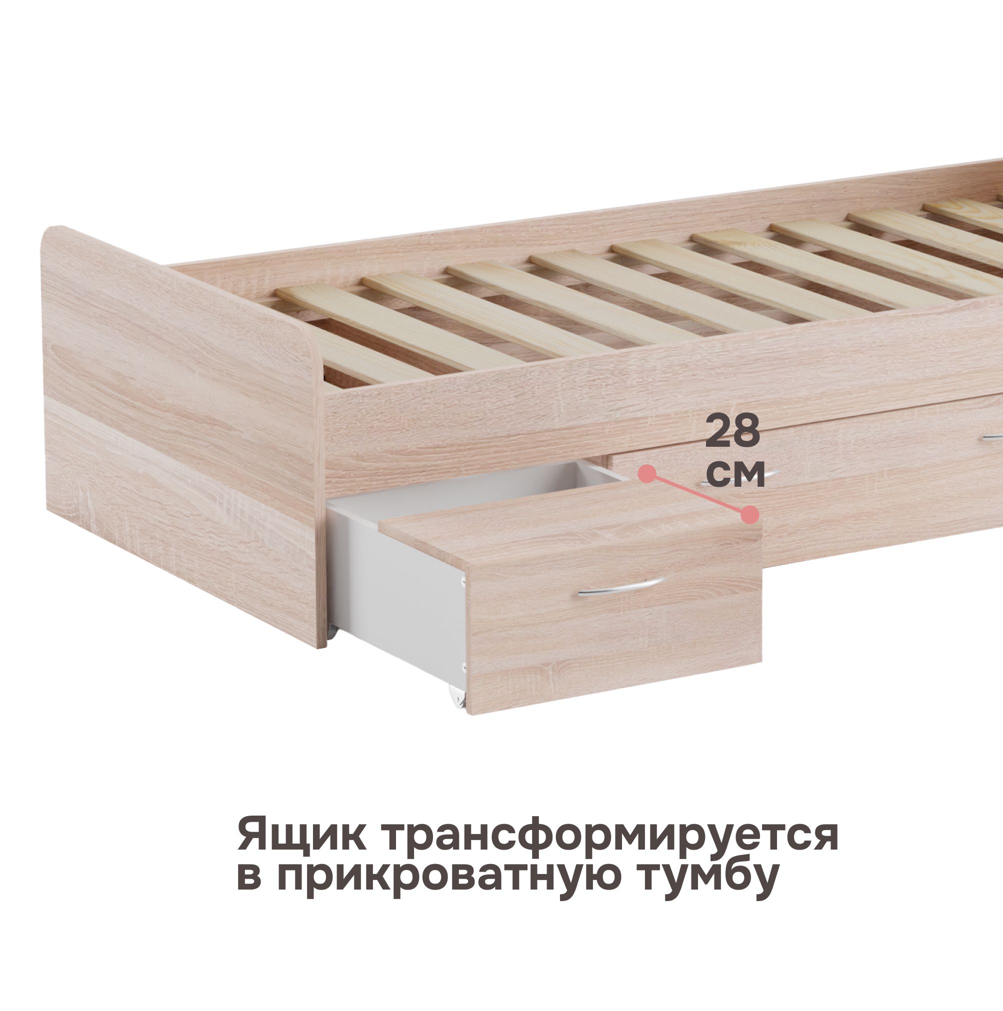 Основание кровати уже предоставлено, поэтому вам нужно лишь подобрать подходящий матрас, чтобы создать идеальное место для засыпания. Однако, что делает эту кровать по-настоящему уникальной, так это наличие трех выдвижных ящиков на колесиках. Среди них два небольших и один просторный, обеспечивая дополнительное место для хранения различных вещей, начиная от постельного белья и заканчивая игрушками и одеждой.