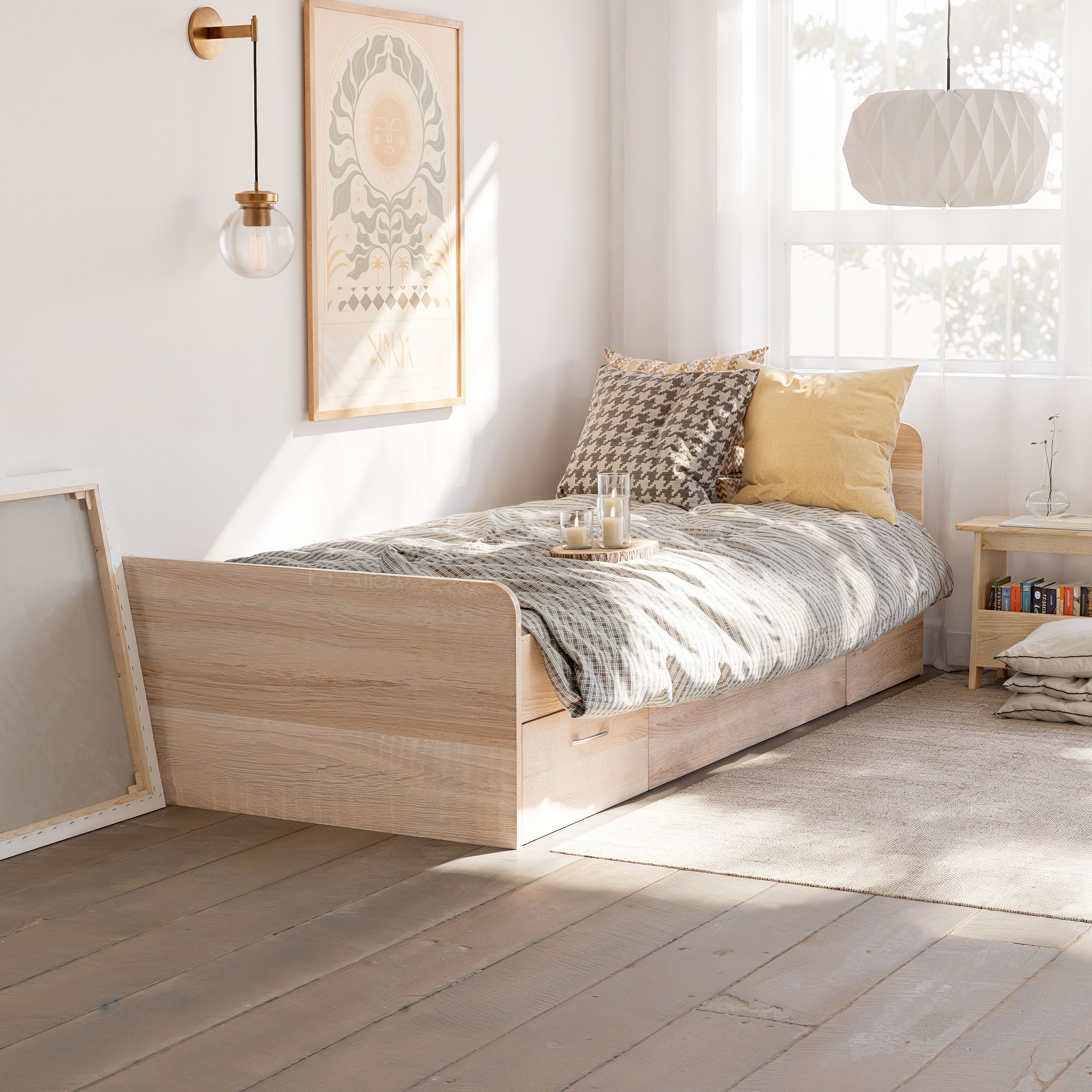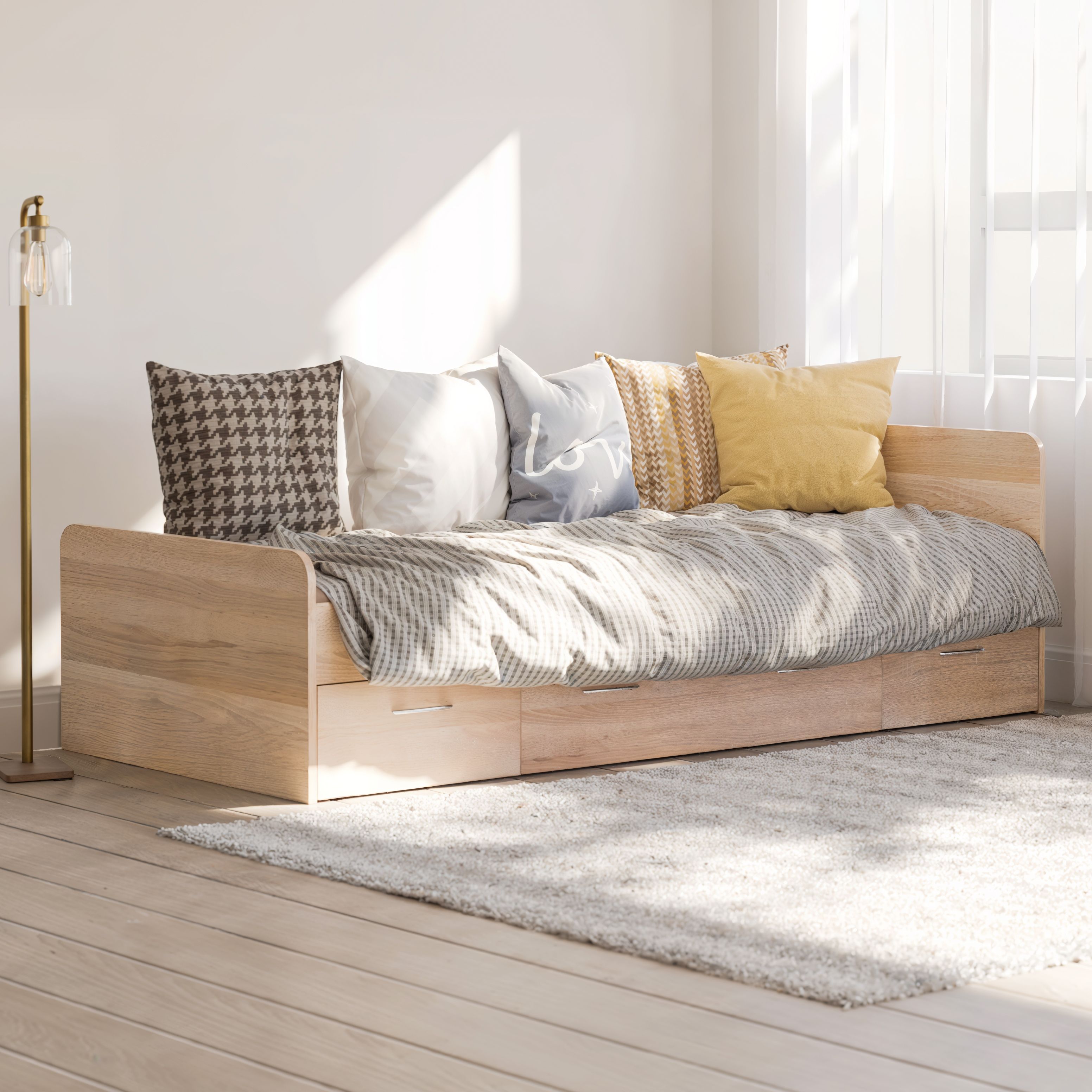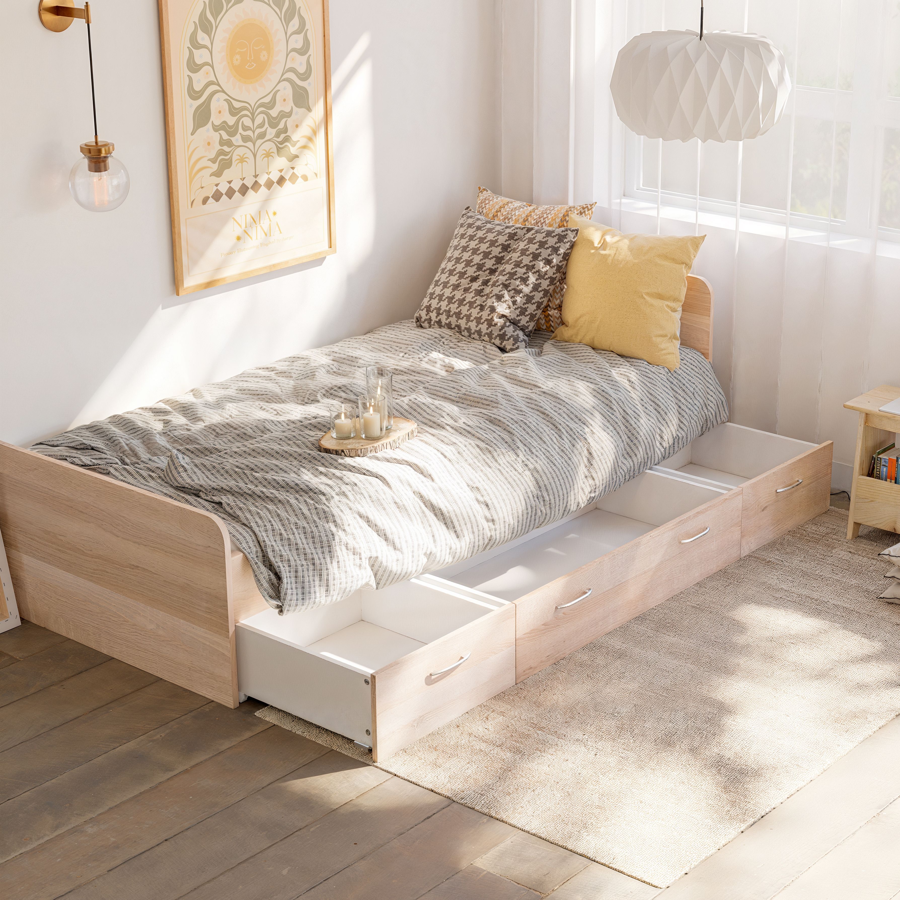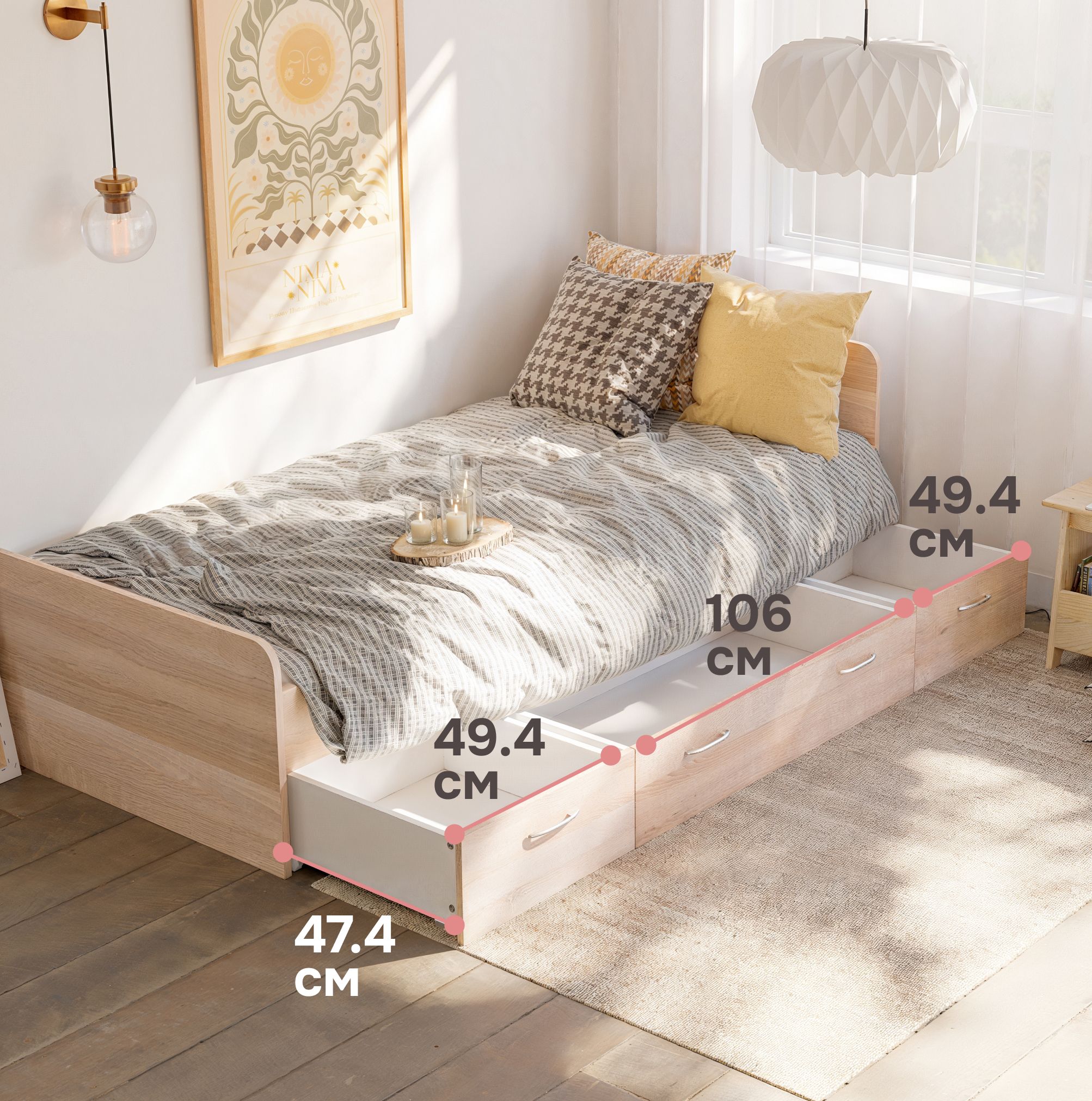 Основание кровати уже предоставлено, поэтому вам нужно лишь подобрать подходящий матрас, чтобы создать идеальное место для засыпания. Однако, что делает эту кровать по-настоящему уникальной, так это наличие трех выдвижных ящиков на колесиках. Среди них два небольших и один просторный, обеспечивая дополнительное место для хранения различных вещей, начиная от постельного белья и заканчивая игрушками и одеждой.