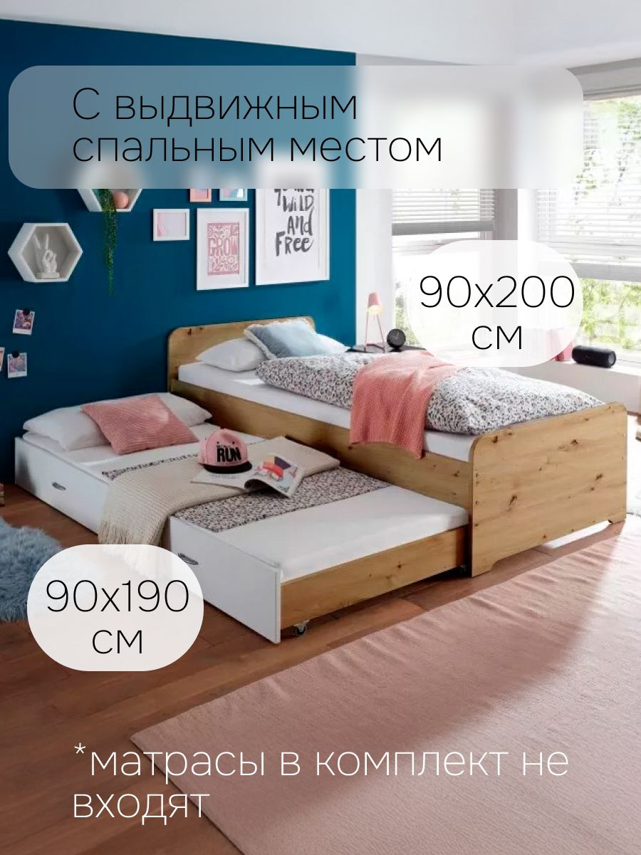 Конструкция кровати включает в себя основной каркас со спальным местом 90х200 см, с выдвижным спальным местом размером 90х190 см и 2 настила из массива сосны под каждое спальное место.