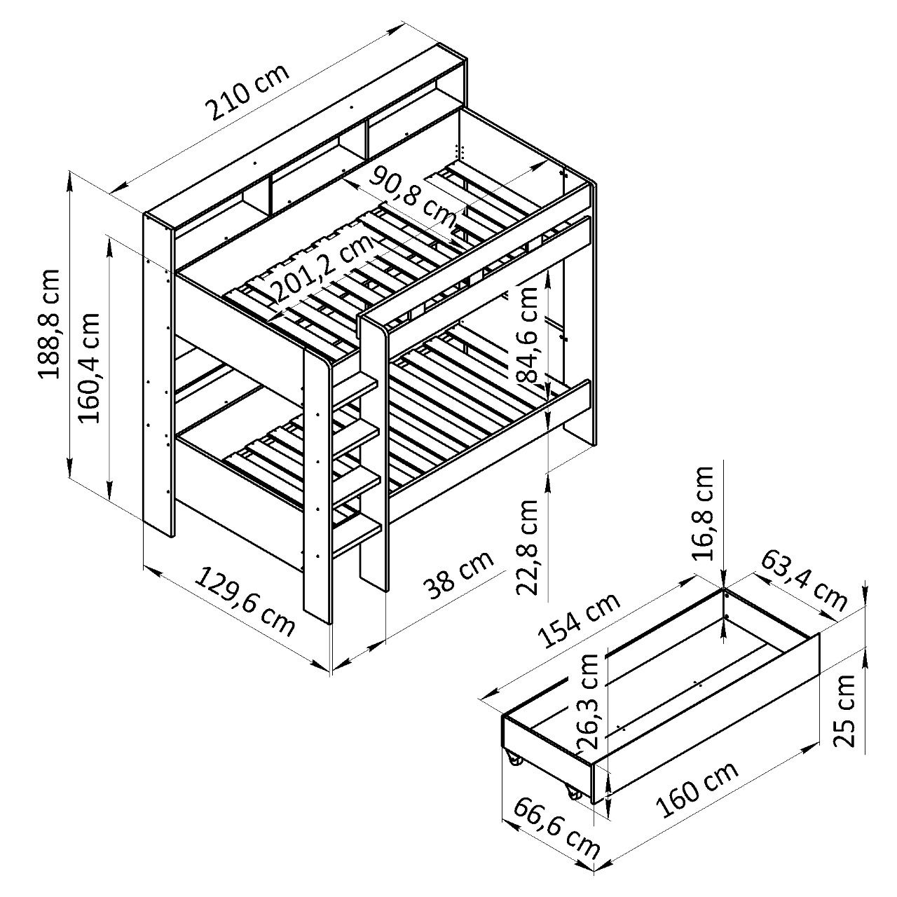 Чудо экономии места – с двумя спальными местами 90 x 200 см кровать предлагает достаточно места для сна и отдыха для 2 человек. Экономия места и функциональная двухъярусная кровать в ограниченном пространстве.