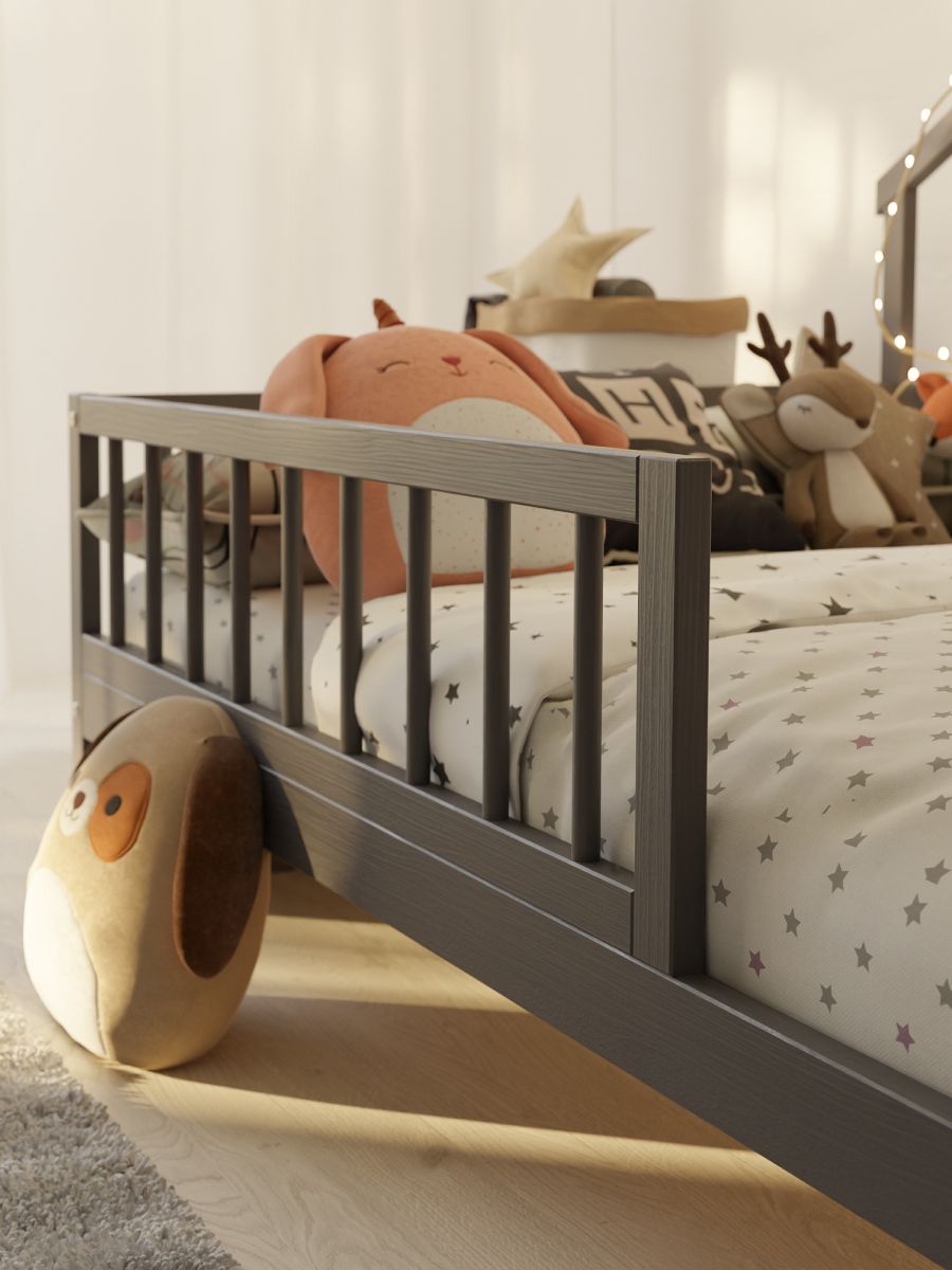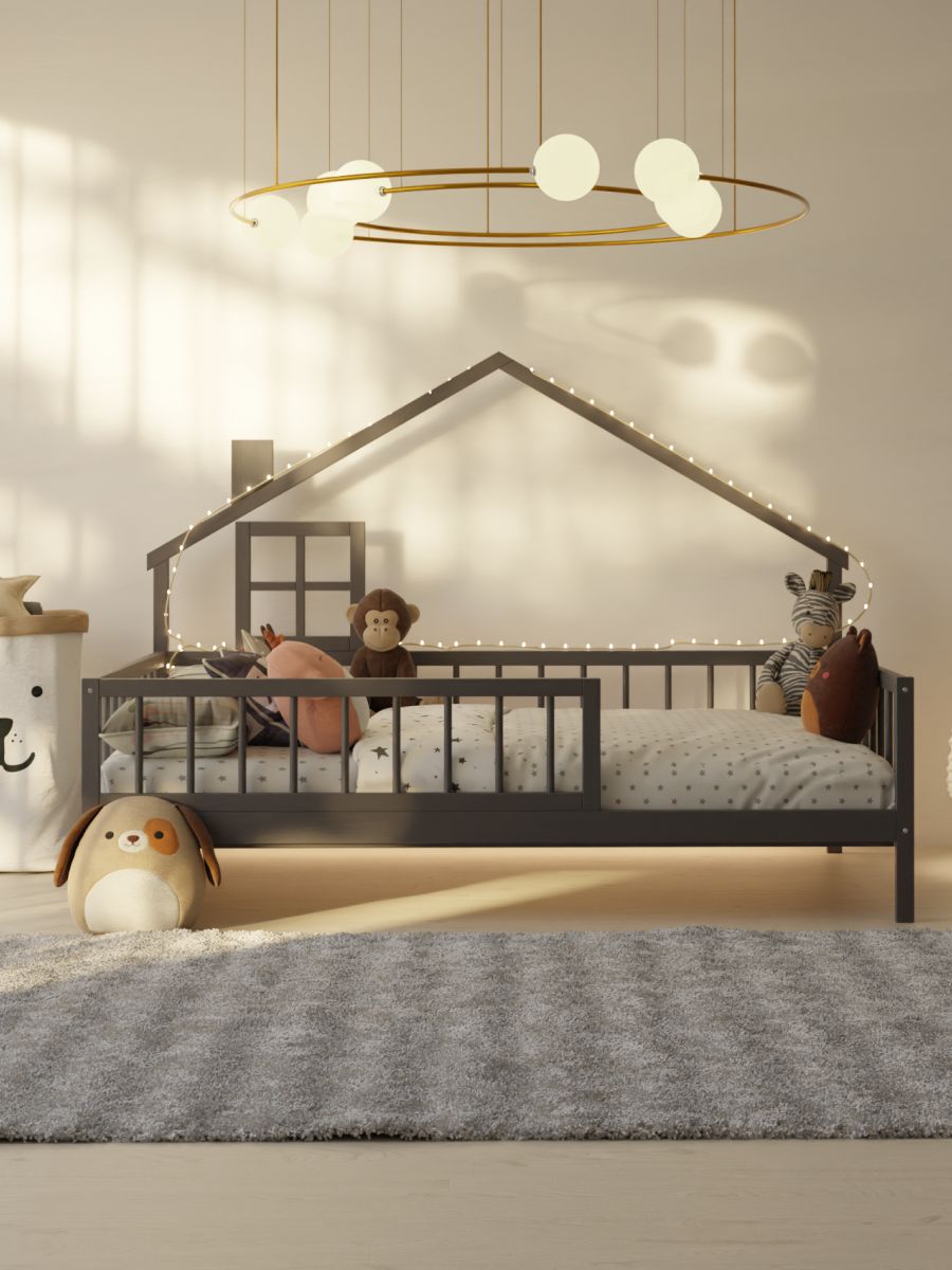Детская кровать-домик Локи от белорусского производителя ООО "Диприз" в Скандинавском стиле в сером цвете. Кровать из массива сосны создаст уютную, творческую обстановку в комнате вашего ребенка. Уникальной особенностью кровати является наличие невысоких ножек, которые предотвращают шанс возможного травмирования. К детской кровати-домику можно дополнительно установить балдахин, оборудовать подсветкой и украсить по своему усмотрению. Кровать с бортиками безопасности. Необычный дизайн и натуральные материалы позволят дополнить детскую комнату и создать приятную атмосферу. В процессе производства использовались только качественные безопасные материалы и покрытия. Благодаря своей конструкции кровать прочная, не скрипит, и легко выдерживает даже взрослого человека. Размер спального места – 90х200.