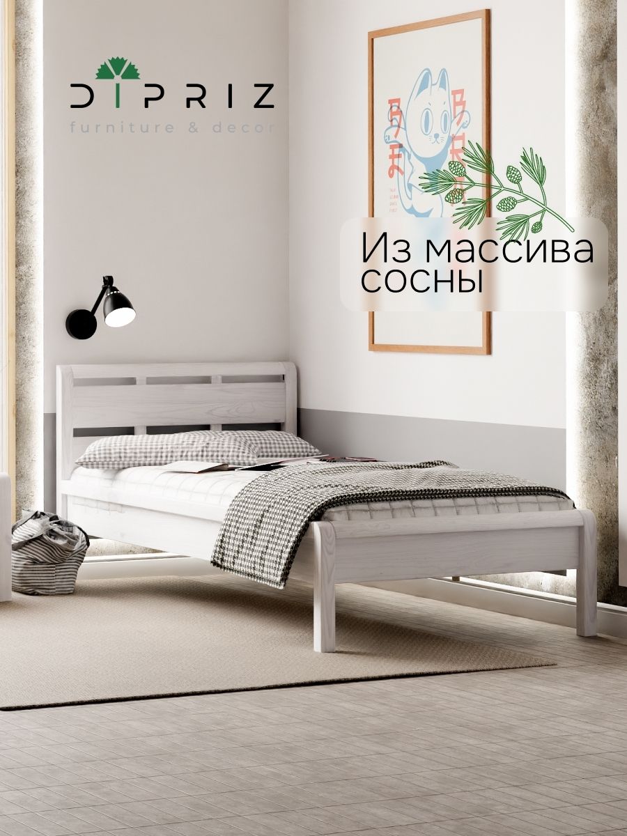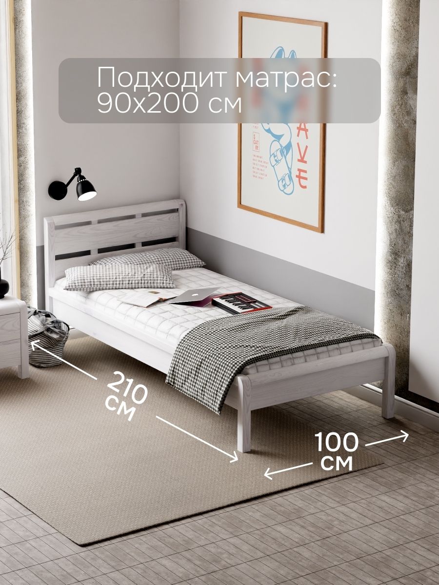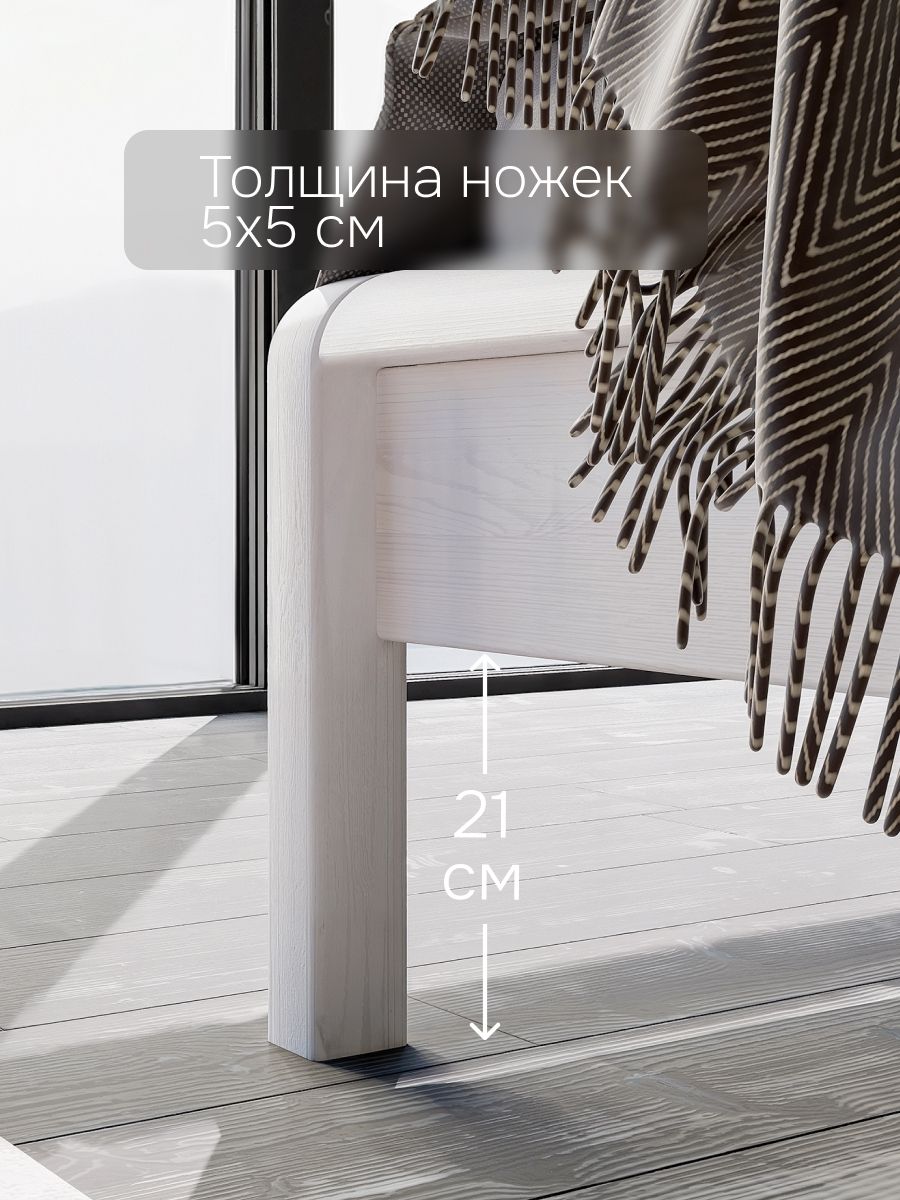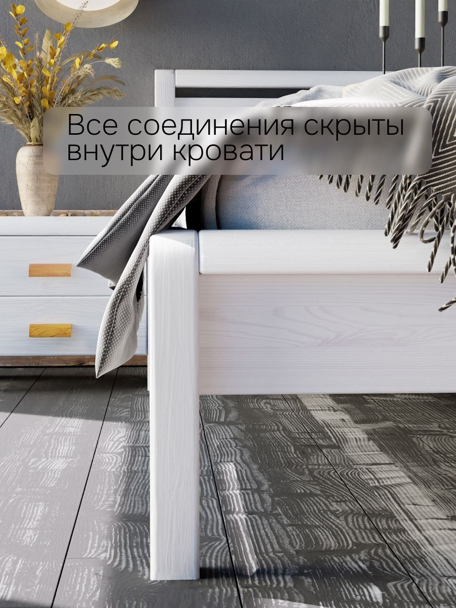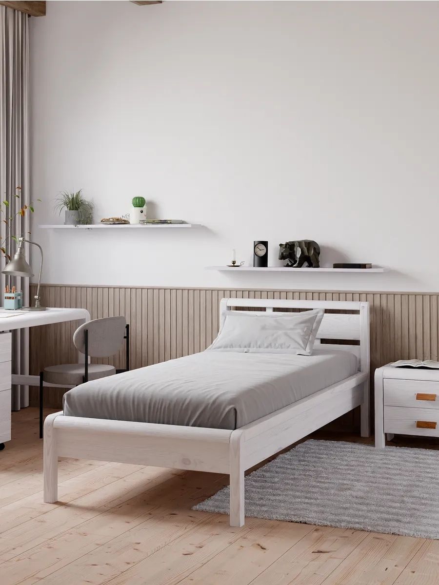 Кровать односпальная Мадейра размером 90х200 см из массива сосны — идеальный выбор для тех, кто ценит натуральные материалы и современный дизайн. Кровать выполнена в белом цвете, покрыта натуральным воском, идеально дополняя интерьер вашей спальни или детской. Кровать серии Мадейра отличается особенной прочностью и долговечностью благодаря использованию высококачественных материалов.Эта односпальная кровать имеет просторное спальное место размером 90х200 см, что обеспечивает максимальный комфорт и удобство во время сна. Она идеально подойдет для тех, кто ищет стильную кровать в натуральном и экологичном исполнении.В конструкции кровати используется прочное основание, которое надежно поддерживает матрас и способствует правильному распределению веса, предотвращая деформацию матраса.Особенности односпальной кровати Мадейра:- Размер спального места: 90х200 см- Материал: массив сосны в натуральной отделке (белый воск)- Прочное и надежное основание из сосны 90х200 смЭта деревянная кровать станет великолепным дополнением любого интерьера, будь то классический, скандинавский или стиль лофт. Она легко собирается и будет служить вам долгие годы благодаря прочному деревянному каркасу.Если вы ищете белую односпальную кровать 90х200, которая будет отличаться повышенной прочностью и экологичностью, кровать Мадейра — это идеальный выбор. Она объединяет в себе функциональность, стиль и природную красоту натурального дерева.Кровать детская Мадейра идеально подойдет для творческих людей, которые желают создать уникальный дизайн своей спальни. Удобная и прочная кровать из дерева подойдет для комнаты в стиле лофт, сканди, ретро. Спинка кровати позволит легко и надежно зафиксировать мягкое изголовье.Кровать легко собирается. Отличается легкостью в уходе. Дополнительную прочность и жесткость конструкции придает перфорированная лента под настилом. Поставляется без матраса и без текстиля, реечное дно без ножек (сечение реек 90х14). Ножки кровати закруглены, сечение ножек 50х50 мм.Кровать односпальная Мадейра 90х200 см из массива сосны – это гармония простоты и элегантности, которая создаст идеальные условия для вашего комфортного сна.