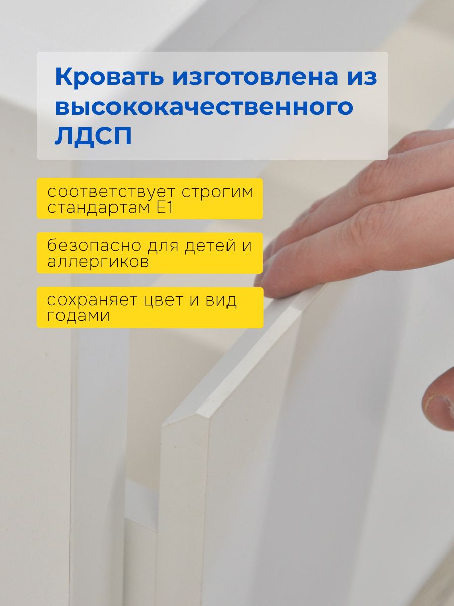 - Экологически чистые материалы: Кровать изготовлена из высококачественного ЛДСП — безопасного материала, не содержащего вредных веществ. Это долговечное и экологичное решение, которое идеально подойдет для детских и взрослых спален, заботясь о здоровье всей семьи.