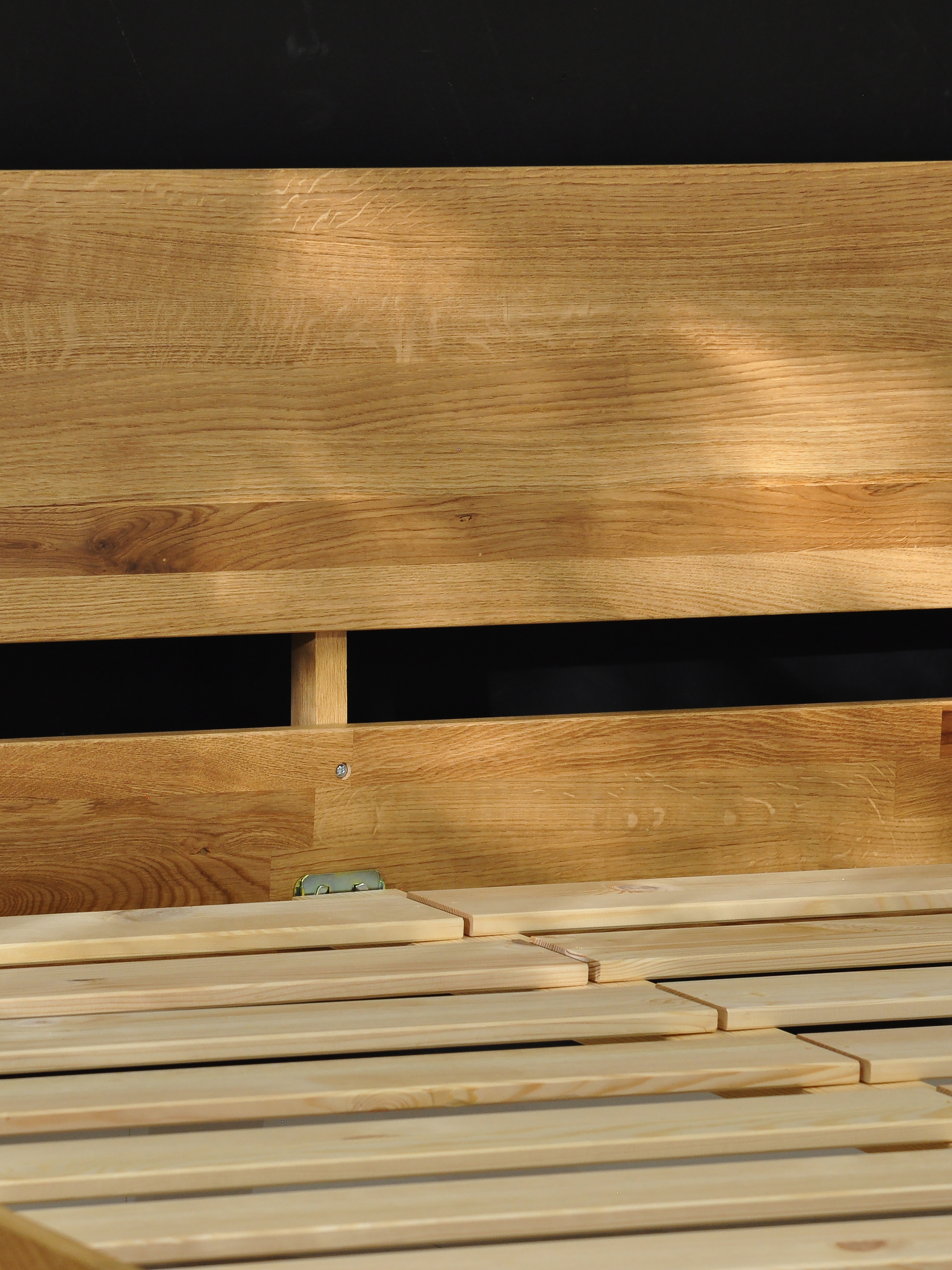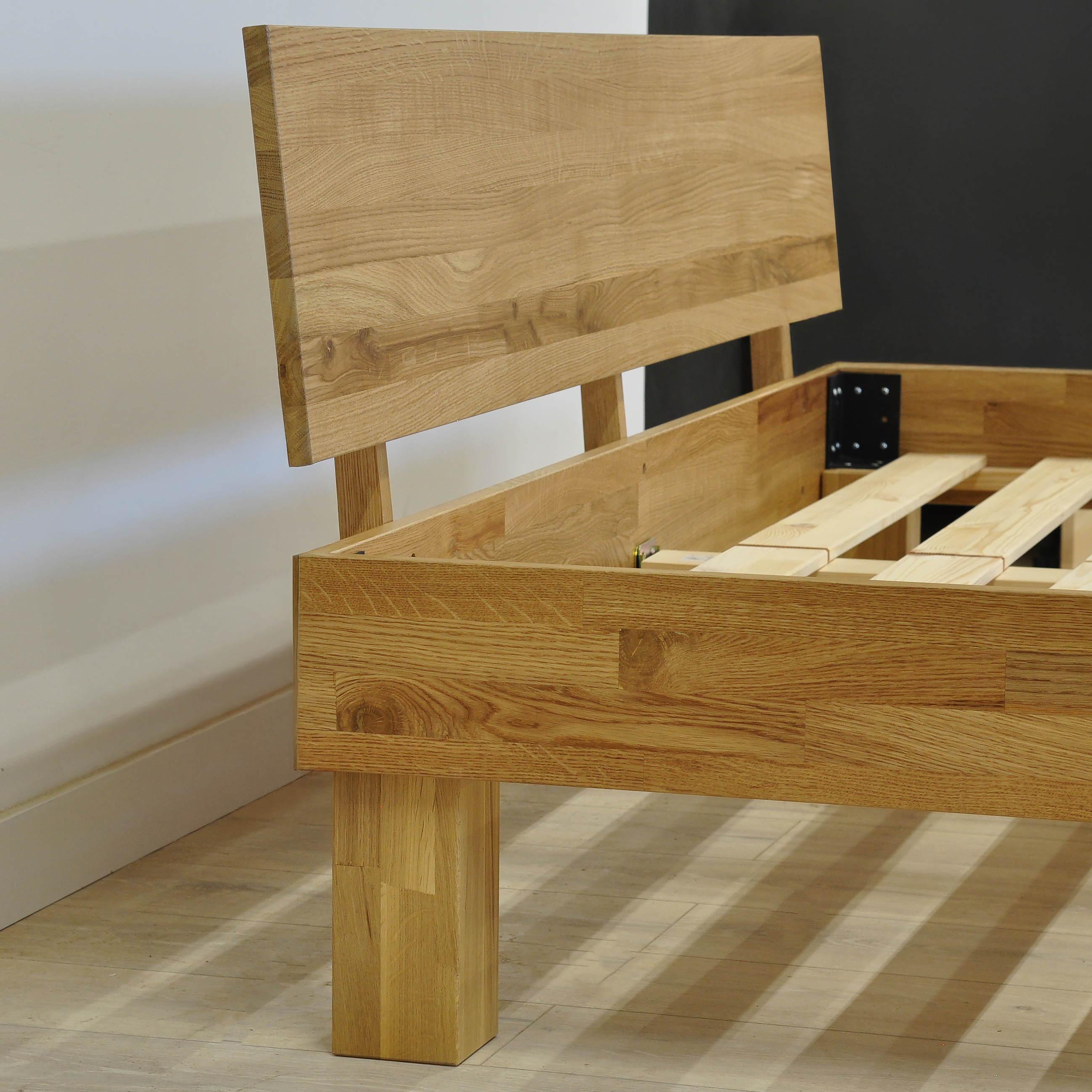 - Массив дуба премиум-класса: Кровать выполнена из цельноламельного дуба толщиной 20 мм, покрытого натуральным лаком для долговечности и устойчивости к повреждениям.