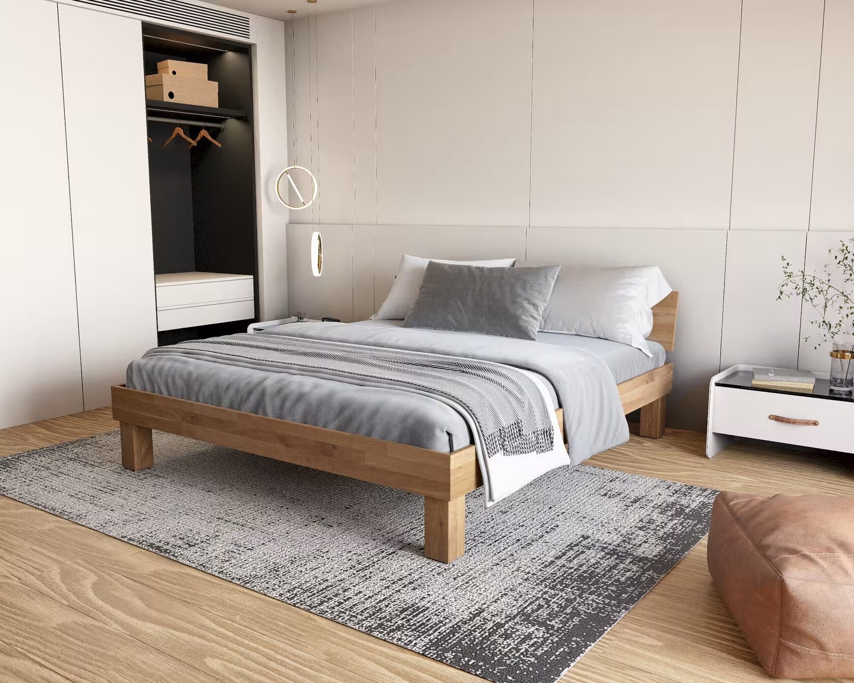 Кровать поставляется в разобранном виде с деревянными ножками, изголовьем и готовым настилом, что облегчает ее транспортировку и сборку. Четыре массивные прямоугольные ножки коричневого цвета, поддерживающие кровать по всей ширине, выполнены из массива дуба, что придает двуспальной кровати особую прочность и привлекательность в стиле лофт.