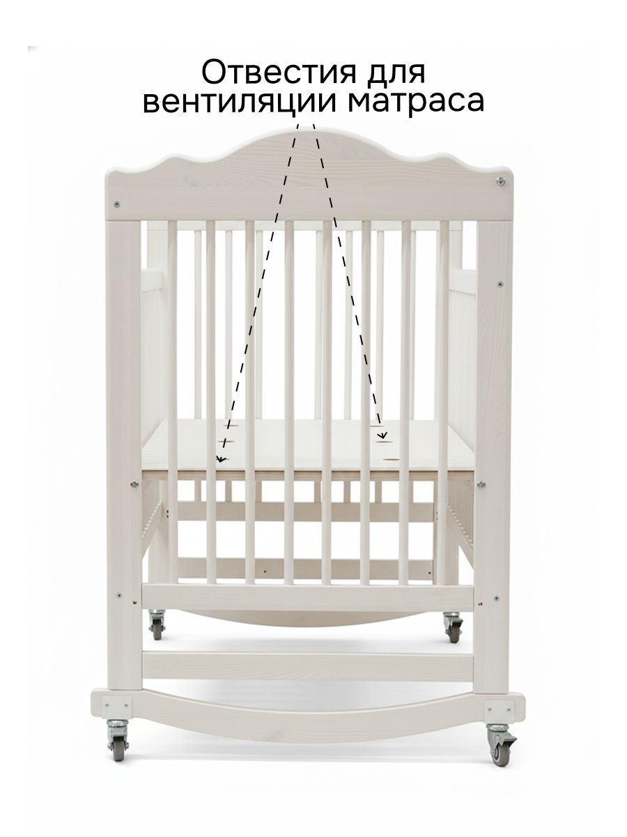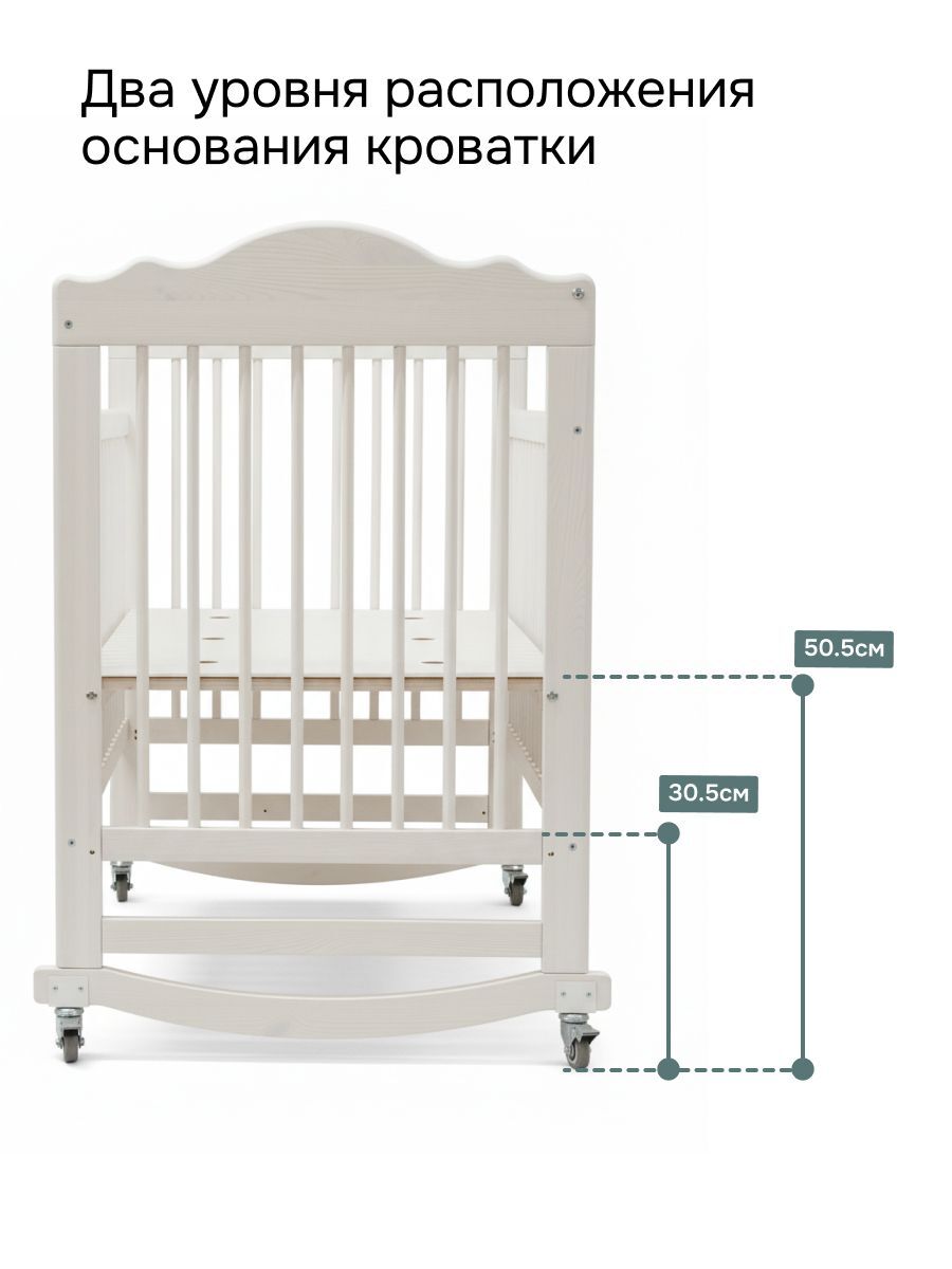 Кровать оснащена четырьмя роликовыми опорами со стопорами, которые позволяют легко перемещать кровать и надежно фиксировать её на месте. Основание регулируется в двух положениях по высоте, что помогает подобрать оптимальный уровень для малыша и облегчает уход за кроваткой.
