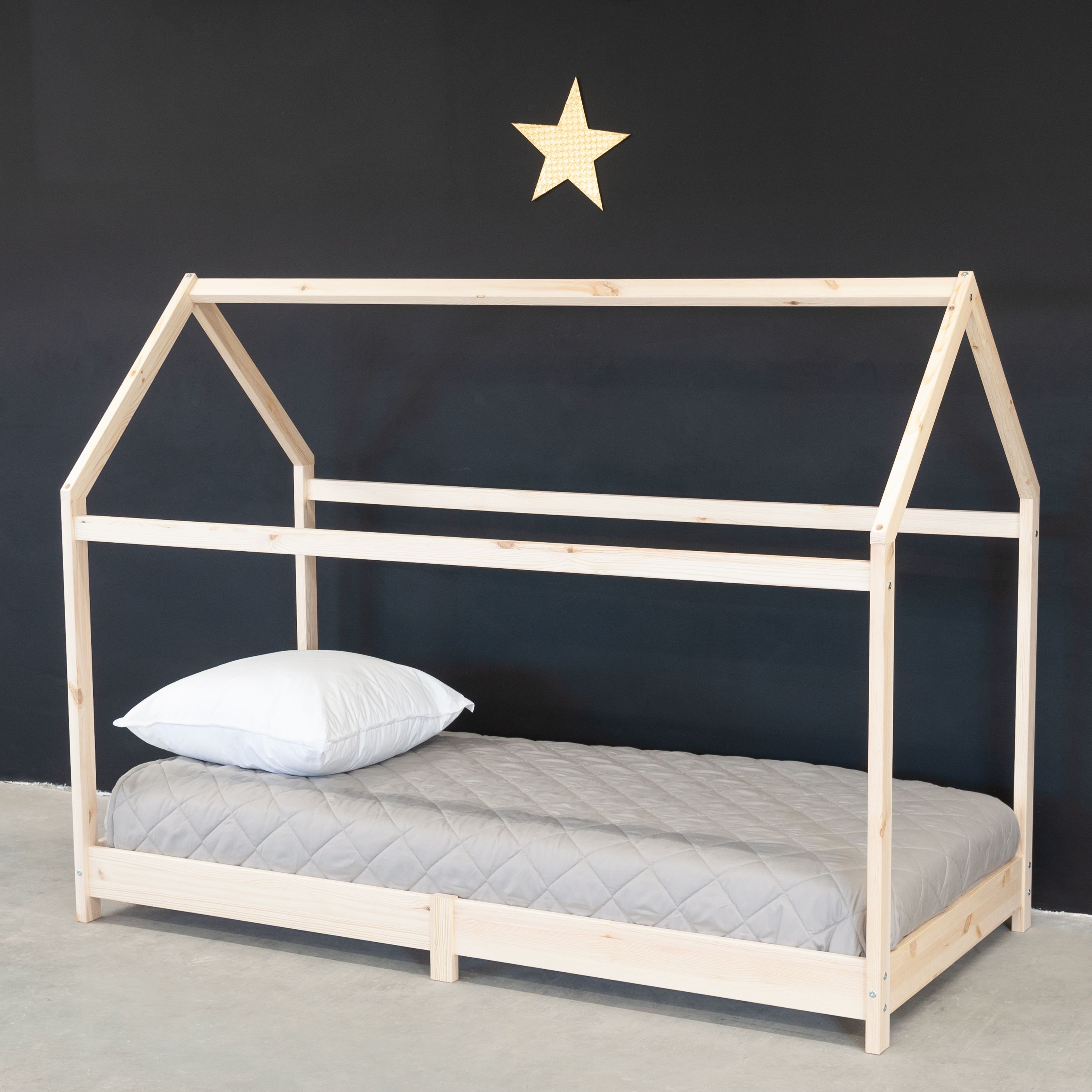 - Кровать-домик Cozy изготовлена из массива сосны — экологичного и прочного материала. Натуральная текстура сосны с ее уникальными древесными узорами не только придает кровати эстетическую привлекательность, но и наполняет комнату тонким ароматом хвойного леса.