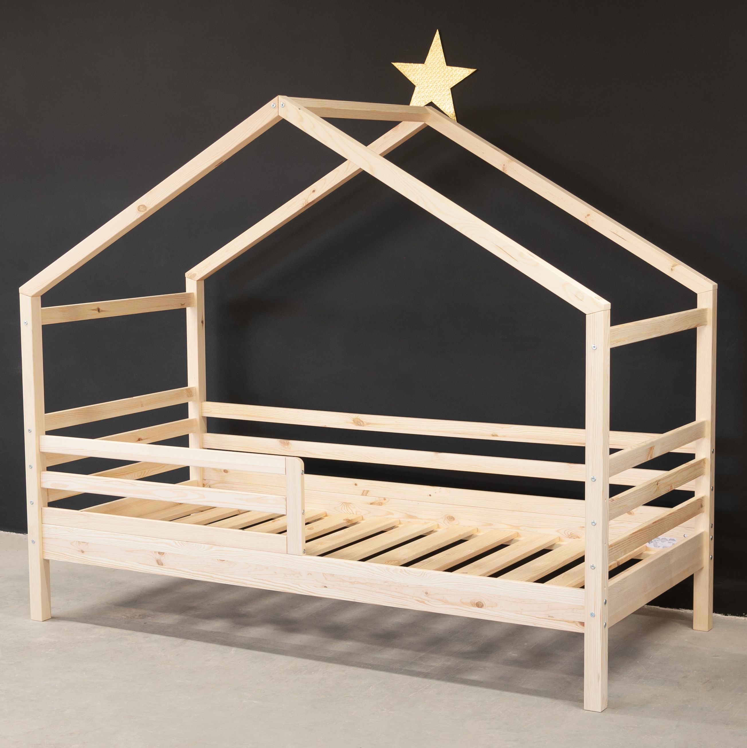 Детская кровать-домик Альков (размер спального места: 90x197 см) от белорусского производителя ООО "Диприз" в Скандинавском стиле с лаковым покрытием. Кровать из массива сосны создаст уютную, творческую обстановку в комнате вашего ребенка. Особенностью детской кровати является наличие бортиков, что обезопасит малыша от падения с кровати во сне. Кровать включает в себя 4 бортика безопасности, а также настил из массива сосны размером 90х197 см. К детской кровати-домику можно дополнительно установить балдахин, оборудовать подсветкой и украсить по своему усмотрению. Благодаря своей конструкции кровать прочная, не скрипит, а размер спального места 90х197 см позволяет легко выдерживать даже взрослого человека. Кровать изготовлена из натуральной древесины - массива сосны, она не скрипит, не пахнет краской, а наполняет помещение тонким и приятным ароматом хвойного дерева. В процессе производства использовались только качественные безопасные материалы и покрытия. Максимально допустимая нагрузка 100 кг на одно спальное место позволяет использовать ее как детскую и подростковую кровать, также в качестве односпальной кровати для взрослых. Бортик безопасности длиной 102,2 см и высотой - 29,6 см надежно защитит спящего от случайного травмирования. Габаритные размеры кровати - (ШxВxГ): 97x170x203,4 см, сечение ног 5x5 см, высота боковой царги 33 см, расстояние от пола до низа боковой царги 21 см.