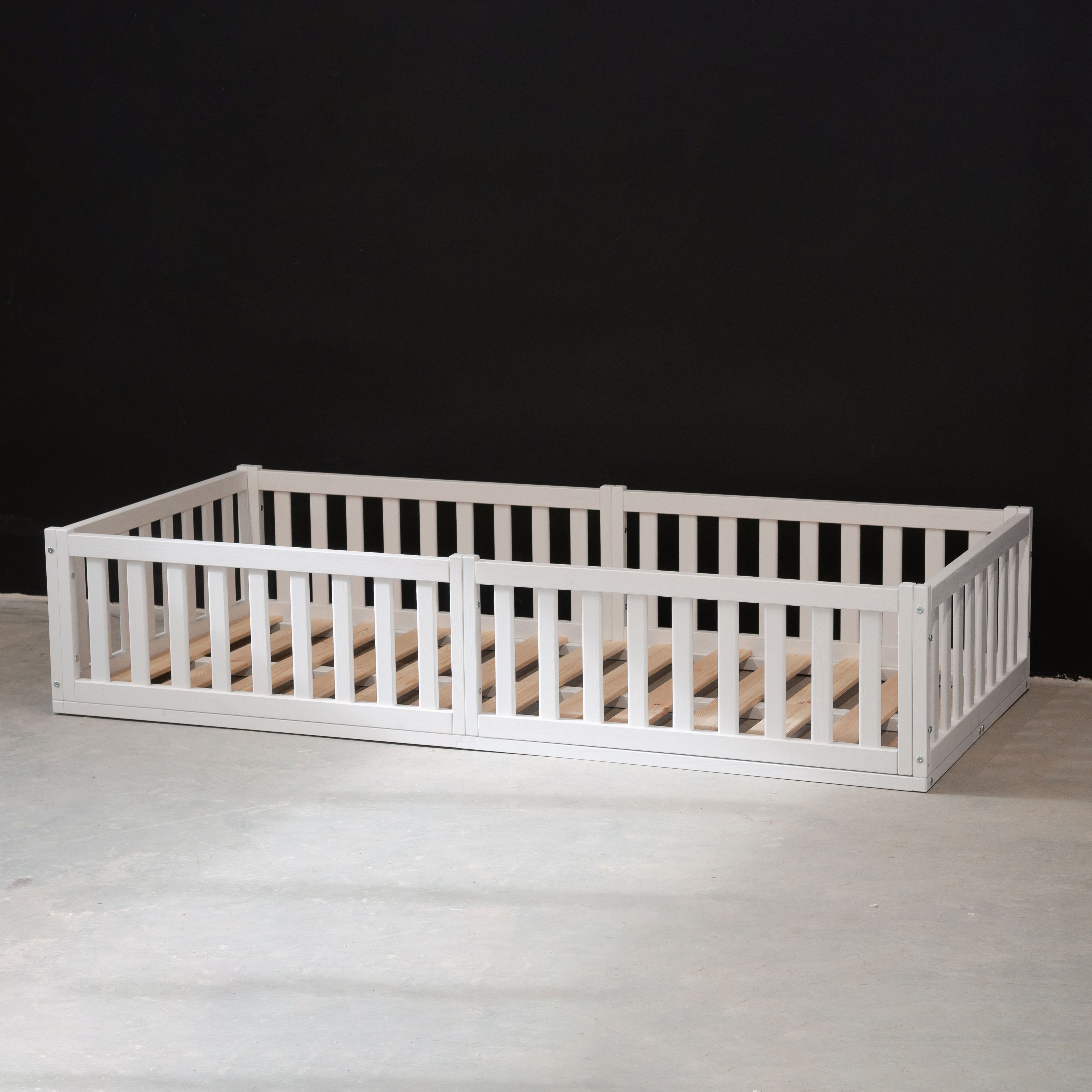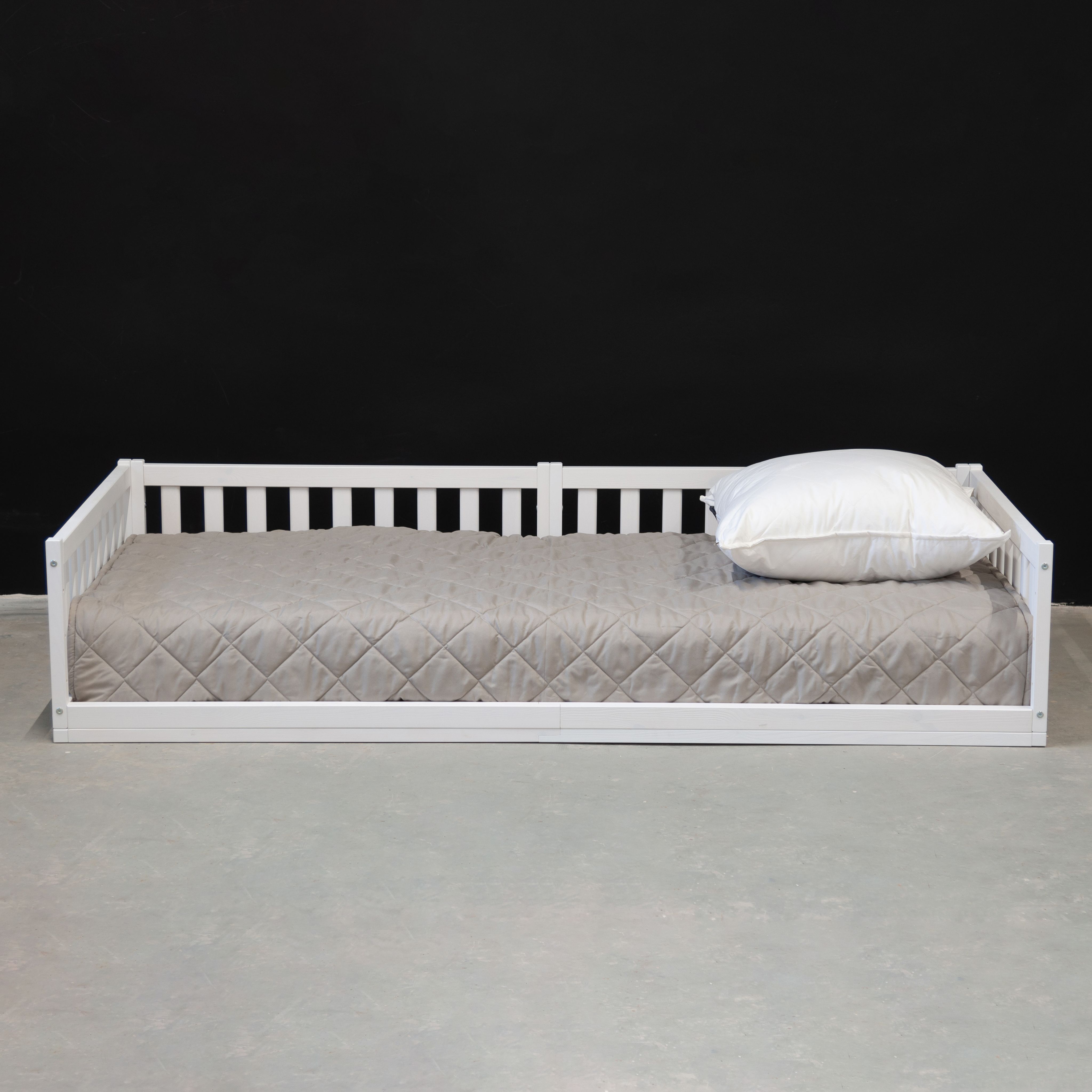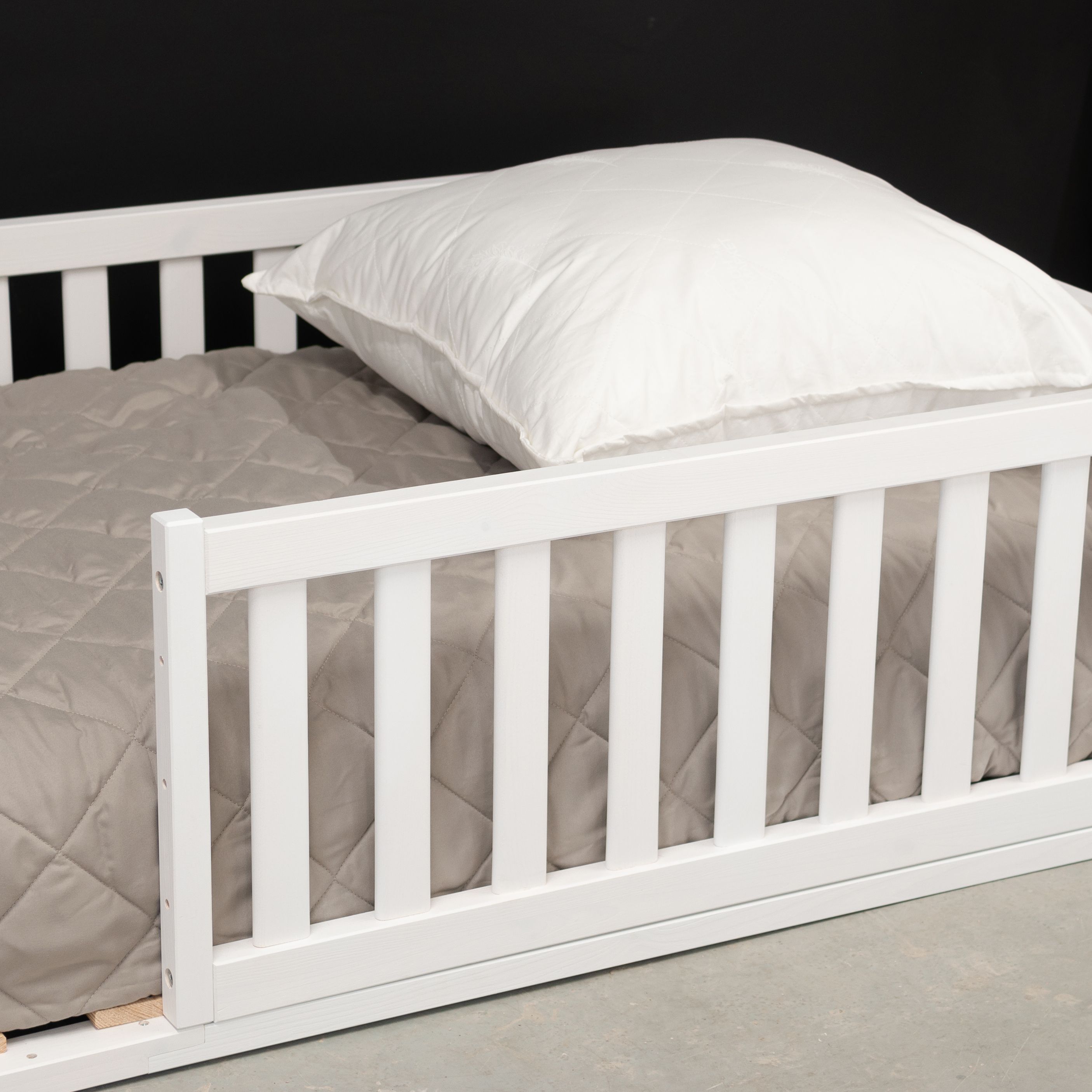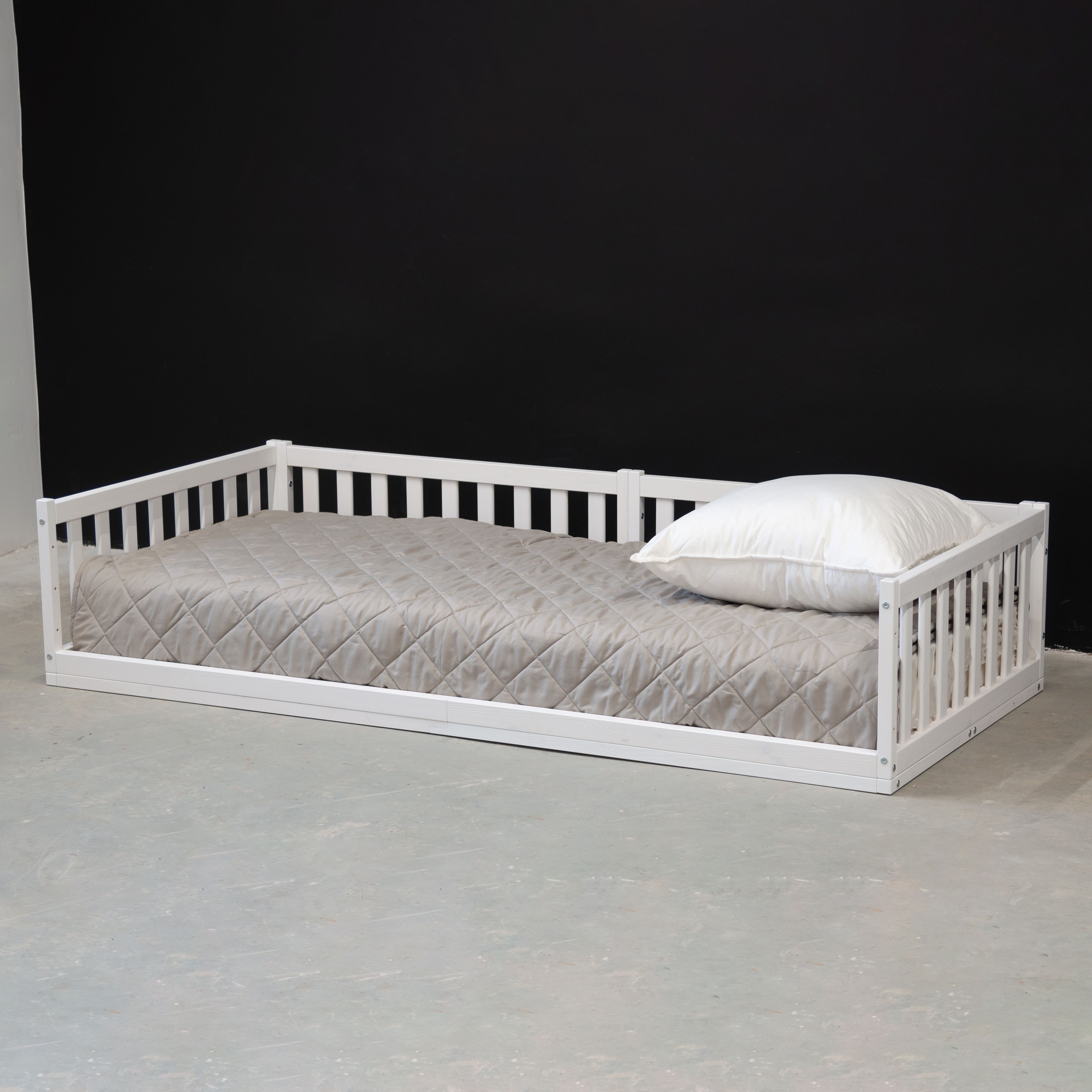 Деревянная односпальная кровать 90х200 Буфалина от белорусского производителя ООО «Диприз» выполнена в Скандинавском стиле в белом цвете. Уникальной особенностью детской кровати является отсутствие ножек (т.е. кровать напольная) и наличие бортиков безопасности. Лаконичный дизайн позволяет удачно вписывать ее в любое помещение, будь то спальня, детская комната или гостевой дом. Конструкция подростковой кровати стабильна, безопасна и устойчива, ввиду отсутствия ножек. Кровать включает в себя 3 бортика безопасности (2 бортика размером 89,5х43 см и 1 бортик длиной 199,5 см и высотой 43 см), а также настил из массива сосны размером 90х200 см. Дополнительный 4-й и 5-й бортики безопасности для создания полностью закрытой кровати можно докупить отдельно (SKU: 1508565906). Максимально допустимая нагрузка 100 кг на одно спальное место позволяет использовать ее как детскую кровать, подростковую кровать, также в качестве односпальной кровати для взрослых. Бортик безопасности длиной 199,5 см и высотой - 43 см надежно защитит спящего от травмирования. Размер спального места – 90х200. Кровать изготовлена из натуральной древесины - массива сосны, она не скрипит, не пахнет краской, а наполняет помещение тонким и приятным ароматом хвойного дерева. Покрыта натуральным белым воском на водной основе, который сохраняет все полезные свойства дерева. Эта модель поставляется в трех видах отделки – без отделки (натуральный) (SKU: 1379277244), в натуральном лаке (SKU: 1379254111) или с покрытием белым воском (SKU: 1379245704). Детскую кровать с бортиками легко собрать за счет набора фурнитуры для сборки, который поставляется вместе с кроватью. В комплекте идёт подробная иллюстрированная инструкция, которая поможет легко и быстро собрать кровать. Изделие укомплектовано настилом под матрасы (матрас не входит в комплект, докупается отдельно). Рекомендуемый размер матраса 90х200, макс. высота матраса до 20 см. Возможна установка бортика на правую и левую сторону во время сборки.