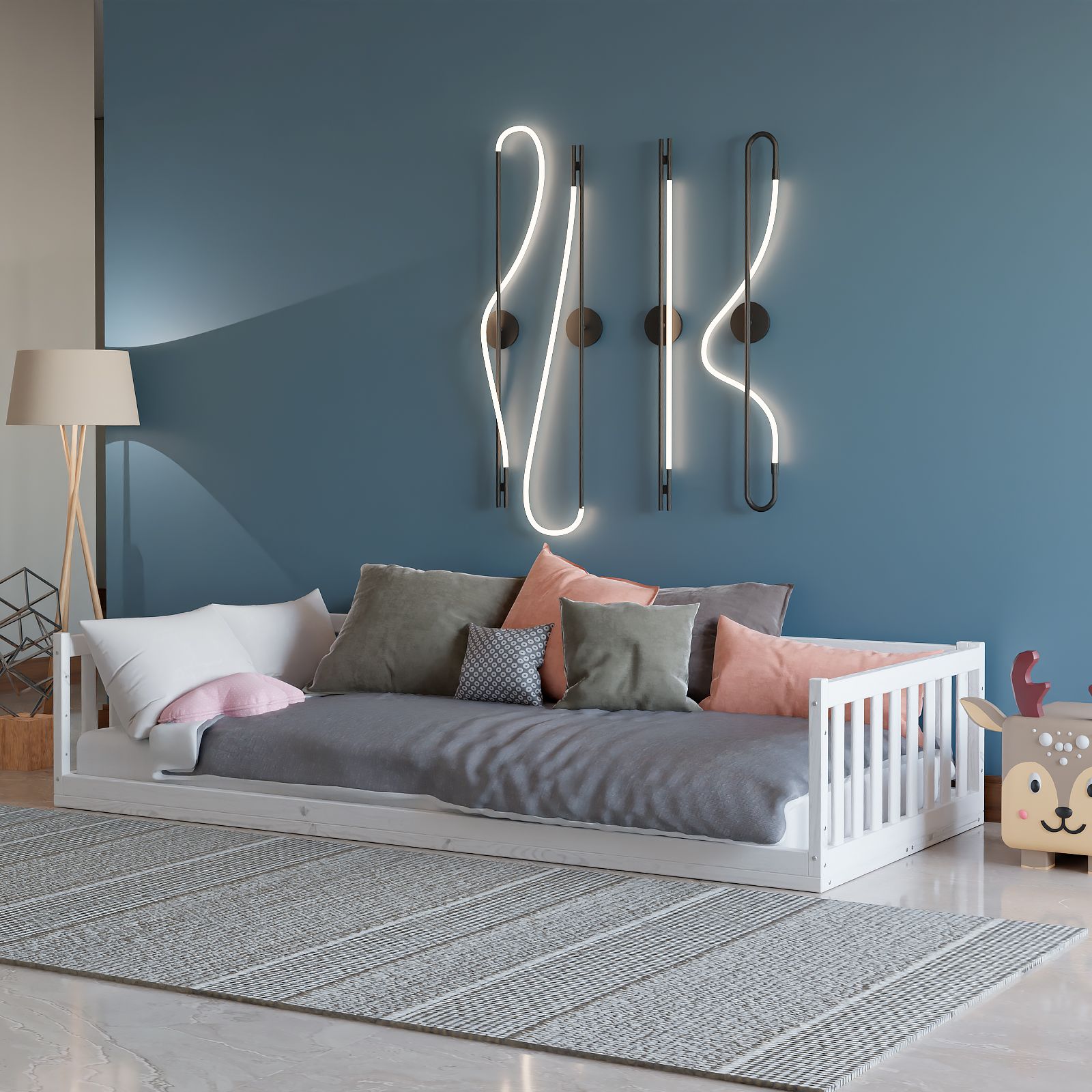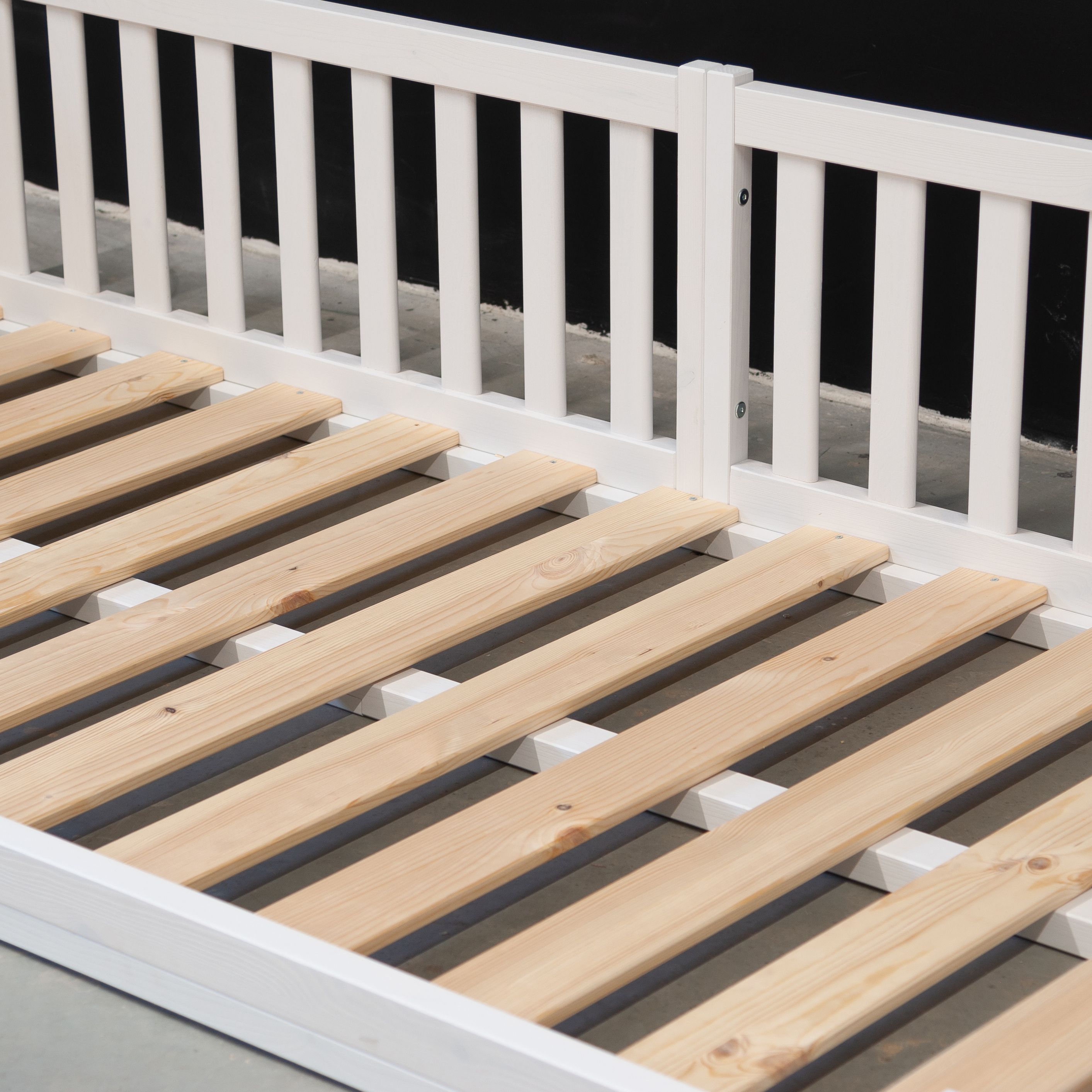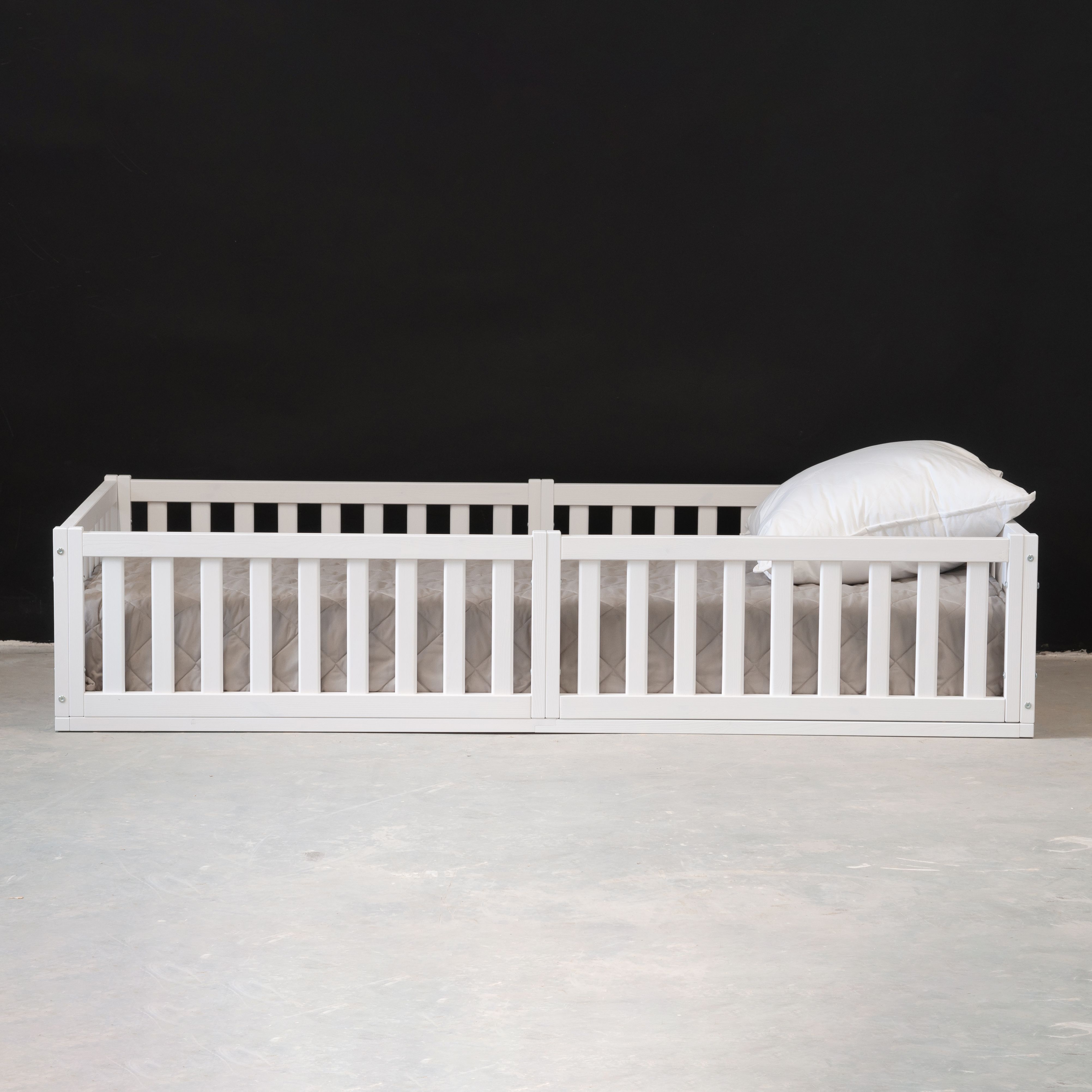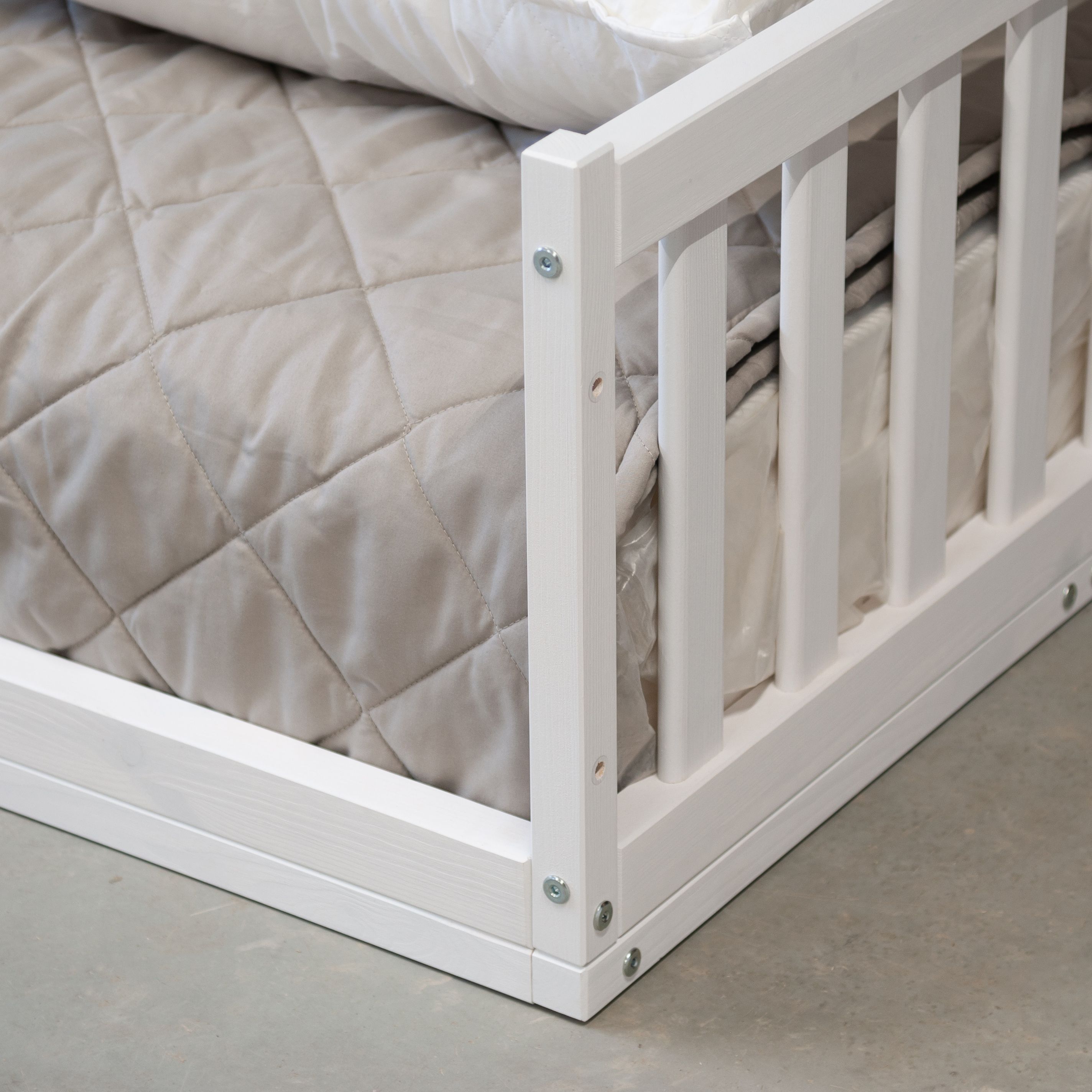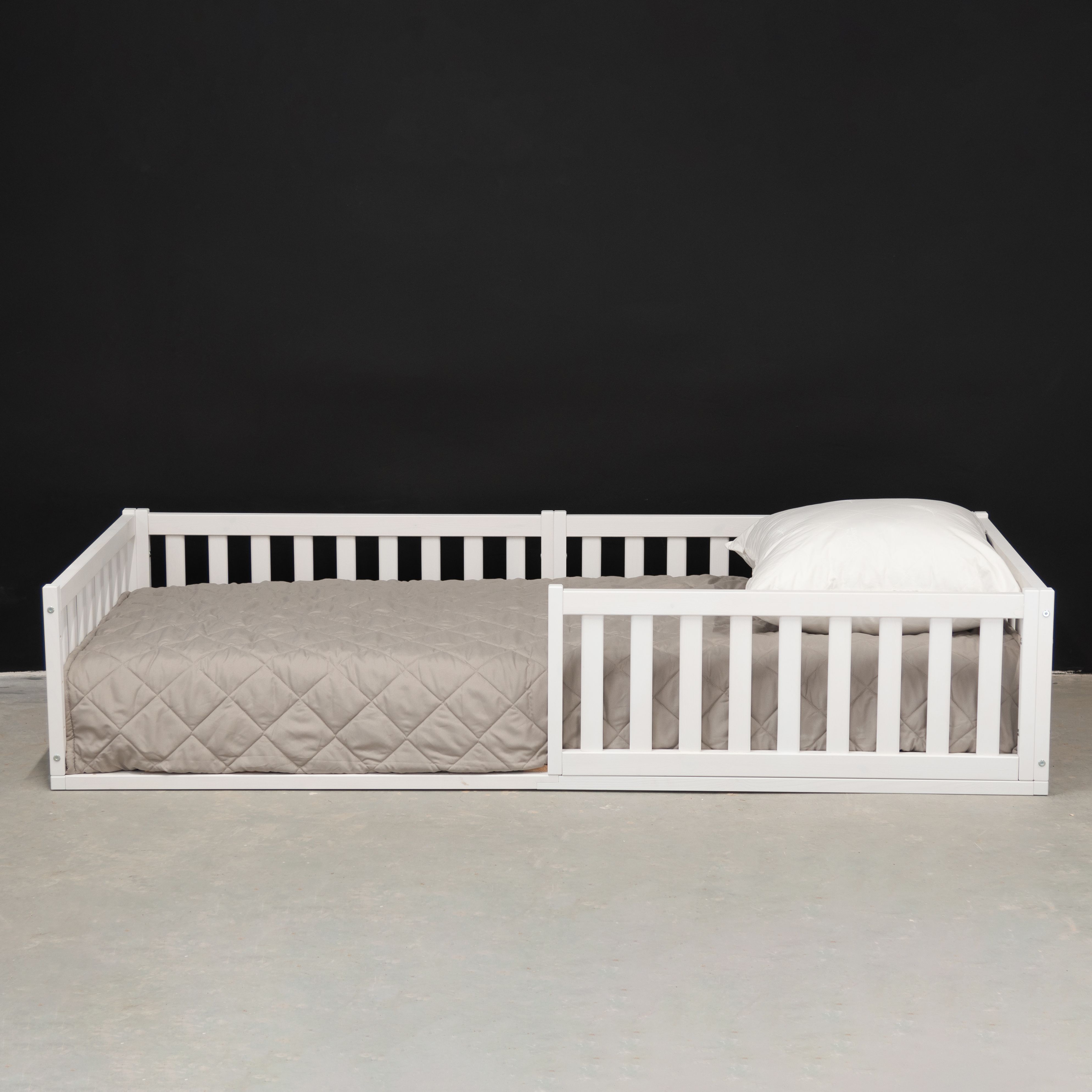 Деревянная односпальная кровать 90х200 Буфалина от белорусского производителя ООО «Диприз» выполнена в Скандинавском стиле в белом цвете. Уникальной особенностью детской кровати является отсутствие ножек (т.е. кровать напольная) и наличие бортиков безопасности. Лаконичный дизайн позволяет удачно вписывать ее в любое помещение, будь то спальня, детская комната или гостевой дом. Конструкция подростковой кровати стабильна, безопасна и устойчива, ввиду отсутствия ножек. Кровать включает в себя 3 бортика безопасности (2 бортика размером 89,5х43 см и 1 бортик длиной 199,5 см и высотой 43 см), а также настил из массива сосны размером 90х200 см. Дополнительный 4-й и 5-й бортики безопасности для создания полностью закрытой кровати можно докупить отдельно (SKU: 1508565906). Максимально допустимая нагрузка 100 кг на одно спальное место позволяет использовать ее как детскую кровать, подростковую кровать, также в качестве односпальной кровати для взрослых. Бортик безопасности длиной 199,5 см и высотой - 43 см надежно защитит спящего от травмирования. Размер спального места – 90х200. Кровать изготовлена из натуральной древесины - массива сосны, она не скрипит, не пахнет краской, а наполняет помещение тонким и приятным ароматом хвойного дерева. Покрыта натуральным белым воском на водной основе, который сохраняет все полезные свойства дерева. Эта модель поставляется в трех видах отделки – без отделки (натуральный) (SKU: 1379277244), в натуральном лаке (SKU: 1379254111) или с покрытием белым воском (SKU: 1379245704). Детскую кровать с бортиками легко собрать за счет набора фурнитуры для сборки, который поставляется вместе с кроватью. В комплекте идёт подробная иллюстрированная инструкция, которая поможет легко и быстро собрать кровать. Изделие укомплектовано настилом под матрасы (матрас не входит в комплект, докупается отдельно). Рекомендуемый размер матраса 90х200, макс. высота матраса до 20 см. Возможна установка бортика на правую и левую сторону во время сборки.