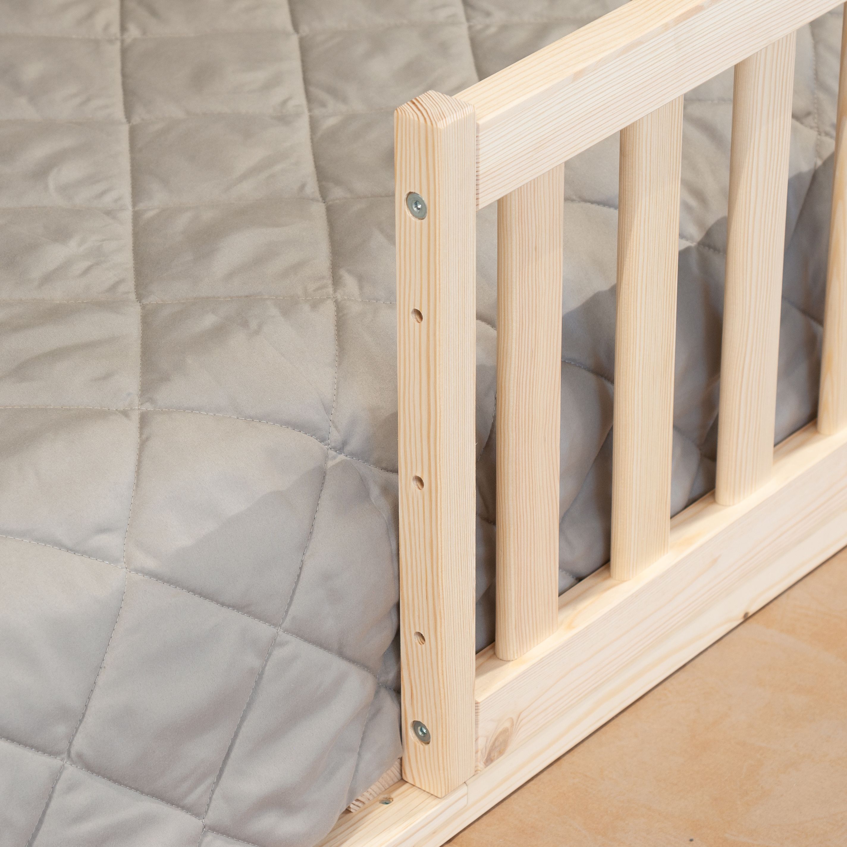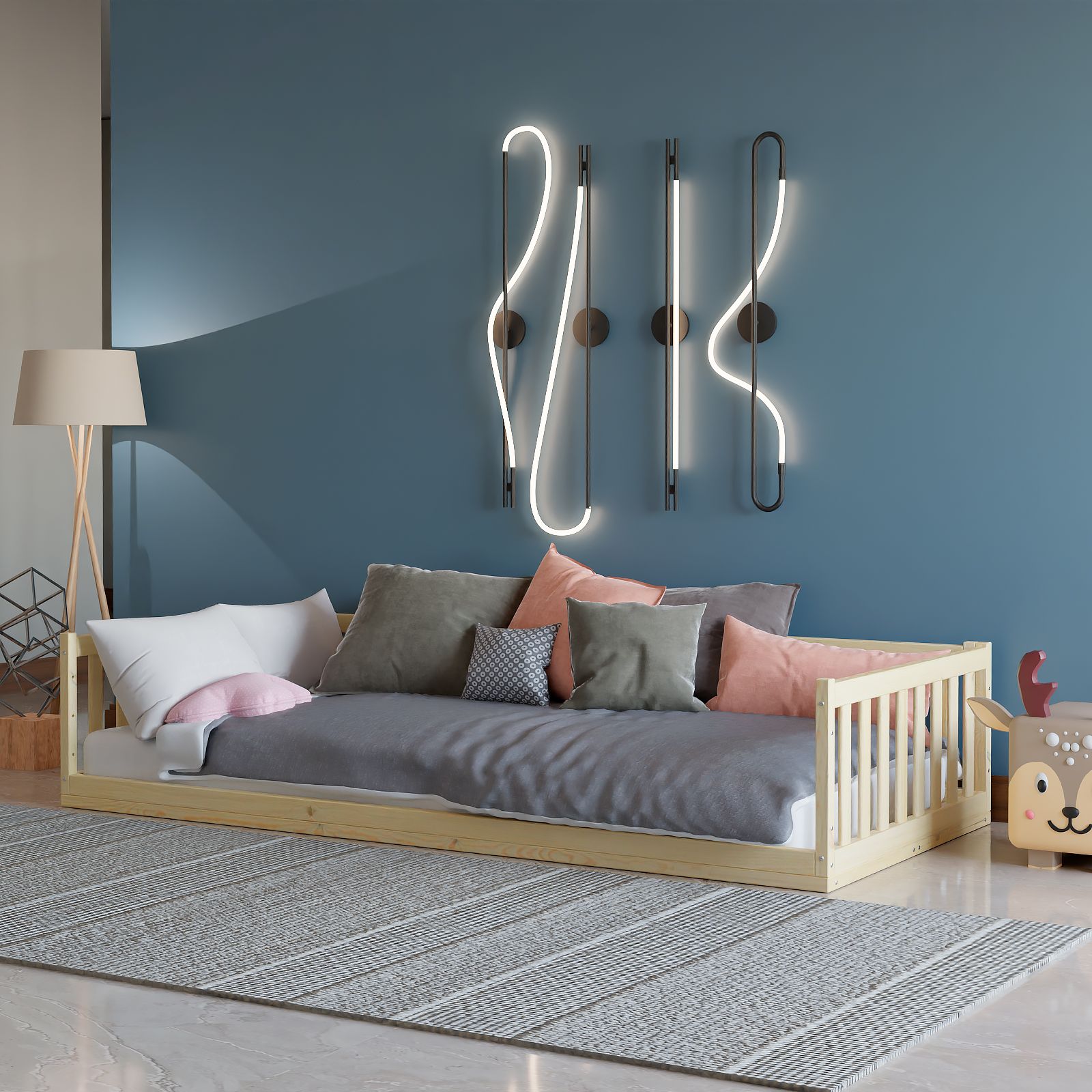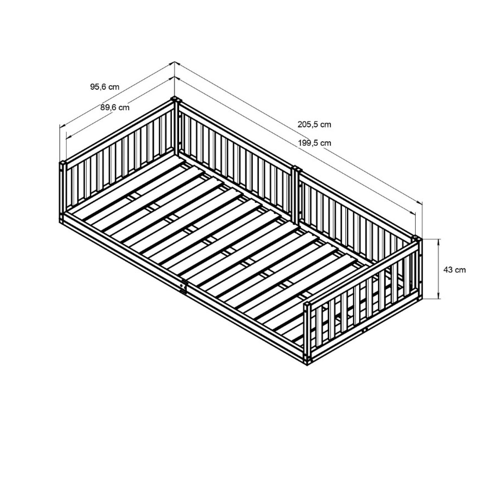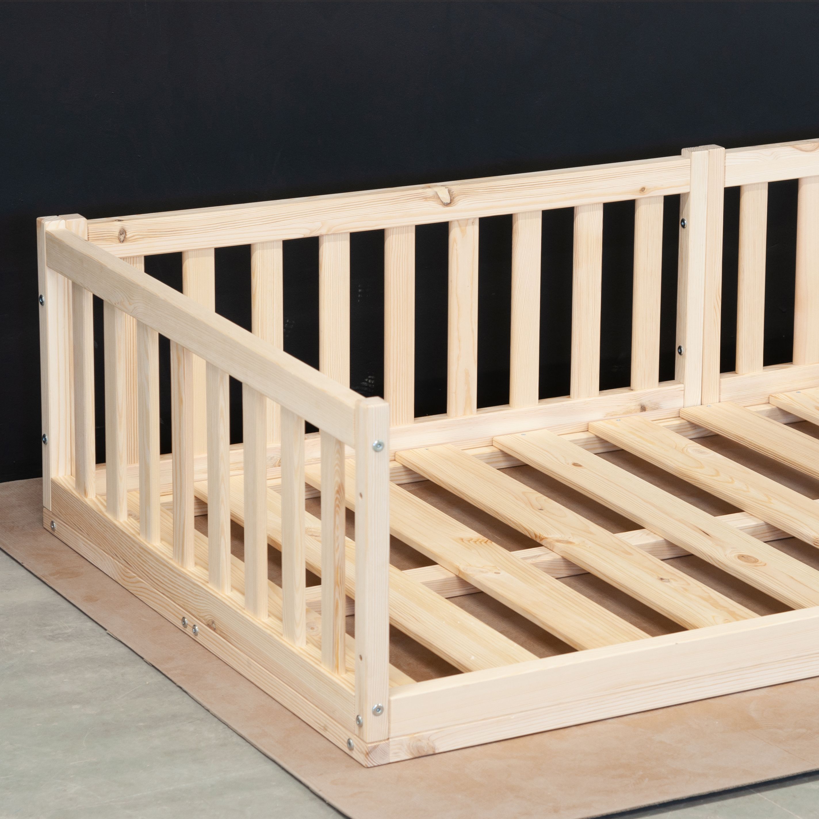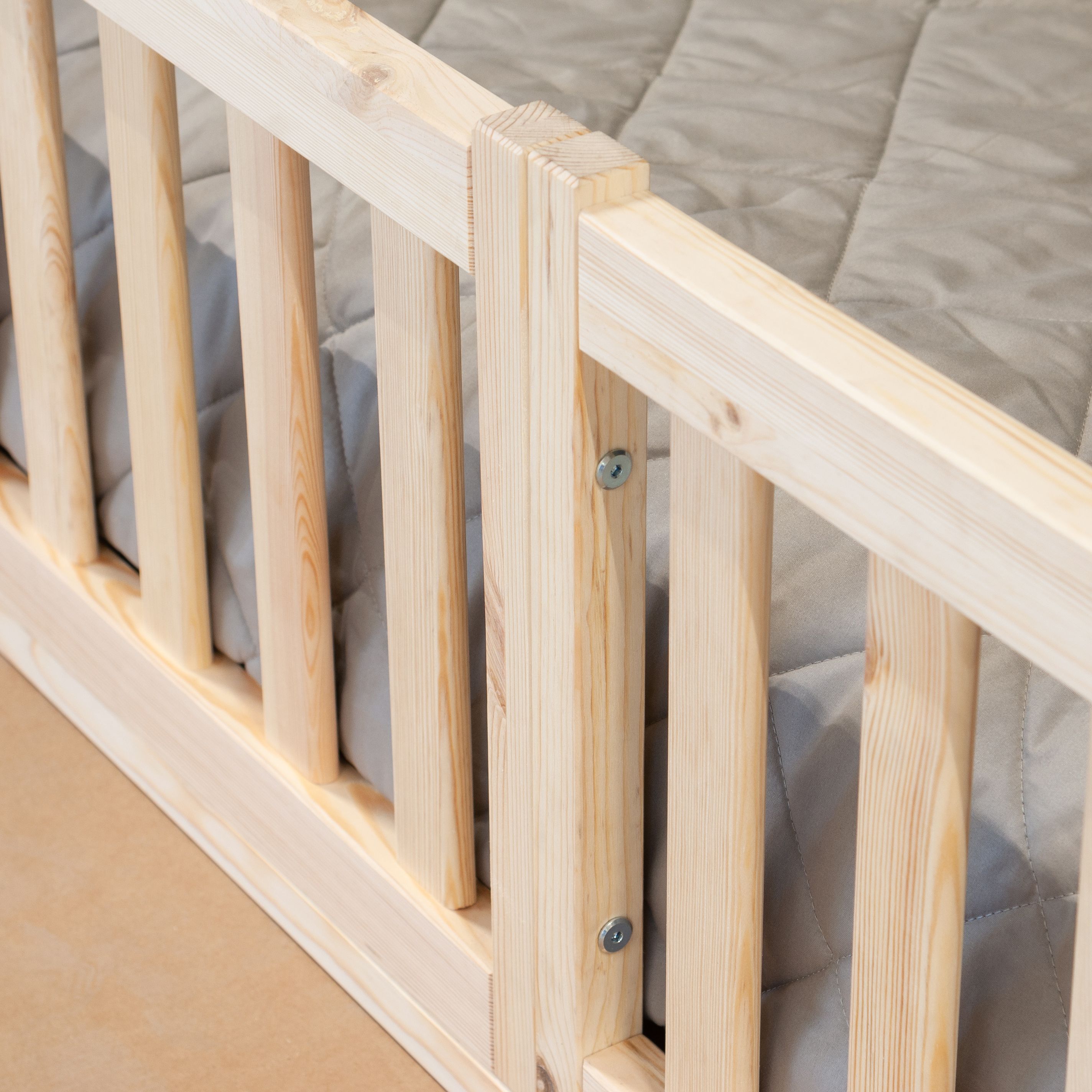 Деревянная односпальная кровать 90х200 Буфалина от белорусского производителя ООО «Диприз» выполнена в Скандинавском стиле в натуральном цвете, без покрытия. Уникальной особенностью детской кровати является отсутствие ножек (т.е. кровать напольная) и наличие бортиков безопасности. Лаконичный дизайн позволяет удачно вписывать ее в любое помещение, будь то спальня, детская комната или гостевой дом. Конструкция подростковой кровати стабильна, безопасна и устойчива, ввиду отсутствия ножек. Кровать включает в себя 3 бортика безопасности (2 бортика размером 89,5х43 см и 1 бортик длиной 199,5 см и высотой 43 см), а также настил из массива сосны размером 90х200 см. Дополнительный 4-й и 5-й бортик безопасности для создания полностью закрытой кровати можно докупить отдельно (SKU: 1508205984). Максимально допустимая нагрузка 100 кг на одно спальное место позволяет использовать ее как детскую кровать, подростковую кровать, также в качестве односпальной кровати для взрослых. Бортик безопасности длиной 199,5 см и высотой - 43 см надежно защитит спящего от травмирования. Размер спального места – 90х200. Кровать изготовлена из натуральной древесины - массива сосны, она не скрипит, не пахнет краской, а наполняет помещение тонким и приятным ароматом хвойного дерева. Эта модель поставляется в трех видах отделки – без отделки (натуральный) (SKU: 1379277244), в натуральном лаке (SKU: 1379254111) или с покрытием белым воском (SKU: 1379245704). Детскую кровать с бортиками легко собрать за счет набора фурнитуры для сборки, который поставляется вместе с кроватью. В комплекте идёт подробная иллюстрированная инструкция, которая поможет легко и быстро собрать кровать. Изделие укомплектовано настилом под матрасы (матрас не входит в комплект, докупается отдельно). Рекомендуемый размер матраса 90х200, макс. высота матраса до 20 см. Возможна установка бортика на правую и левую сторону во время сборки.