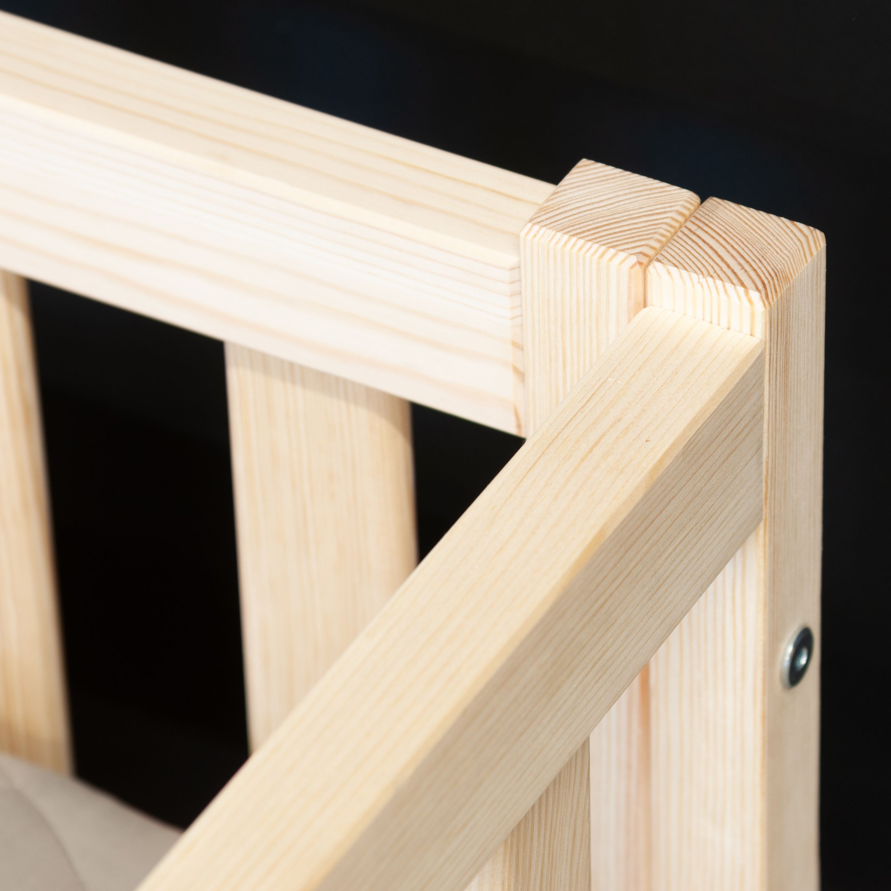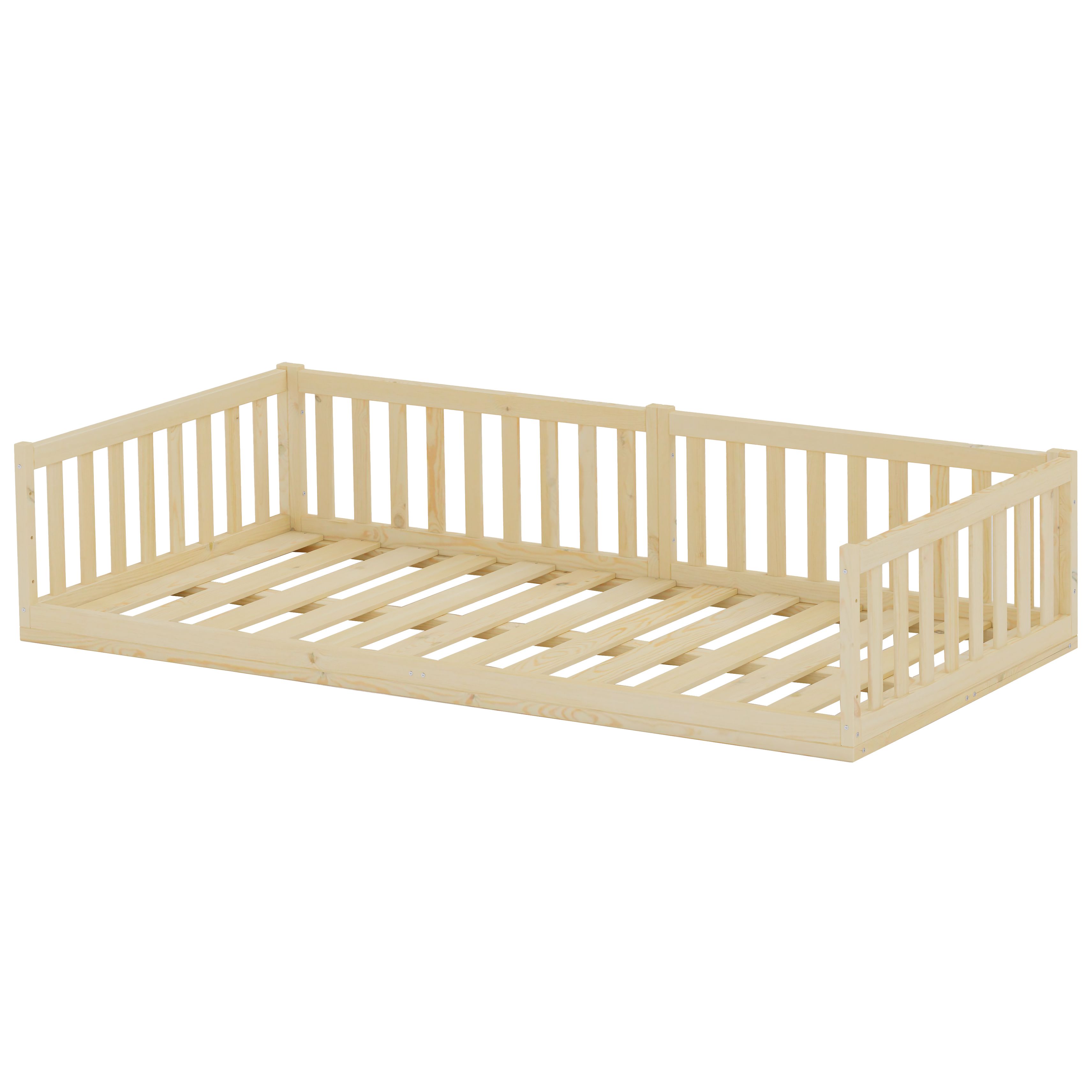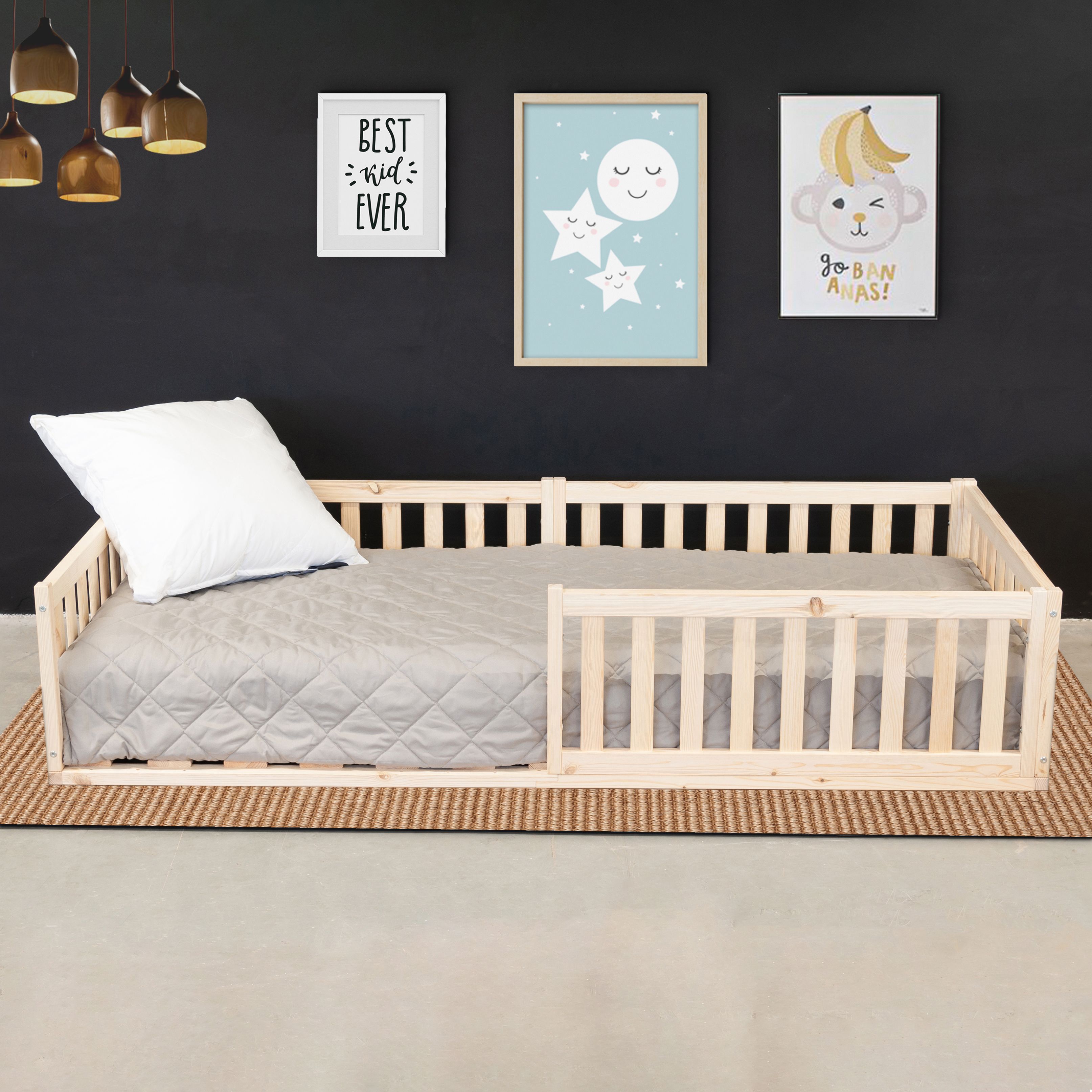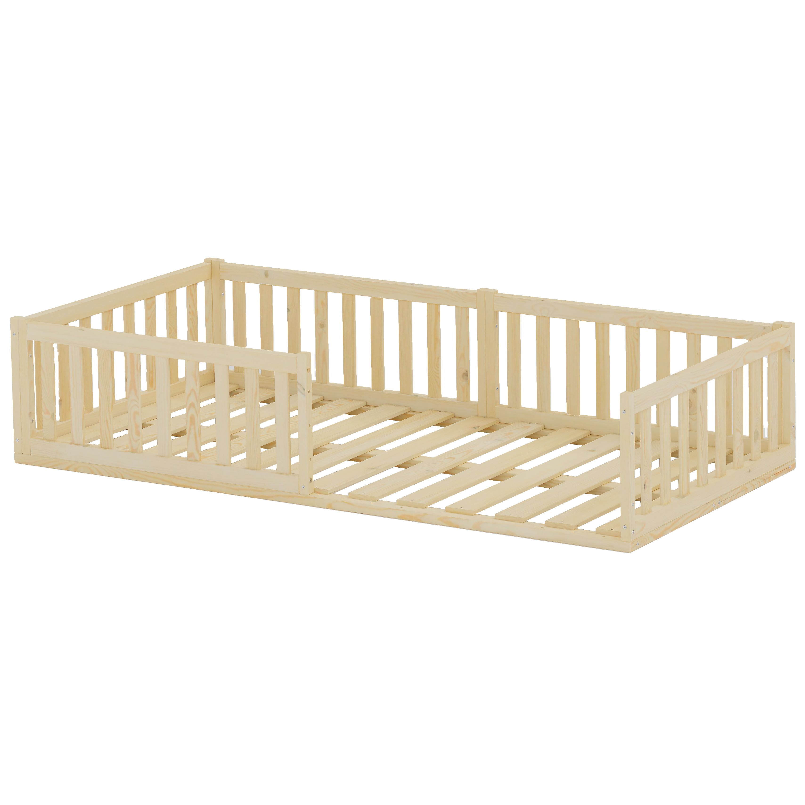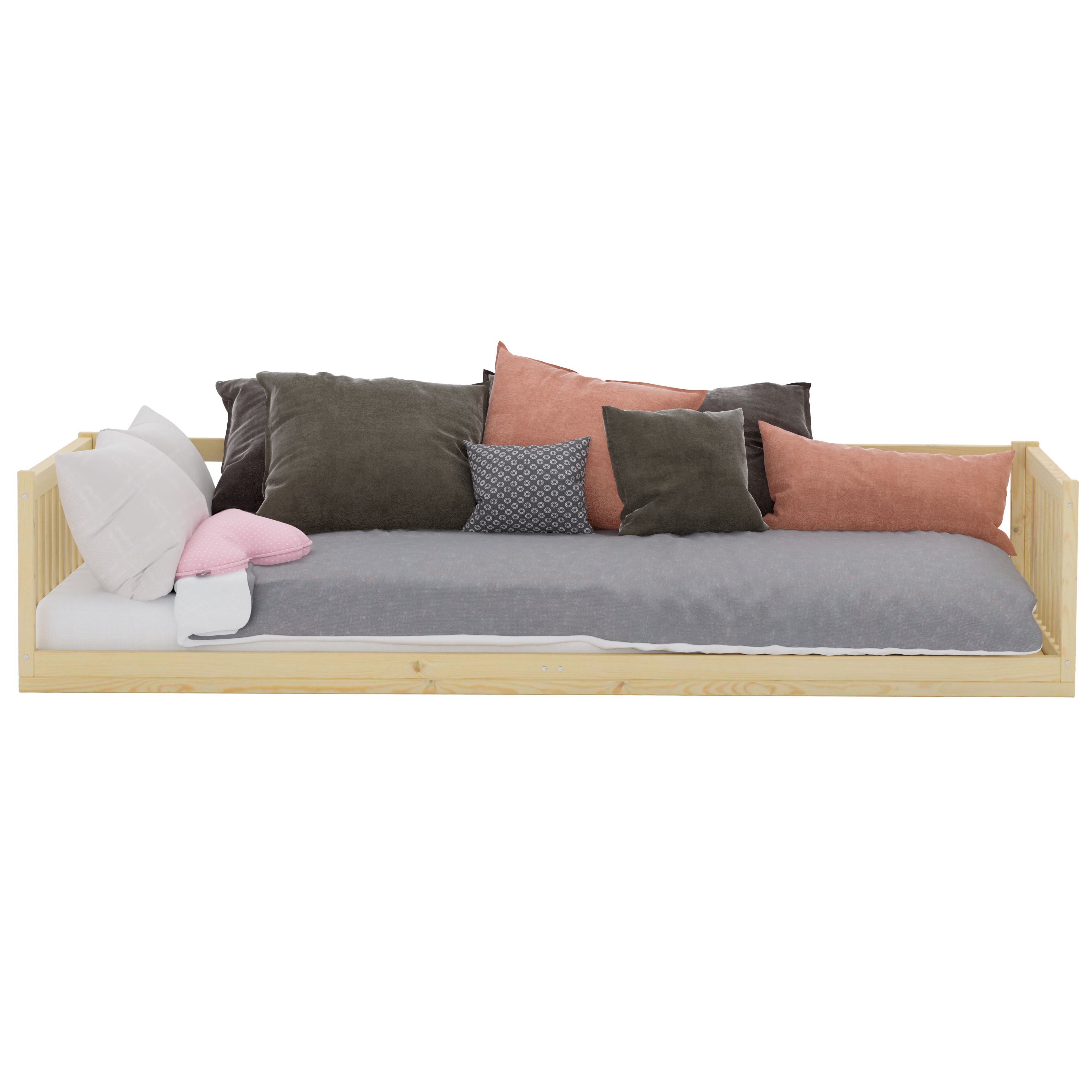 Деревянная односпальная кровать 90х200 Буфалина от белорусского производителя ООО «Диприз» выполнена в Скандинавском стиле в натуральном цвете, без покрытия. Уникальной особенностью детской кровати является отсутствие ножек (т.е. кровать напольная) и наличие бортиков безопасности. Лаконичный дизайн позволяет удачно вписывать ее в любое помещение, будь то спальня, детская комната или гостевой дом. Конструкция подростковой кровати стабильна, безопасна и устойчива, ввиду отсутствия ножек. Кровать включает в себя 3 бортика безопасности (2 бортика размером 89,5х43 см и 1 бортик длиной 199,5 см и высотой 43 см), а также настил из массива сосны размером 90х200 см. Дополнительный 4-й и 5-й бортик безопасности для создания полностью закрытой кровати можно докупить отдельно (SKU: 1508205984). Максимально допустимая нагрузка 100 кг на одно спальное место позволяет использовать ее как детскую кровать, подростковую кровать, также в качестве односпальной кровати для взрослых. Бортик безопасности длиной 199,5 см и высотой - 43 см надежно защитит спящего от травмирования. Размер спального места – 90х200. Кровать изготовлена из натуральной древесины - массива сосны, она не скрипит, не пахнет краской, а наполняет помещение тонким и приятным ароматом хвойного дерева. Эта модель поставляется в трех видах отделки – без отделки (натуральный) (SKU: 1379277244), в натуральном лаке (SKU: 1379254111) или с покрытием белым воском (SKU: 1379245704). Детскую кровать с бортиками легко собрать за счет набора фурнитуры для сборки, который поставляется вместе с кроватью. В комплекте идёт подробная иллюстрированная инструкция, которая поможет легко и быстро собрать кровать. Изделие укомплектовано настилом под матрасы (матрас не входит в комплект, докупается отдельно). Рекомендуемый размер матраса 90х200, макс. высота матраса до 20 см. Возможна установка бортика на правую и левую сторону во время сборки.