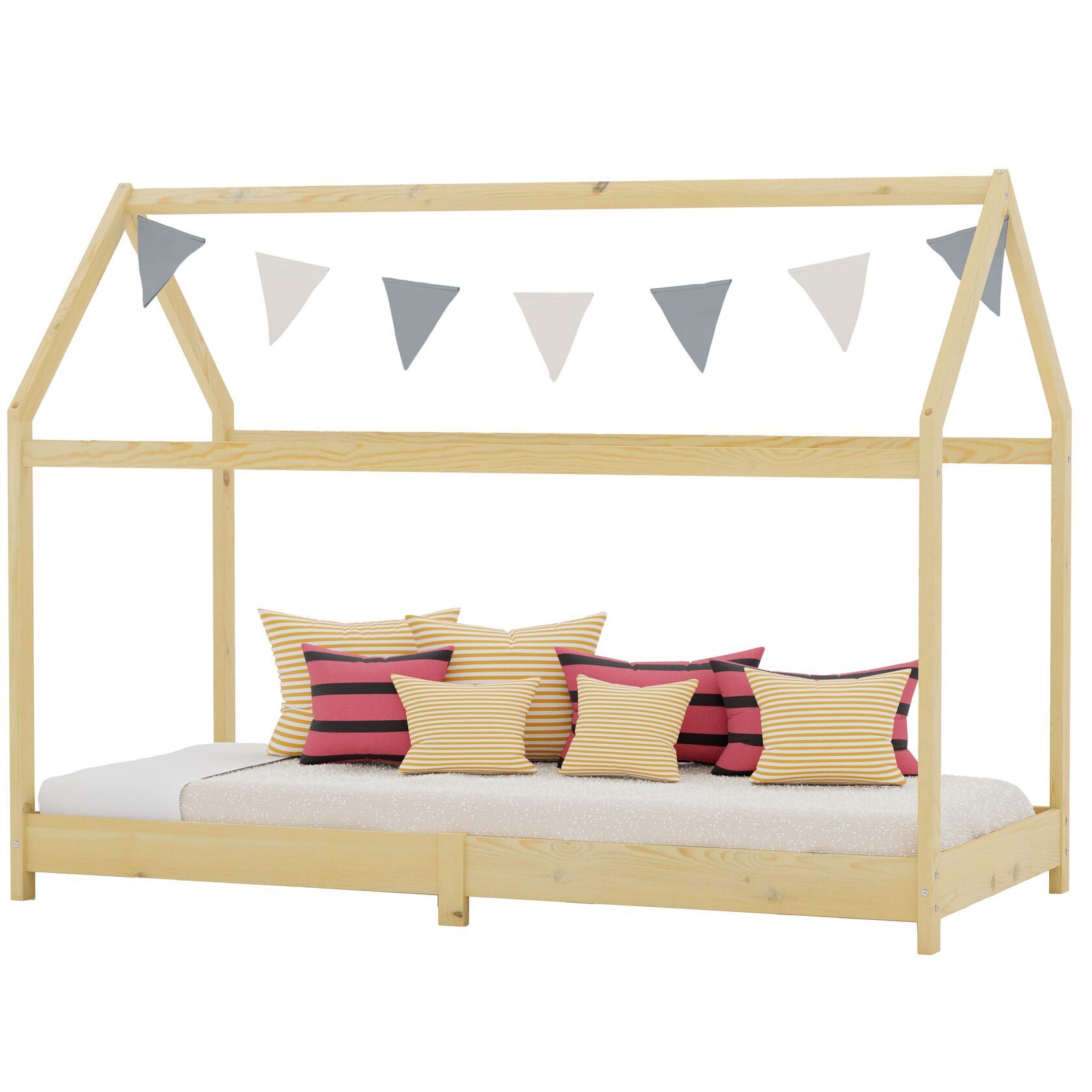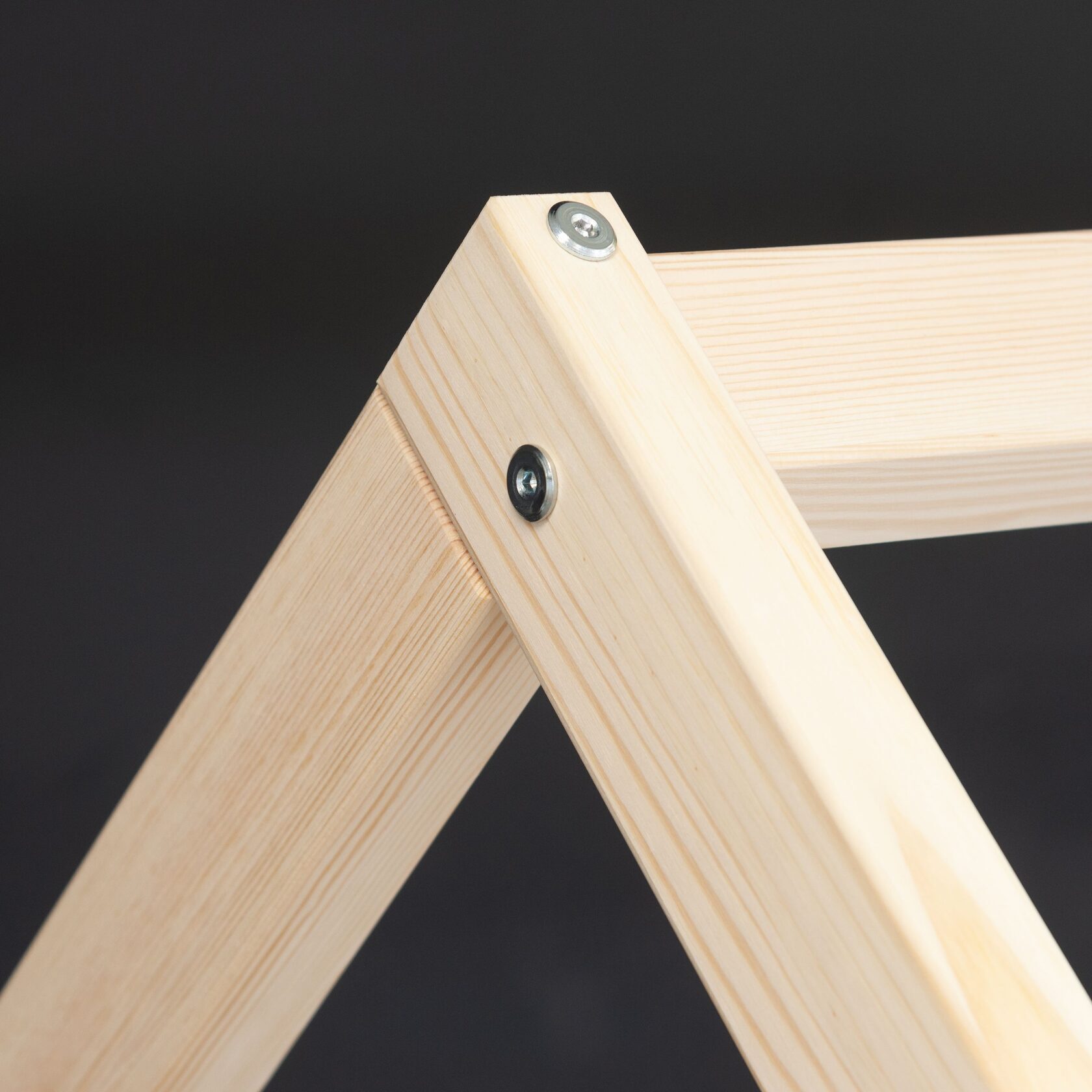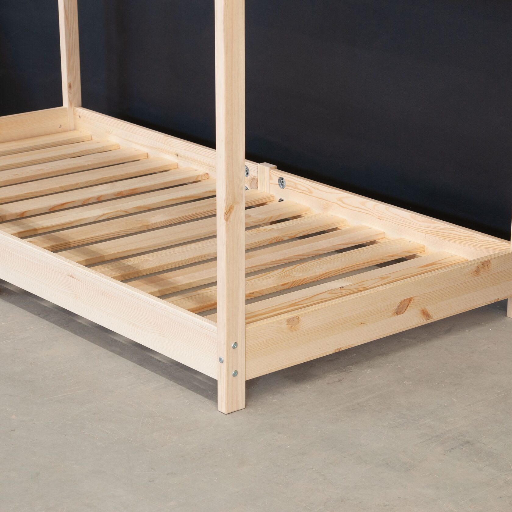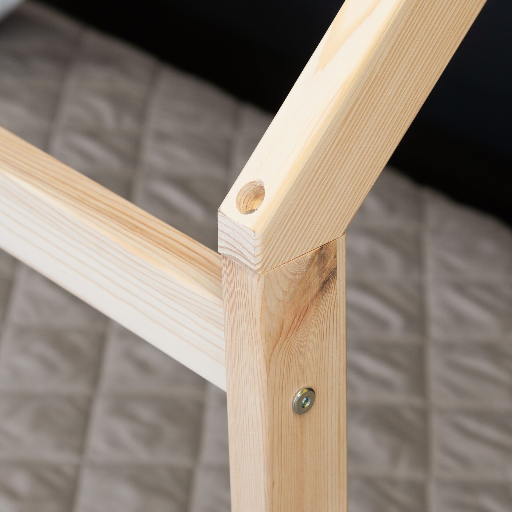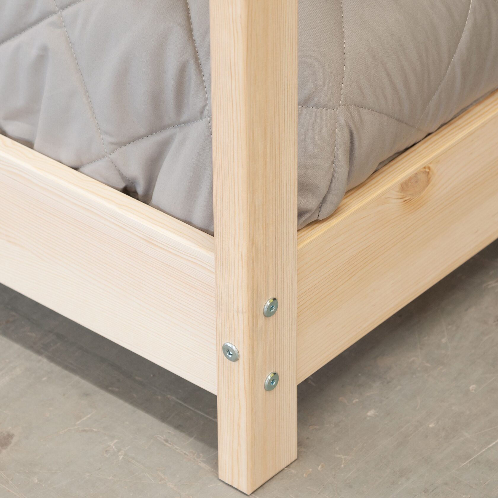Детская кровать-домик от белорусского производителя ООО "Диприз" в Скандинавском стиле в бежевом цвете с покрытием лак. Кровать из массива сосны создаст уютную, творческую обстановку в комнате вашего ребенка. Уникальной особенностью кровати является наличие невысоких ножек, которые предотвращают шанс возможного травмирования. К детской кровати-домику можно дополнительно установить балдахин, оборудовать подсветкой и украсить по своему усмотрению. Кровать не имеет бортиков безопасности. Необычный дизайн и натуральные материалы позволят дополнить детскую комнату и создать приятную атмосферу. В процессе производства использовались только качественные безопасные материалы и покрытия. Благодаря своей конструкции кровать прочная, не скрипит, и легко выдерживает даже взрослого человека. Размер спального места – 90х190. Кровать изготовлена из натуральной древесины - массива сосны, она не не пахнет краской, а наполняет помещение тонким и приятным ароматом хвойного дерева. Максимально допустимая нагрузка 100 кг на одно спальное место позволяет использовать ее как детскую и подростковую кровать домик, также в качестве односпальной кровати для взрослых. Кровать представлена в нескольких вариантах отделки – без отделки (натуральный) (SKU: 1379706324), в натуральном лаке (SKU: 1379671637) или с покрытием белым воском (SKU: 1379703107). Габаритные размеры кровати - (ШxВxГ): 97x150x199 см, сечение ног 5x5 см, высота боковой царги 12 см, расстояние от пола до низа боковой царги - 6 см. Детскую кровать домик легко собрать за счет набора фурнитуры для сборки, который поставляется вместе с кроватью. В комплекте идёт подробная иллюстрированная инструкция, которая поможет легко и быстро собрать кровать. Изделие укомплектовано настилом 90х190 из массива сосны под матрас (матрас не входит в комплект, докупается отдельно). Рекомендуемый размер матраса 90х190, макс. высота матраса до 10 см.