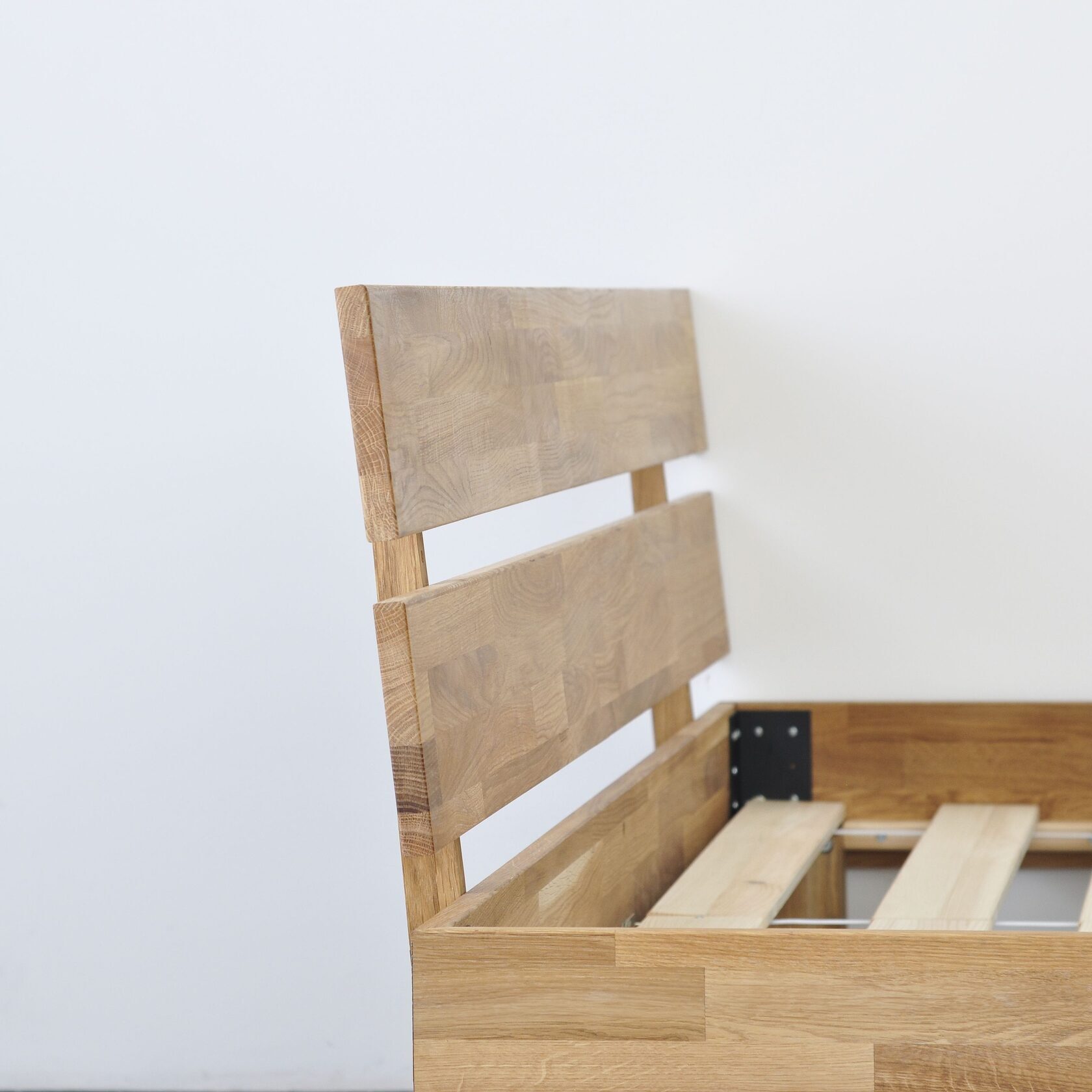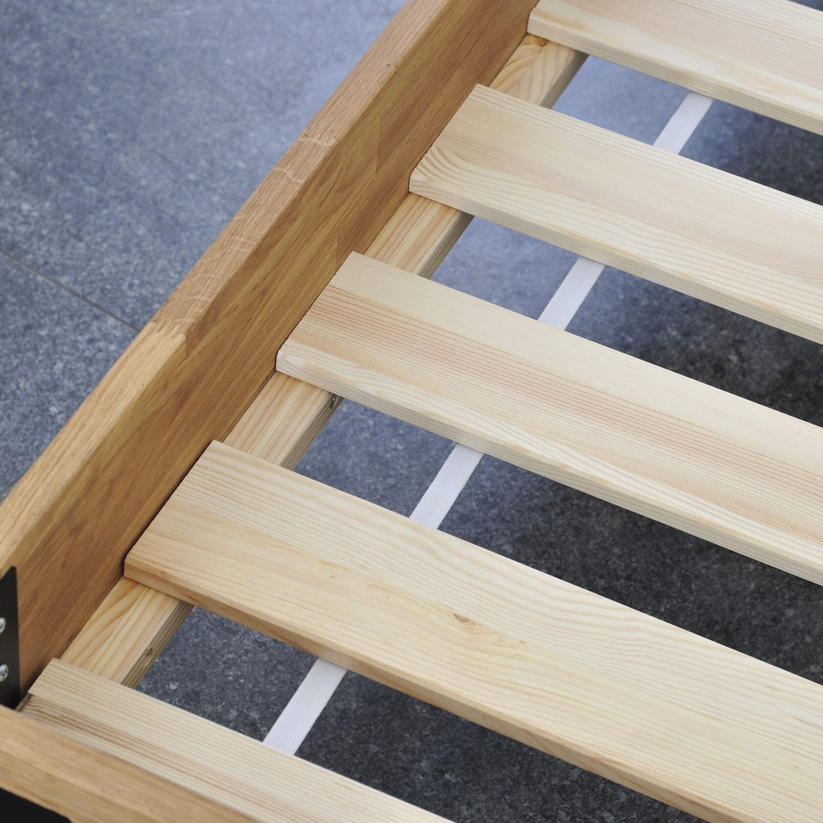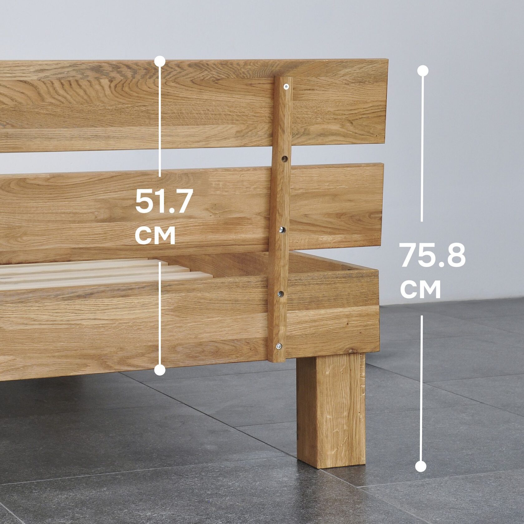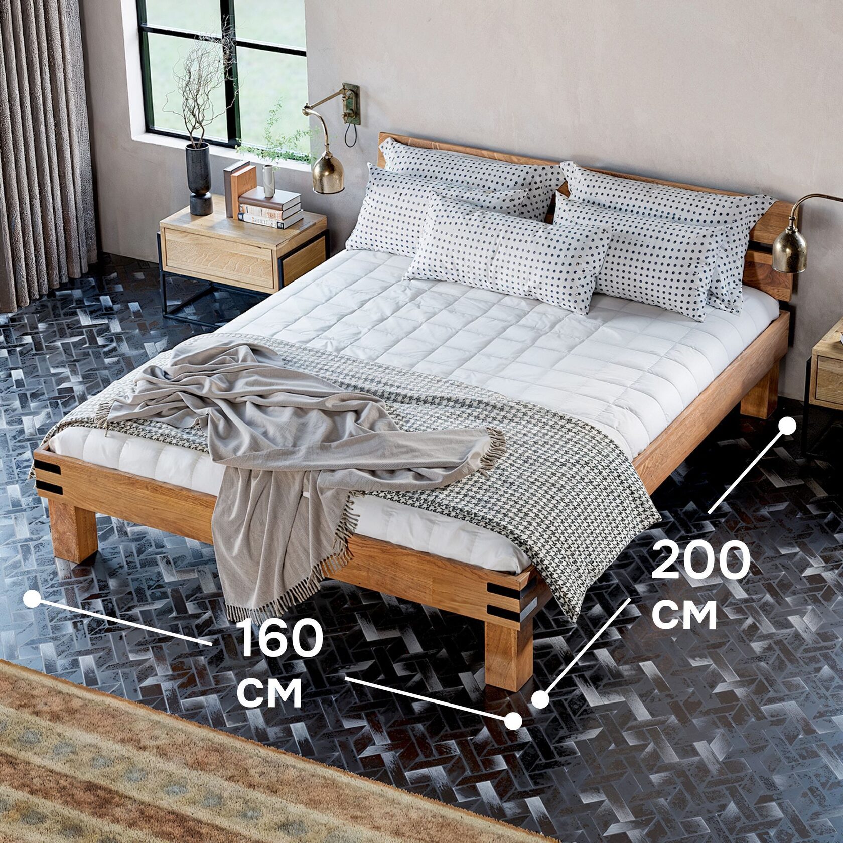 - Массив дуба премиум-класса: Кровать выполнена из цельноламельного дуба толщиной 20 мм, пропитанного натуральным маслом для долговечности и устойчивости к повреждениям.