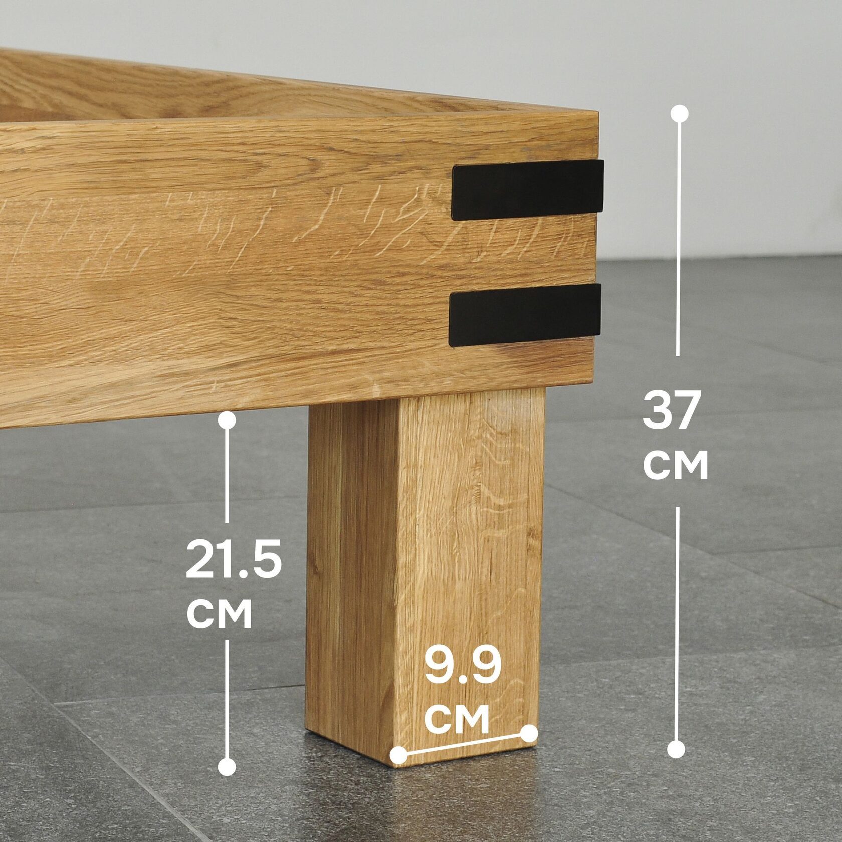- Современный дизайн: Прямоугольные дубовые ножки (99 мм толщиной и высотой 21.5 см) с акцентными металлическими вставками.