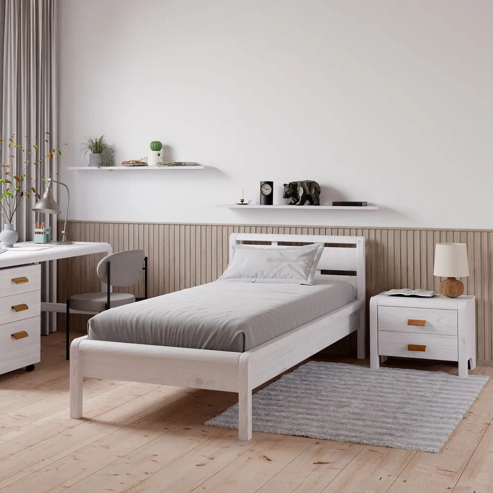 Кровать односпальная Мадейра размером 90х200 см из массива сосны — идеальный выбор для тех, кто ценит натуральные материалы и современный дизайн. Кровать выполнена в белом цвете, покрыта натуральным воском, идеально дополняя интерьер вашей спальни или детской. Кровать серии Мадейра отличается особенной прочностью и долговечностью благодаря использованию высококачественных материалов.