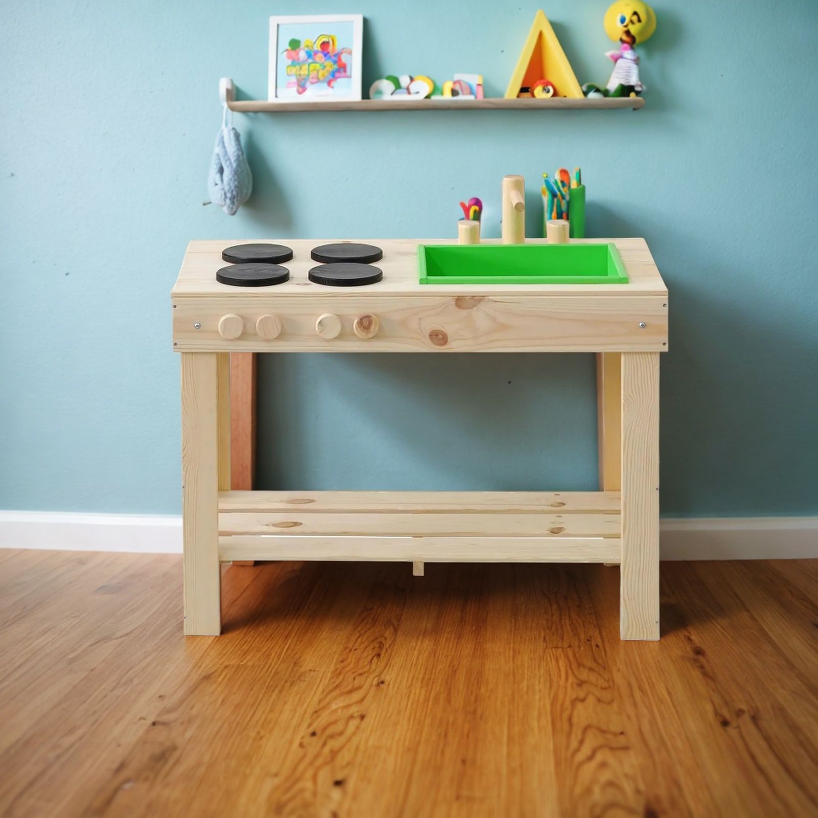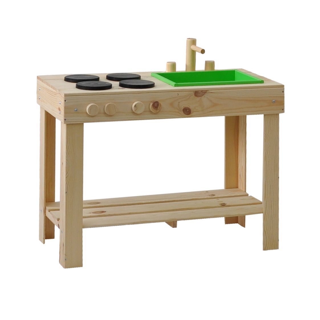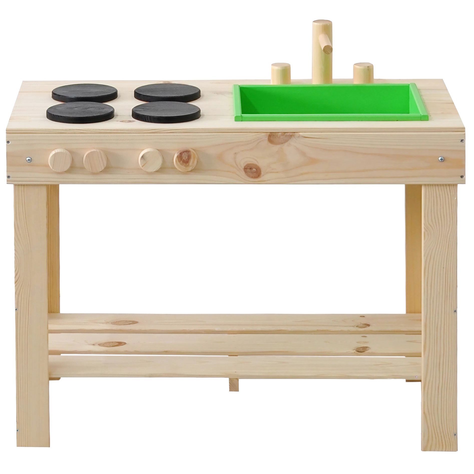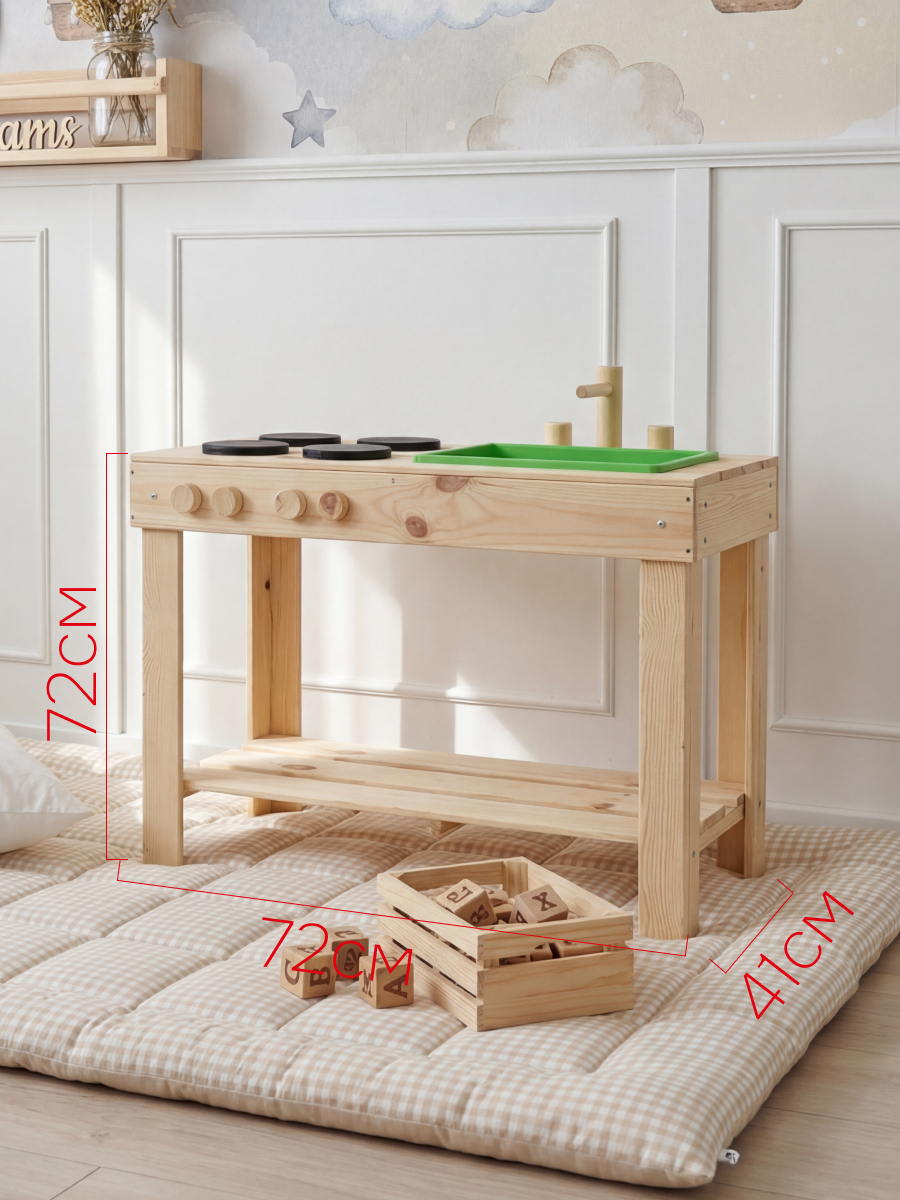 Детская кухня их экологически чистых материалов идеально подойдет как для игры на улице, так и в доме. Сборка игрушки у Вас не займет много времени, так как для Вашего удобства мы уже почти все собрали! Вам останется только прикрутить ножки и установить раковину и краны. Немного времени и деревянная кухня для Вашего малыша станет незаменимой игрушкой! Ведь тут можно проводить самые различные эксперименты, лепить из глины и пластилина, играть со своей игрушечной посудой, а если очень захочется, свою кухню можно будет перекрасить в новый цвет! Детская кухня производится без отделки, благодаря чему перекрасить игрушку очень легко, а ребенок может сам сделать выбор о желаемом цвете. В конструкции кухни имеется все необходимое для маленьких кулинаров: четыре конфорки, раковина, кран, полочка для хранения посуды и любых других игрушек. Размер кухни (В х Ш х Г): 72х72х40.7 см.