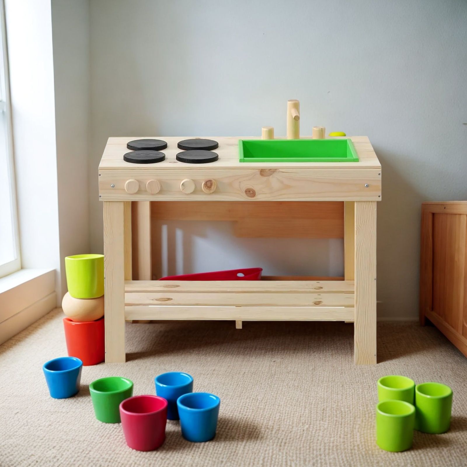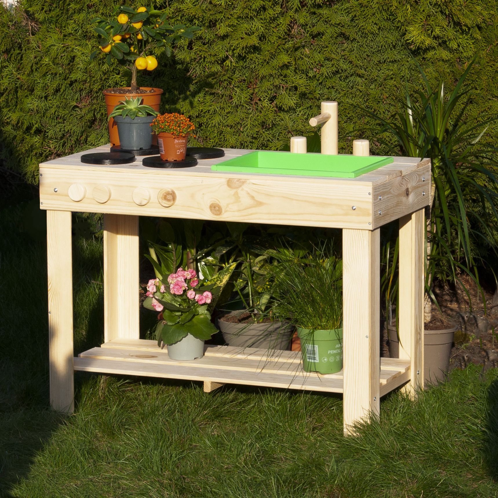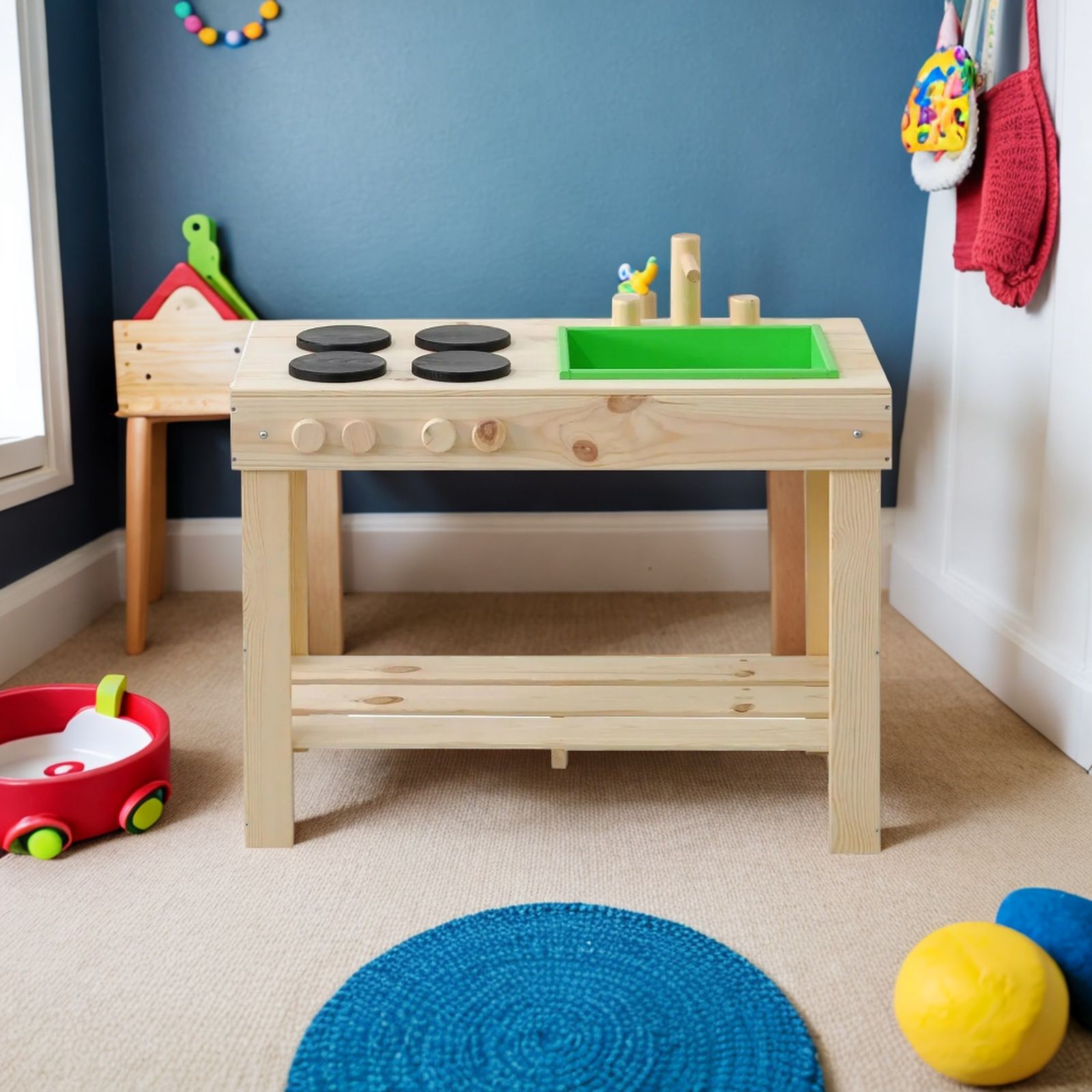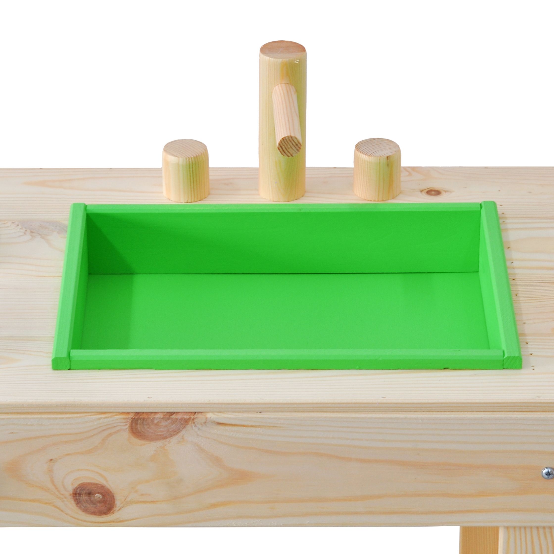 Детская кухня их экологически чистых материалов идеально подойдет как для игры на улице, так и в доме. Сборка игрушки у Вас не займет много времени, так как для Вашего удобства мы уже почти все собрали! Вам останется только прикрутить ножки и установить раковину и краны. Немного времени и деревянная кухня для Вашего малыша станет незаменимой игрушкой! Ведь тут можно проводить самые различные эксперименты, лепить из глины и пластилина, играть со своей игрушечной посудой, а если очень захочется, свою кухню можно будет перекрасить в новый цвет! Детская кухня производится без отделки, благодаря чему перекрасить игрушку очень легко, а ребенок может сам сделать выбор о желаемом цвете. В конструкции кухни имеется все необходимое для маленьких кулинаров: четыре конфорки, раковина, кран, полочка для хранения посуды и любых других игрушек. Размер кухни (В х Ш х Г): 72х72х40.7 см.