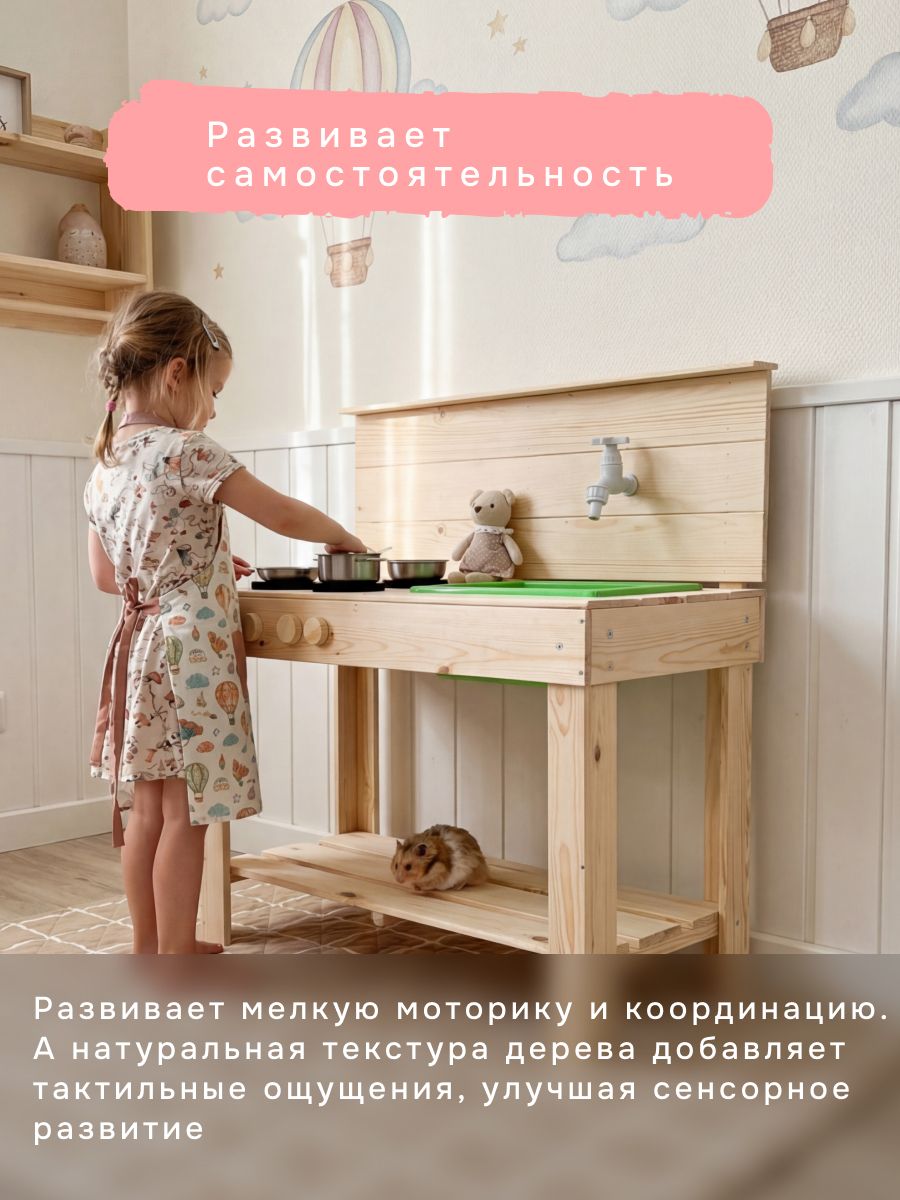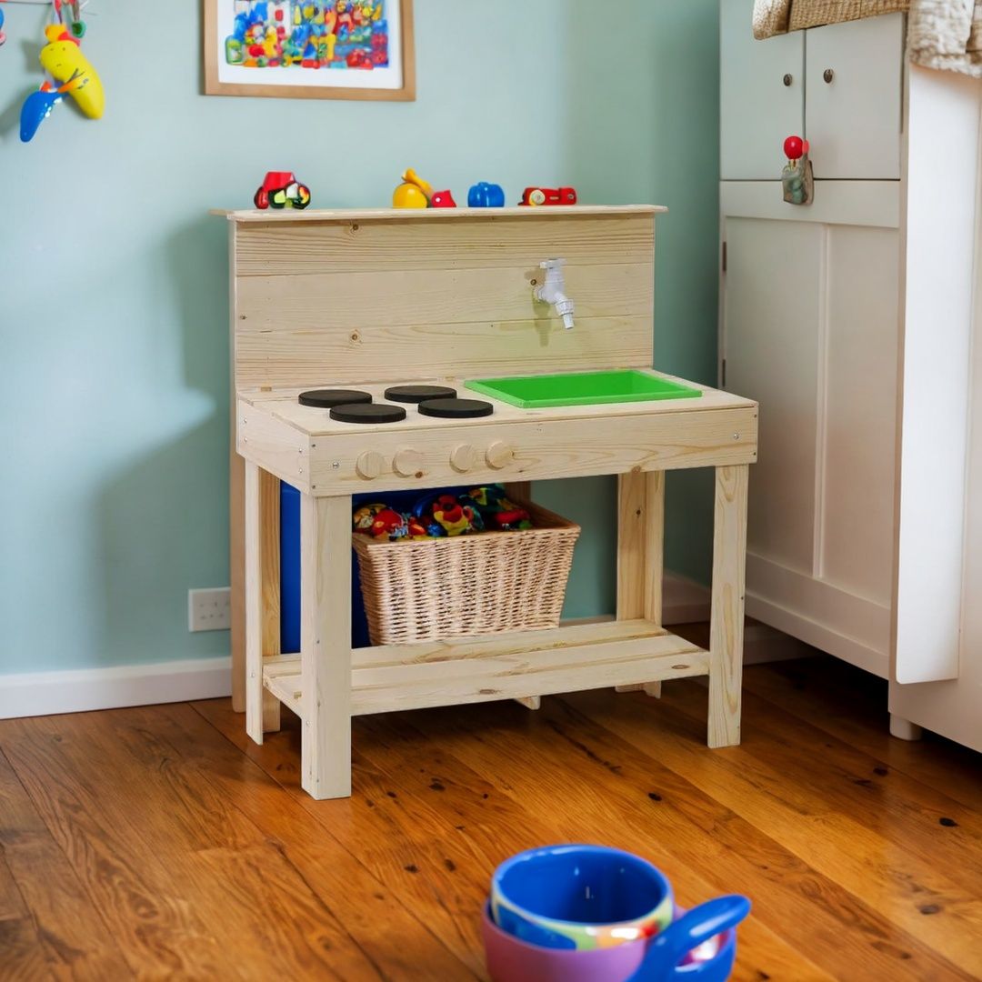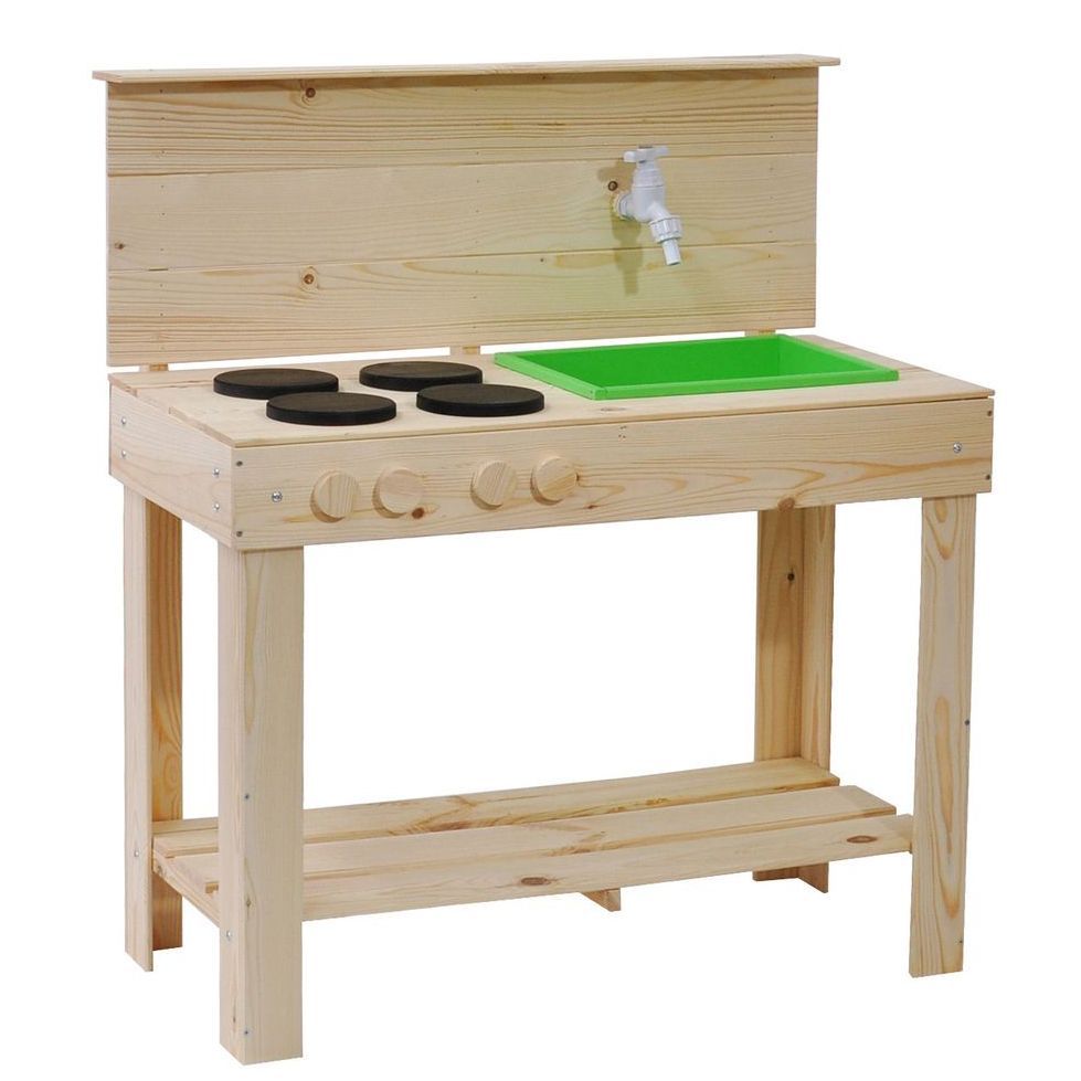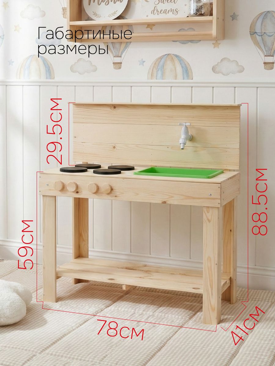 Детская кухня их экологически чистых материалов идеально подойдет как для игры на улице, так и в доме. Сборка игрушки у Вас не займет много времени, так как для Вашего удобства мы уже почти все собрали! Вам останется только прикрутить ножки и установить раковину и краны. Немного времени и деревянная кухня для Вашего малыша станет незаменимой игрушкой! Ведь тут можно проводить самые различные эксперименты, лепить из глины и пластилина, играть со своей игрушечной посудой, а если очень захочется, свою кухню можно будет перекрасить в новый цвет! Детская кухня производится без отделки, благодаря чему перекрасить игрушку очень легко, а ребенок может сам сделать выбор о желаемом цвете. В конструкции кухни имеется все необходимое для маленьких кулинаров: четыре конфорки, раковина, кран, полочка для хранения посуды и любых других игрушек. Кран настоящий - к нему можно прикрутить шланг с водой и ребенок сможет помыть свою посуду. Кухня изготовлена из массива сосны. Размер кухни (В х Ш х Г): 97.5х72х40.7 см.