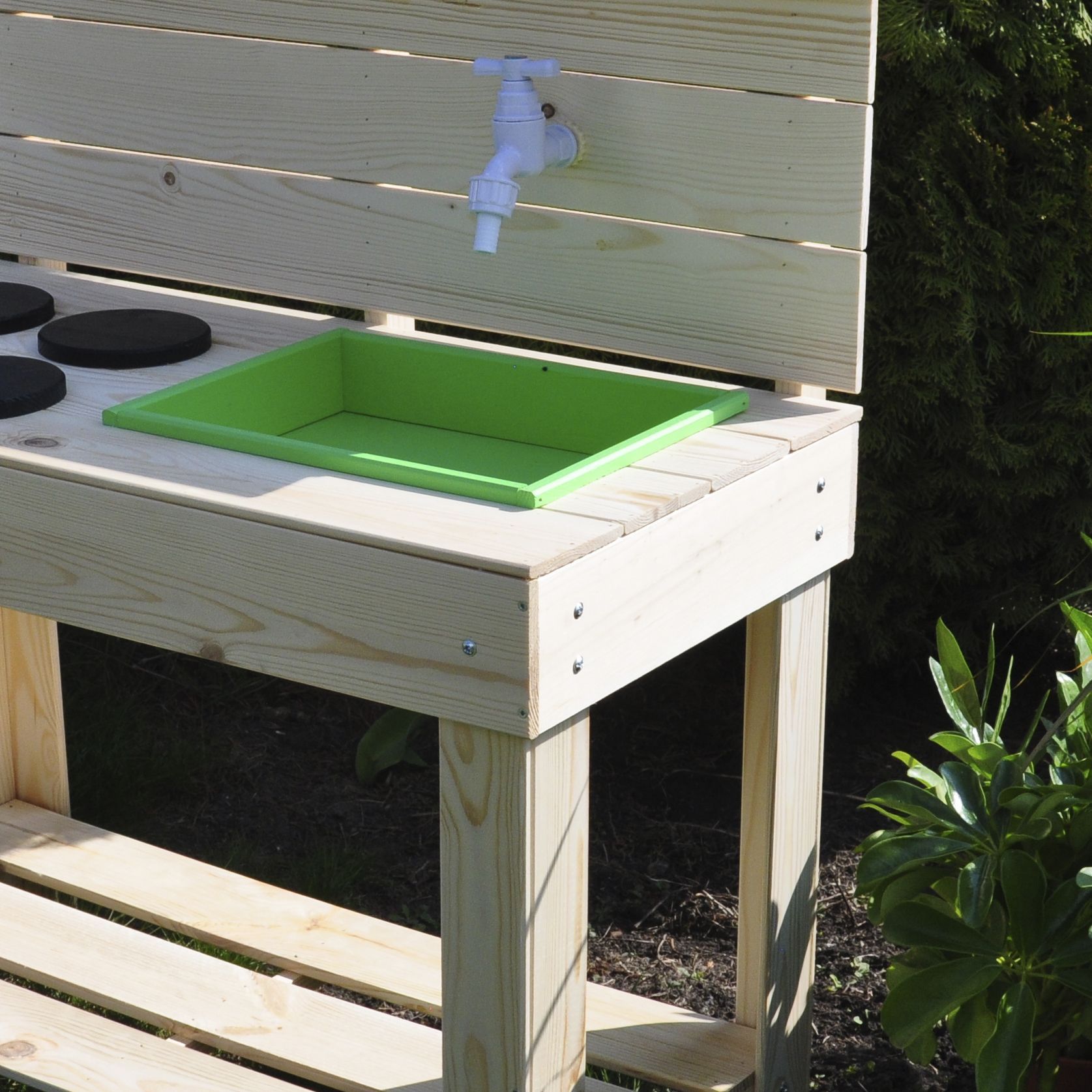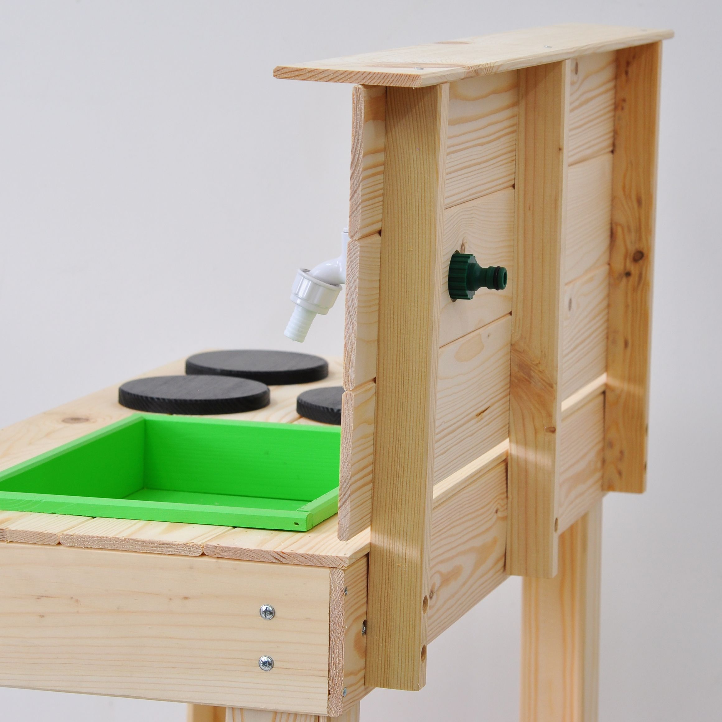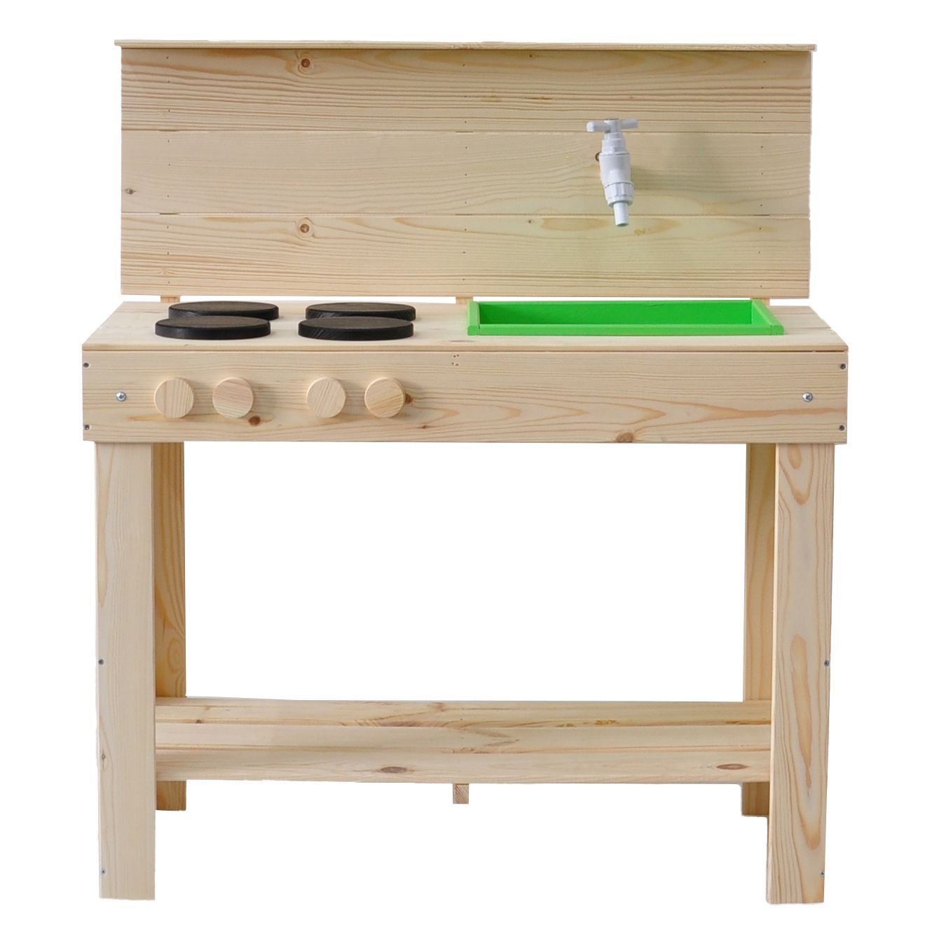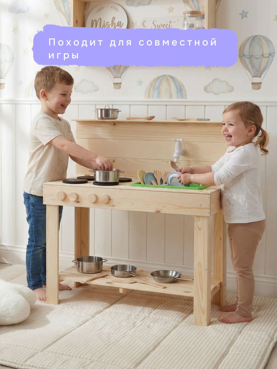 Детская кухня их экологически чистых материалов идеально подойдет как для игры на улице, так и в доме. Сборка игрушки у Вас не займет много времени, так как для Вашего удобства мы уже почти все собрали! Вам останется только прикрутить ножки и установить раковину и краны. Немного времени и деревянная кухня для Вашего малыша станет незаменимой игрушкой! Ведь тут можно проводить самые различные эксперименты, лепить из глины и пластилина, играть со своей игрушечной посудой, а если очень захочется, свою кухню можно будет перекрасить в новый цвет! Детская кухня производится без отделки, благодаря чему перекрасить игрушку очень легко, а ребенок может сам сделать выбор о желаемом цвете. В конструкции кухни имеется все необходимое для маленьких кулинаров: четыре конфорки, раковина, кран, полочка для хранения посуды и любых других игрушек. Кран настоящий - к нему можно прикрутить шланг с водой и ребенок сможет помыть свою посуду. Кухня изготовлена из массива сосны. Размер кухни (В х Ш х Г): 97.5х72х40.7 см.