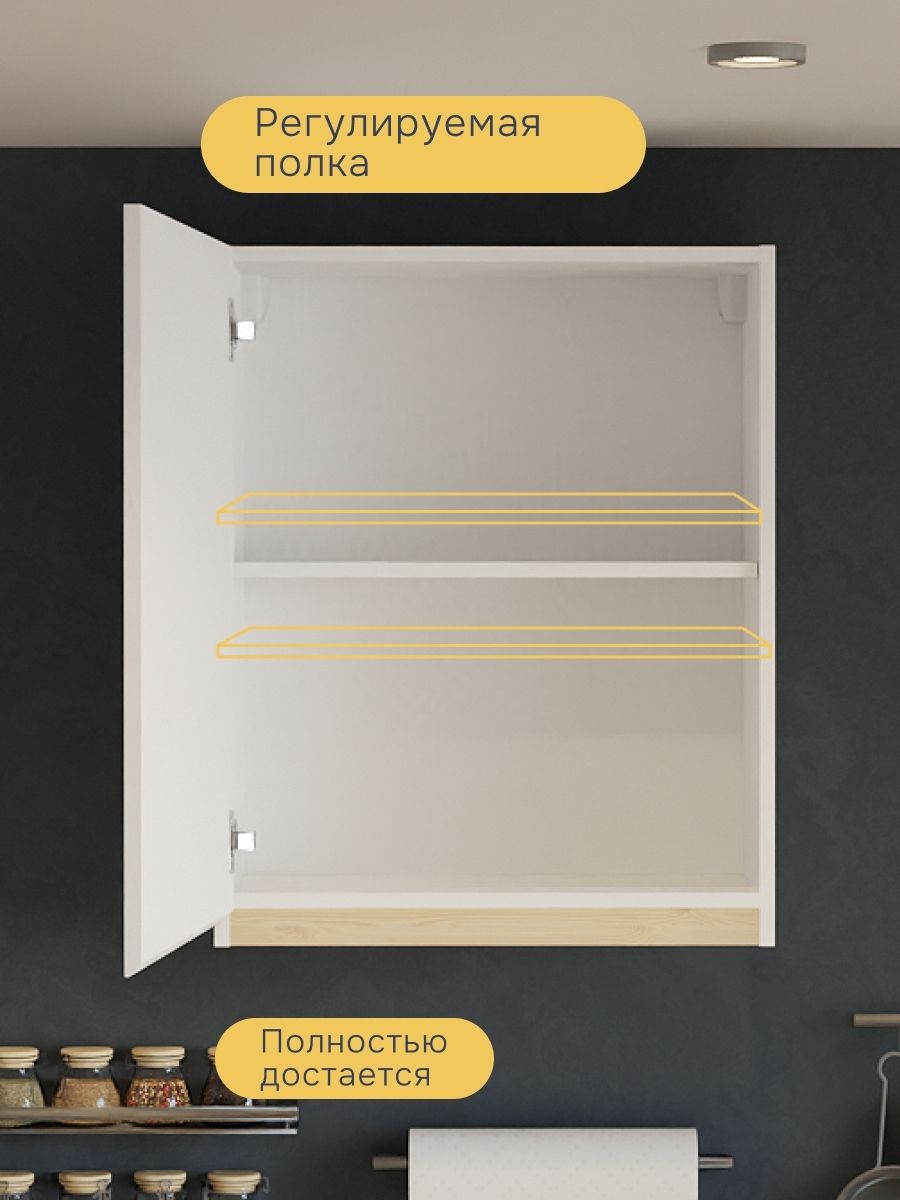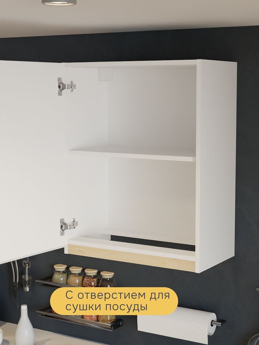 Модуль выполнен из безопасного ЛДСП (класс эмиссии Е1) с вставками из массива сосны, покрытыми белесым лаком — придаёт кухне свежесть и уют. Регулируемая полка, доводчик на дверце и отверстие под сушку создают максимум комфорта. Все крепления и фурнитура в комплекте.