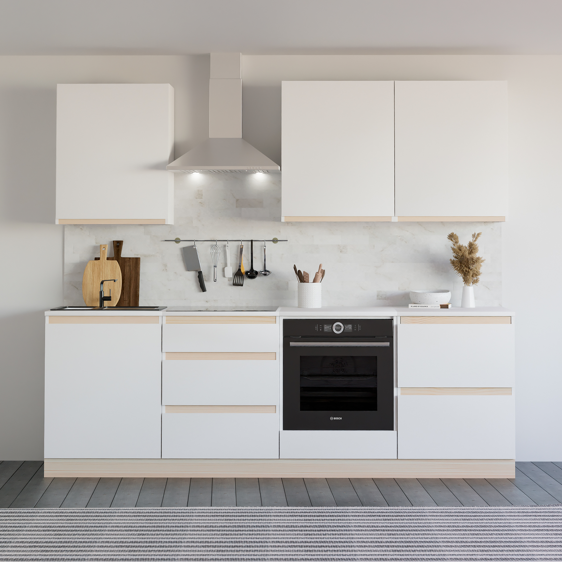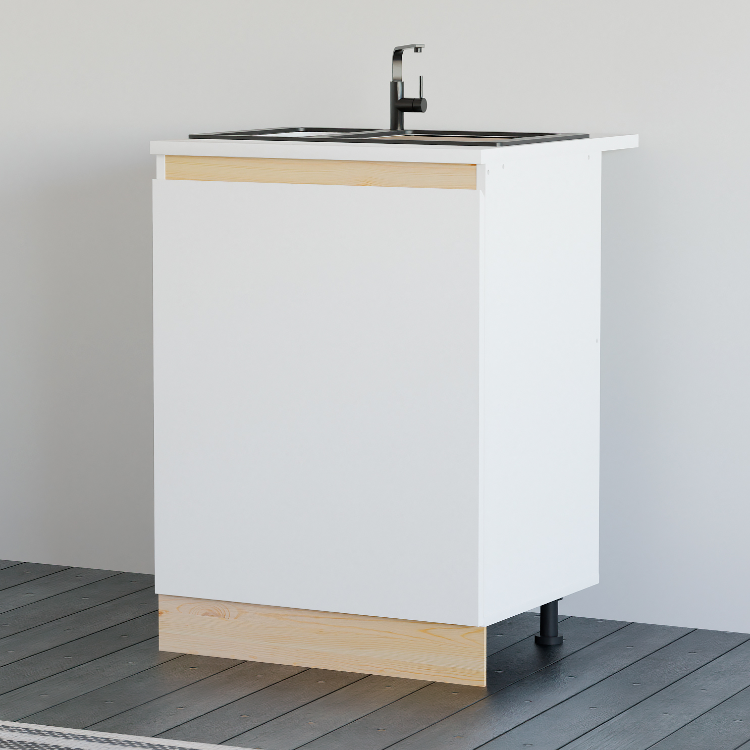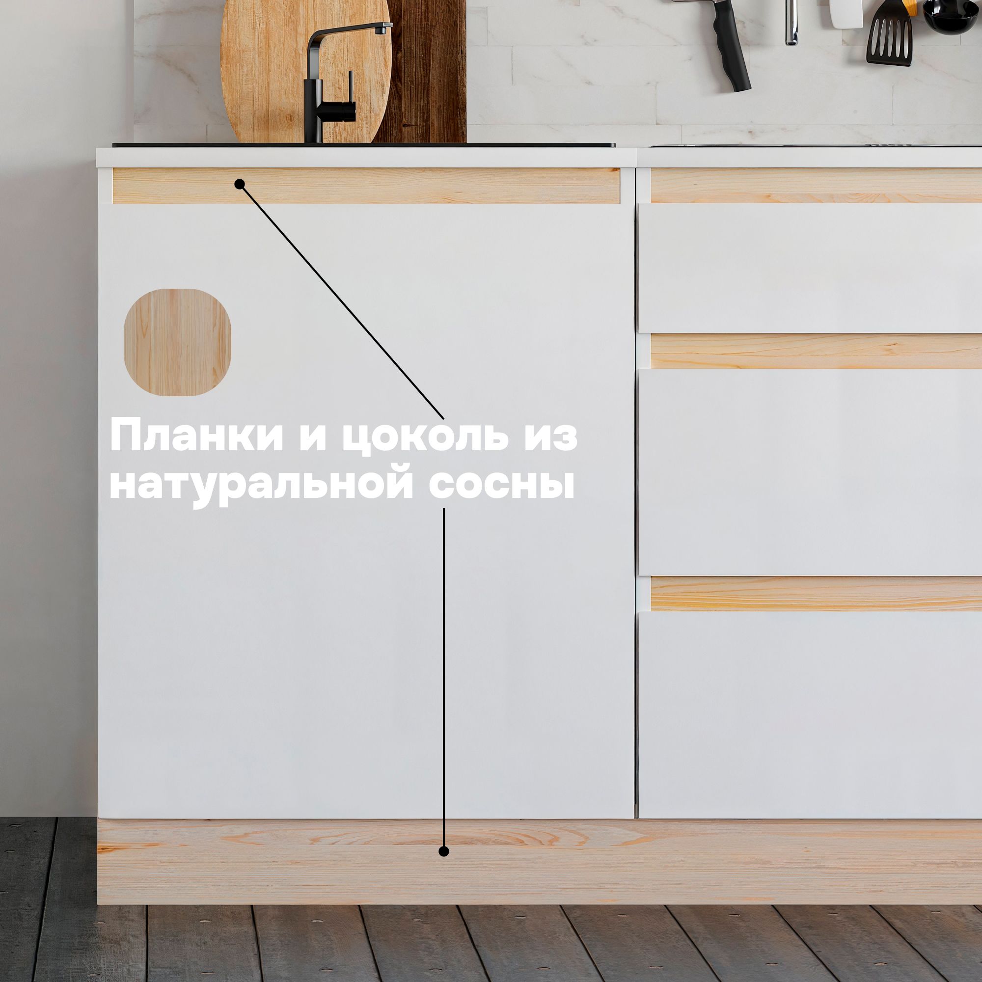 Универсальный напольный кухонный модуль в современном стиле отличается лаконичным дизайном со скрытыми ручками и декоративными вставками из массива дерева (сосны), что придает уникальность каждому элементу мебели.
