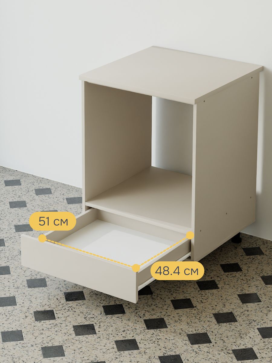 - Нижний выдвижной ящик на металлических роликовых направляющих с нагрузкой до 5 кг — идеальное место для хранения противней, форм и кухонных принадлежностей