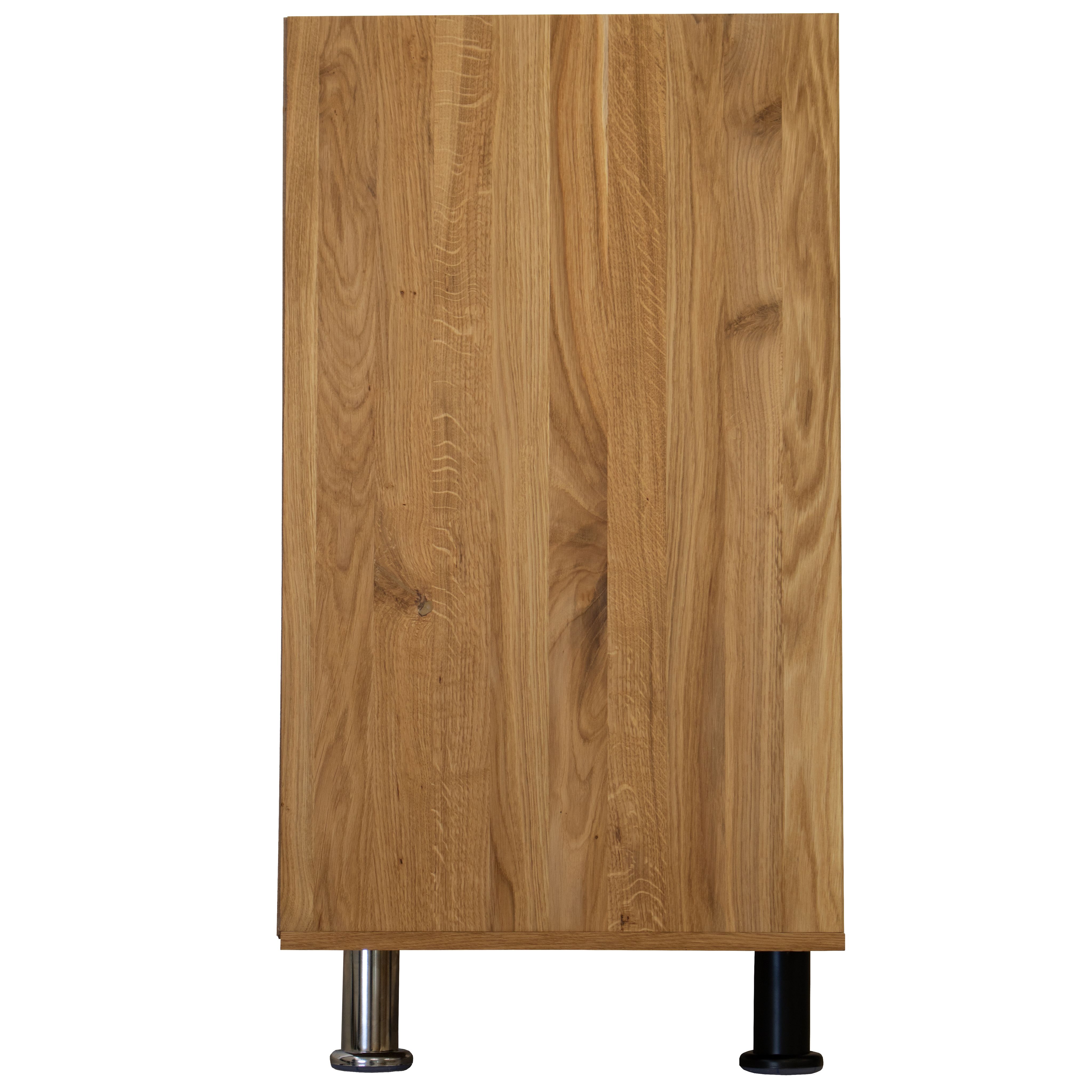 Универсальный напольный кухонный модуль в современном стиле отличается лаконичным дизайном натурального массива дуба и белой поверхности столешницы, что придает уникальность каждому элементу мебели.