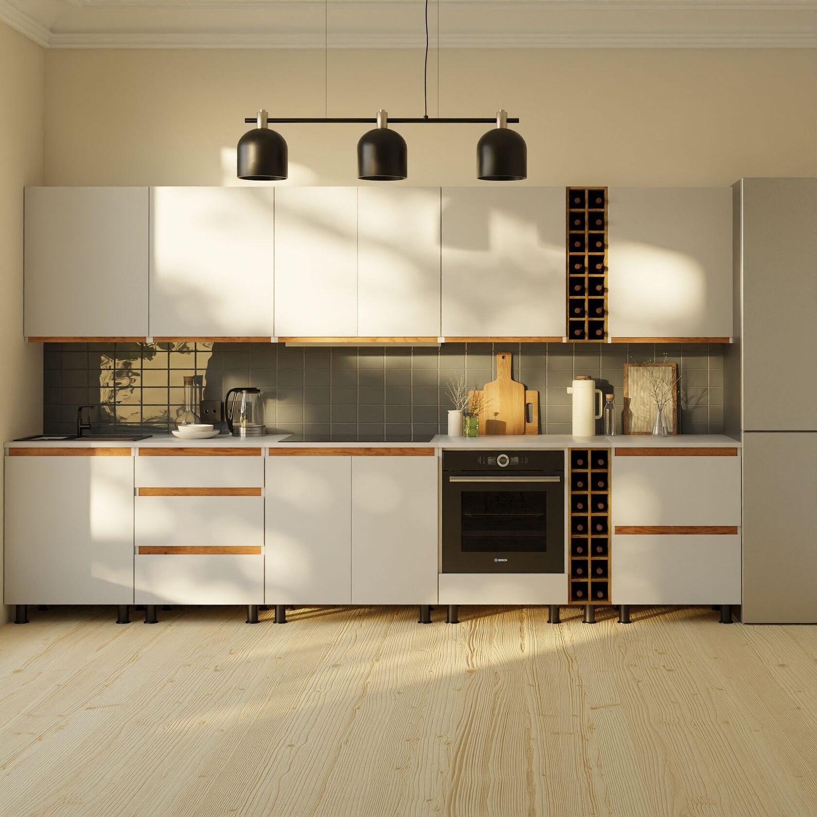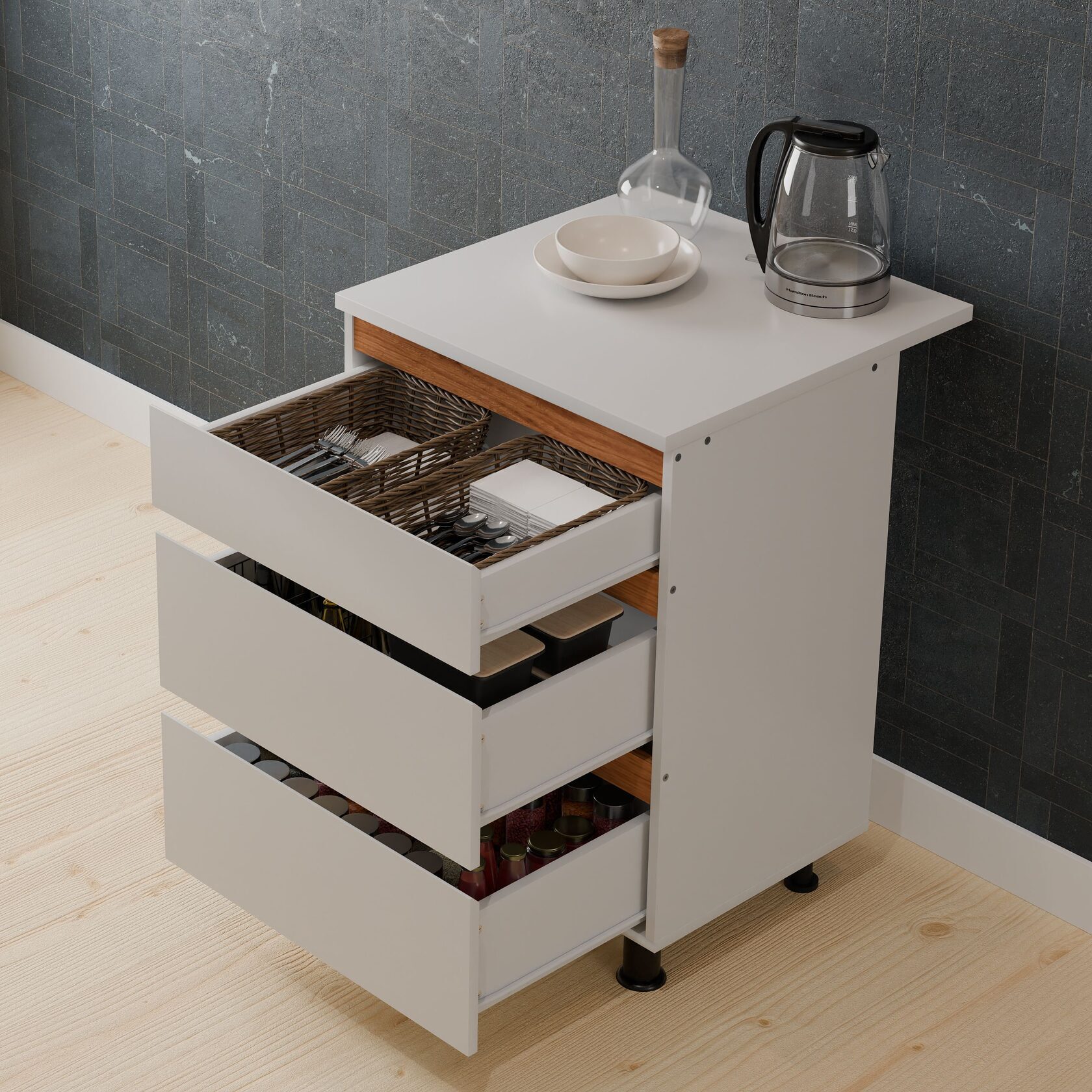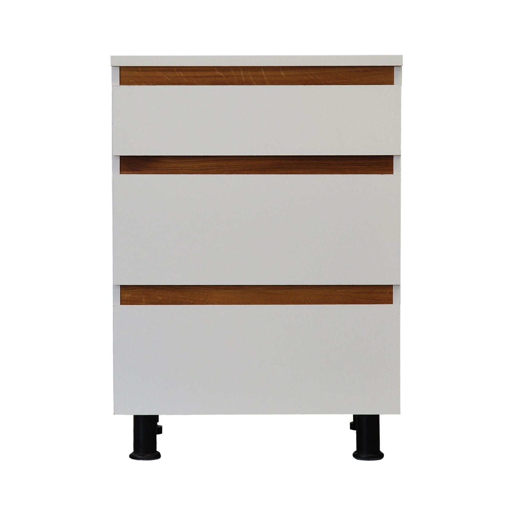 Создайте неповторимую кухню современного стиля модерн в светлых тонах с нашей модульной серией Валенсия. Современный стиль и универсальность Универсальный напольный кухонный модуль в современном стиле отличается лаконичным дизайном со скрытыми ручками и декоративными вставками из массива дуба, что придает уникальность каждому элементу мебели. Конструкция кухонного модуля оснащена 3 ящиками: одним маленьким и двумя большими ящиками. Размеры шкафа под кухню в собранном виде (Ширина х Глубина х Высота, см) - 60х60х85 см, что позволит использовать его как в качестве небольшой кухонной тумбы, так и для создания полноценного кухонного гарнитура серии Валенсия. Вариант модуля кухни поставляется со столешницей размерами 60х60 см, толщина - 22 мм. Столешница выполнена с гладкими краями и кромками, что предотвращает случайные травмы и удары при использовании. Полный кухонный гарнитур Серия Валенсия включает различные напольные и настенные модули, которые можно легко комбинировать между собой, создавая индивидуальный и функциональный кухонный гарнитур под собственные потребности. Создайте свою кухню мечты, или кухню-столовую мечты, или кухню-студию мечты - всё это вместе с нашими кухонными модулями Валенсия. Удобное хранение Все ящики оборудованы металлическими роликовыми направляющими, что обеспечивает плавность и полное выдвижение каждого ящика. Скрытые ручки с гладкими скосами позволят использовать ящики с удовольствием, предоставляя легкость доступа и уборки. Ящики рассчитаны на нагрузку до 10 кг, что позволяет хранить тяжелые кухонные принадлежности без опасений. Эргономичная конструкция Удобная высота - Высота модуля составляет 85 см, что делает его универсальным выбором для людей любого роста. Высокие ножки для легкой уборки - Ножки из черной матовой стали производства AKS высотой 10 см обеспечивают достаточное пространство для прохождения робота-пылесоса, что значительно облегчает уборку. Задние ножки регулируются по высоте (+-20 мм), позволяя избежать перекосов из-за неровности пола и обеспечивая устойчивость модуля. Прочная столешница - Столешница из прочного белого ЛДСП размером 60х60 см, толщиной 22 мм выдерживает нагрузку в диапазоне 30-40 кг, обеспечивая прочность и долговечность при использовании. Высококачественные материалы Тумба на кухню изготовлена из качественного ламинированного ДСП (ЛДСП) с декоративными вставками из массива дуба, что обеспечивает долговечность и привлекательный внешний вид. При изготовлении шкафа использовалось только безопасное для человека ЛДСП в соответствии с европейскими нормами классов содержания формальдегида (не более 10 мг на 100 г). Имеет нежный белый цвет, поэтому мебель всегда будет придавать комнате приятный и светлый внешний вид. Задняя стенка и дно ящиков выполнены из белого ДВП с целью облегчения конструкции, делая её более привлекательной и долговечной. Кухонный шкаф выполнен на высокоточном оборудовании, все кромки изделия аккуратно обработаны промышленным методом на современных станках, что обеспечивает плотное прилегание и прочность древесного слоя при контакте с влагой, а также устойчивость к влажности и деформации. Сборка кухонного модуля в домашних условиях не вызовет трудностей за счет понятной инструкции по сборке и комплекта необходимой фурнитуры. Изделие п