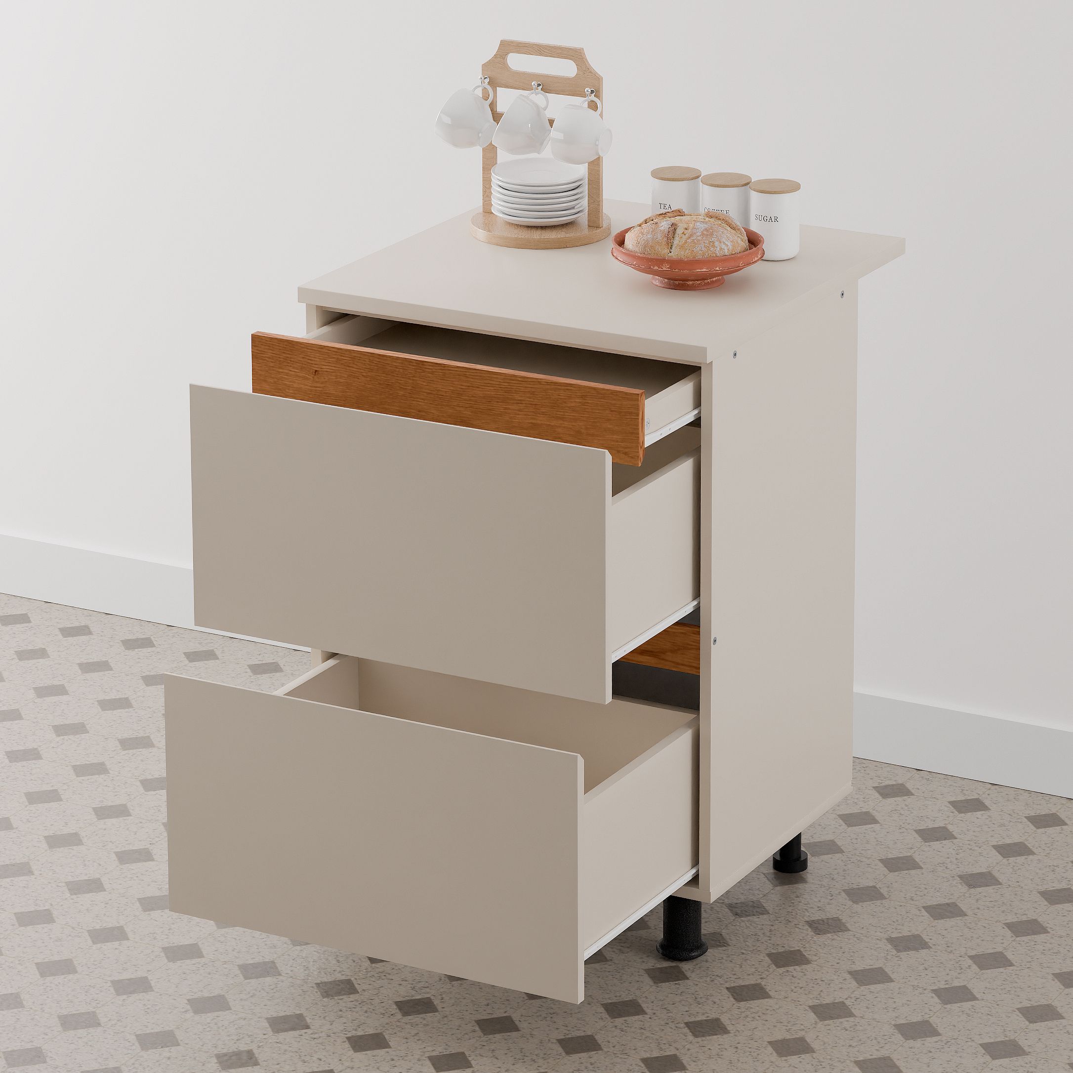 Конструкция кухонного модуля оснащена 3 ящиками: одним маленьким и двумя большими ящиками. Размеры шкафа под кухню в собранном виде (Ширина х Глубина х Высота, см) - 60х44.8х82.5 см, что позволит использовать его как в качестве небольшой кухонной тумбы, так и для создания полноценного кухонного гарнитура серии Виго. Обратите внимание, что этот вариант модуля кухни поставляется без столешницы.