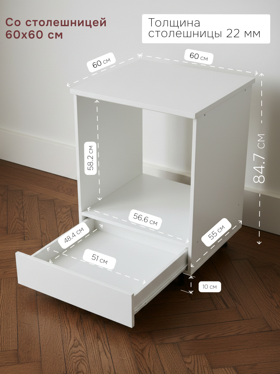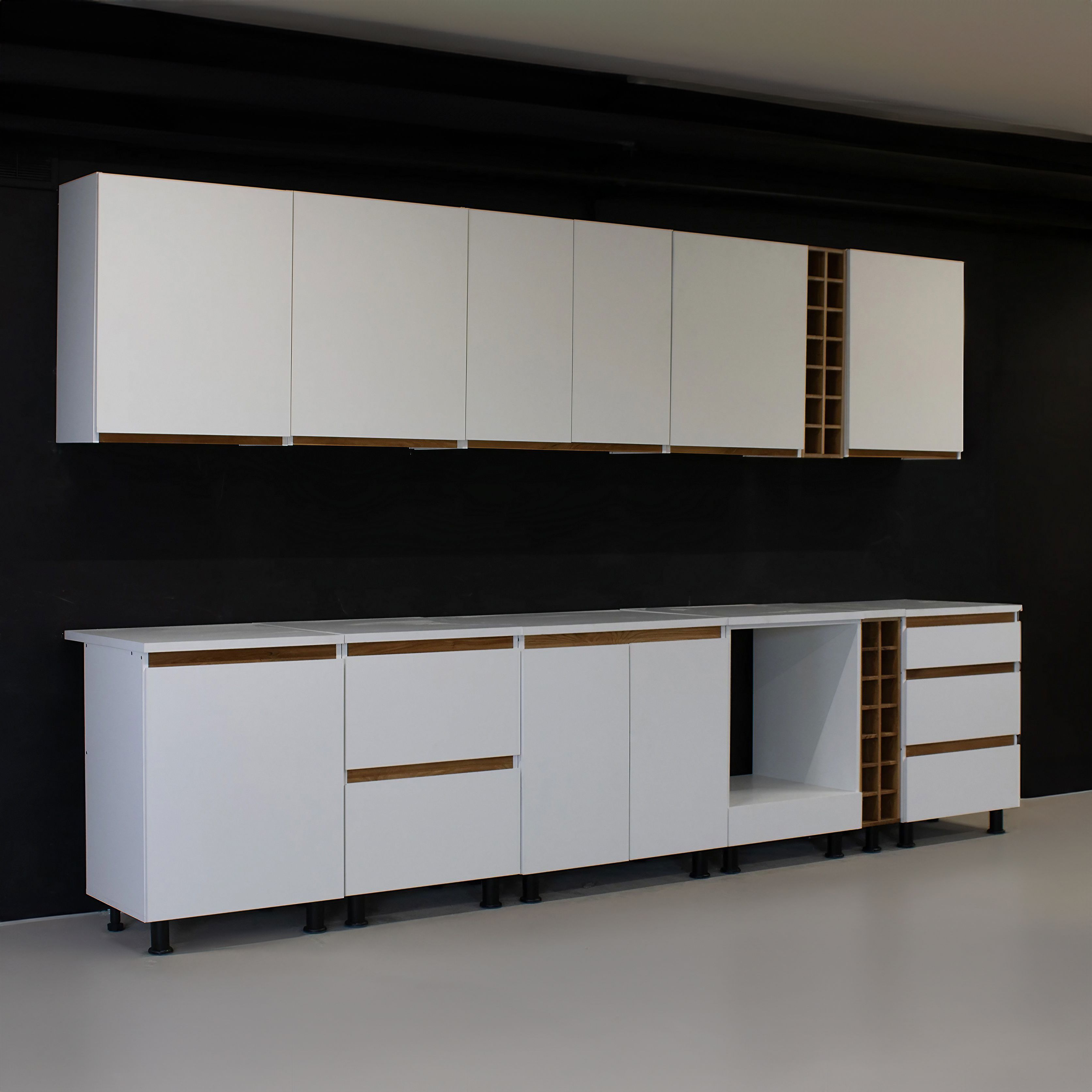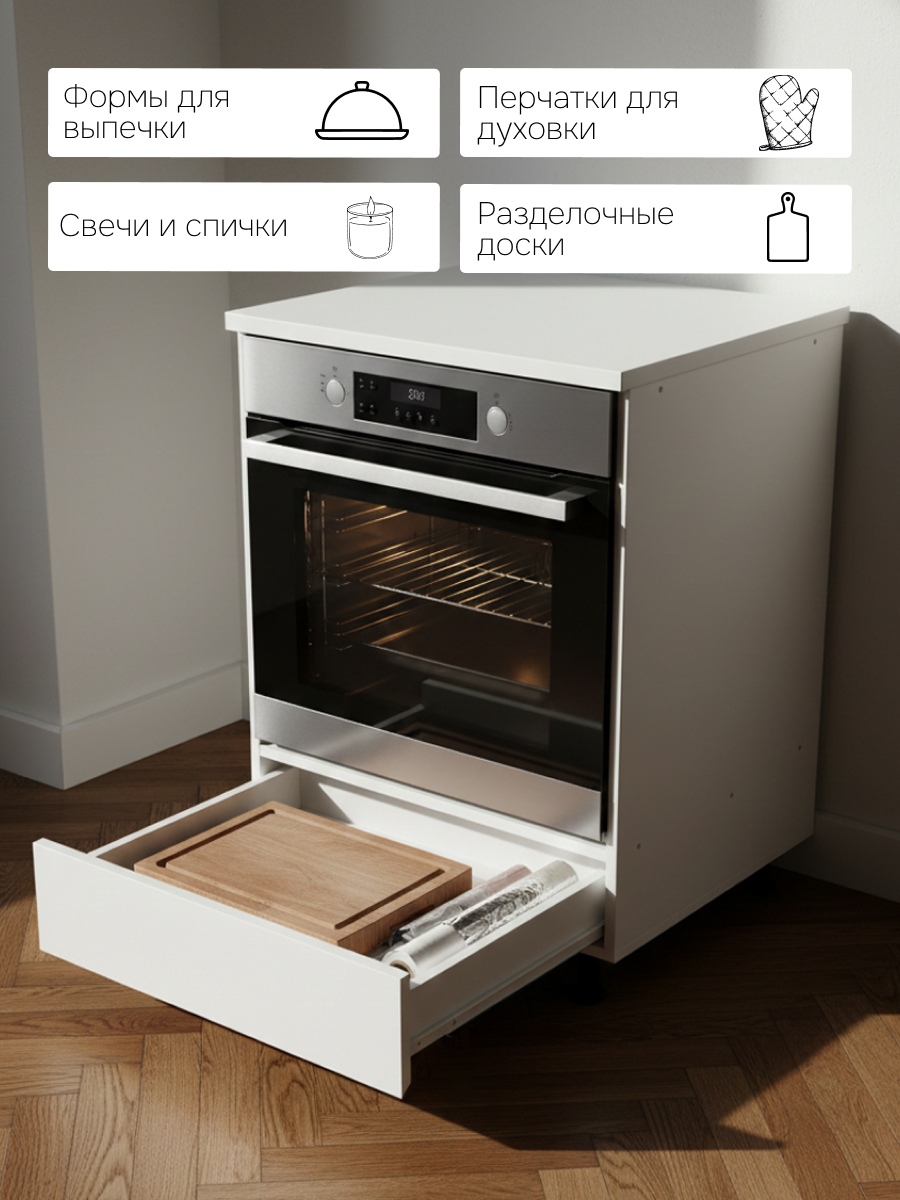 Модуль под духовой шкаф оснащен достаточным пространством для размещения большинства современных духовых шкафов. Открытая задняя стенка рассчитана на монтаж необходимых коммуникаций, дно белого шкафа под духовой шкаф выдержит необходимую нагрузку, что позволит использовать его без опасений. Вместительный ящик под духовым шкафом позволит организовать все кухонные приборы в чистоте и порядке
