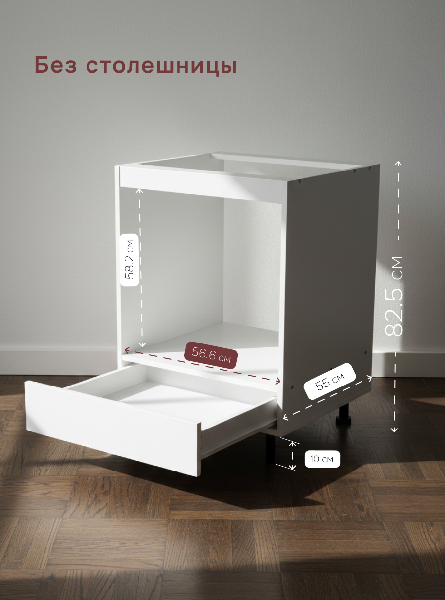 Конструкция панели под духовой шкаф оснащена открытой задней стенкой для монтажа необходимых коммуникаций и ящиком в нижней части. Размеры кухонного шкафа в собранном виде (Ширина х Глубина х Высота, см) - 60х55х82.5 см, что позволит использовать его как в качестве небольшой кухонной тумбы, так и для создания полноценного кухонного гарнитура серии Валенсия. Ящик выполнен на металлических роликовых направляющих и выдерживает нагрузку до 5 кг. Вариант модуля под духовой шкаф поставляется без столешницы.