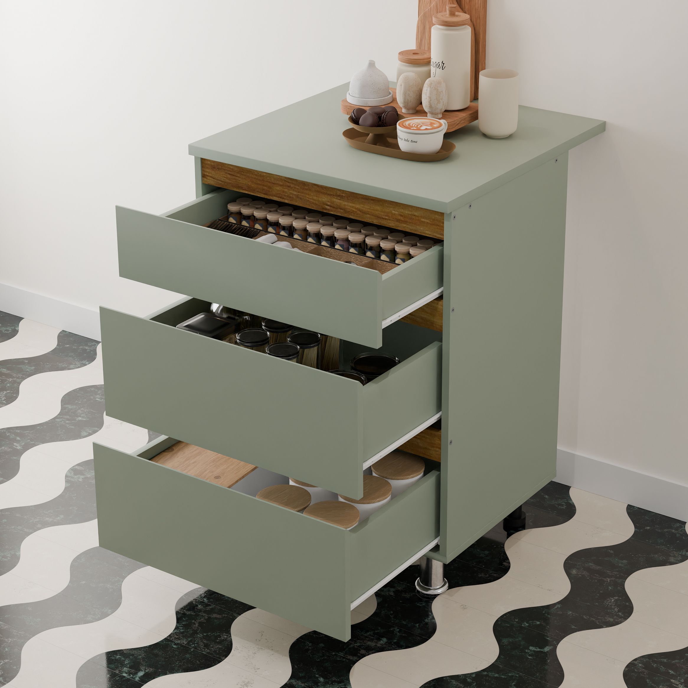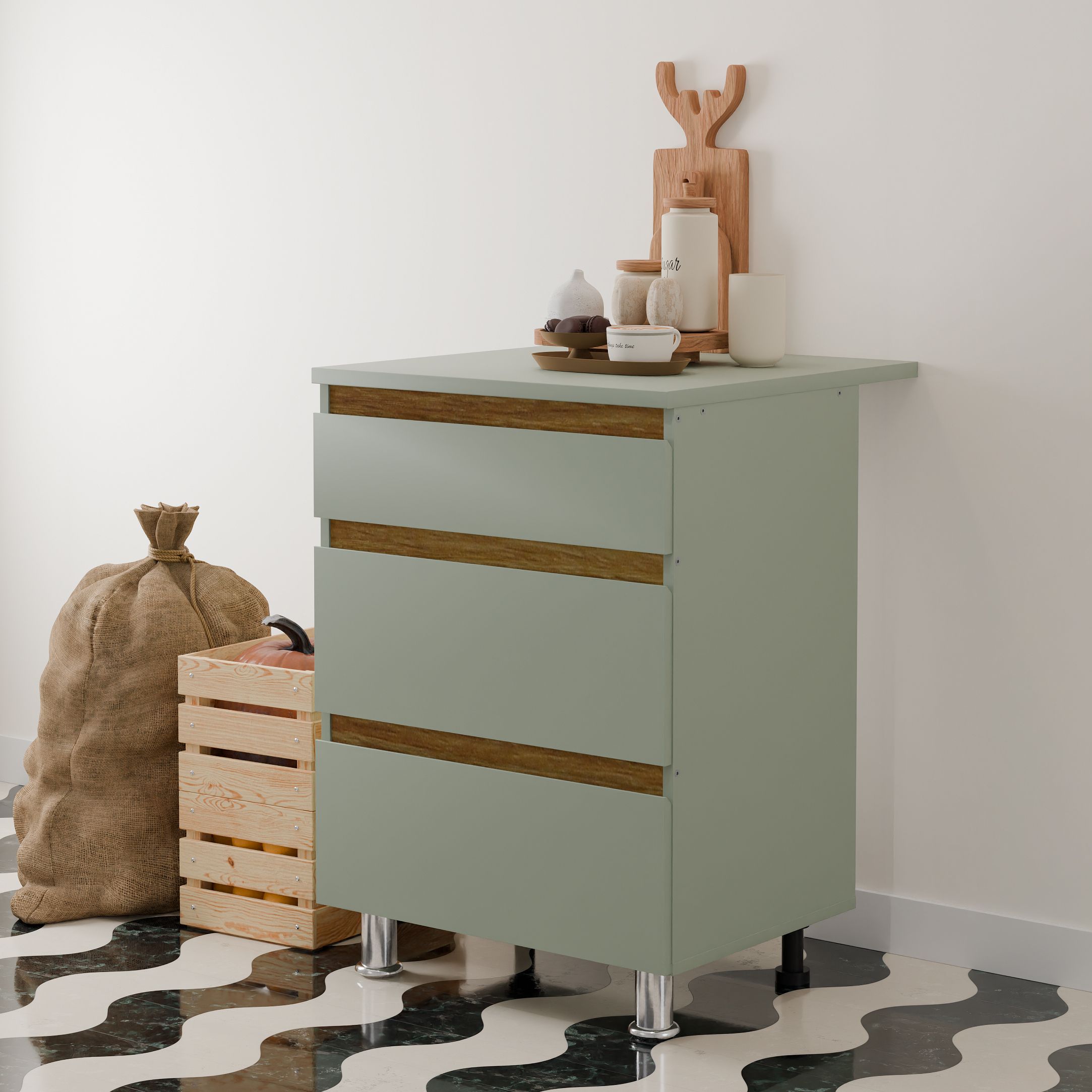 Тумба на кухню изготовлена из качественного ламинированного ДСП (ЛДСП) с декоративными вставками из массива дуба, что обеспечивает долговечность и привлекательный внешний вид. При изготовлении шкафа использовалось только безопасное для человека ЛДСП в соответствии с европейскими нормами классов содержания формальдегида (не более 10 мг на 100 г). Имеет нежный зеленый цвет, поэтому мебель всегда будет придавать комнате приятный и светлый внешний вид. Задняя стенка и дно ящиков выполнены из белого ДВП с целью облегчения конструкции, делая её более привлекательной и долговечной.