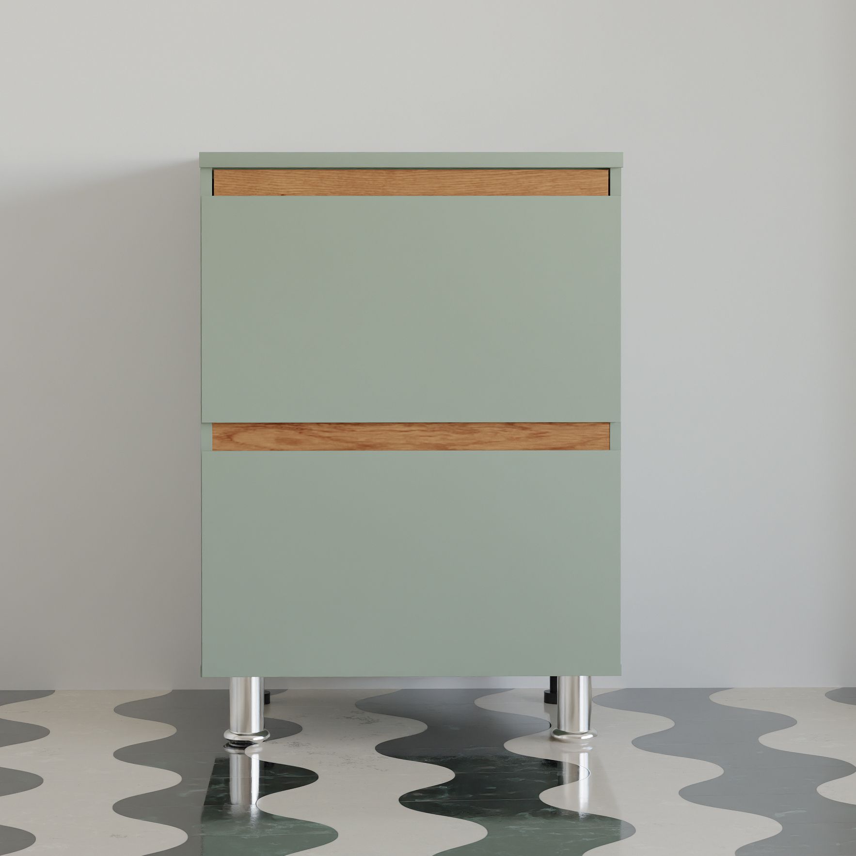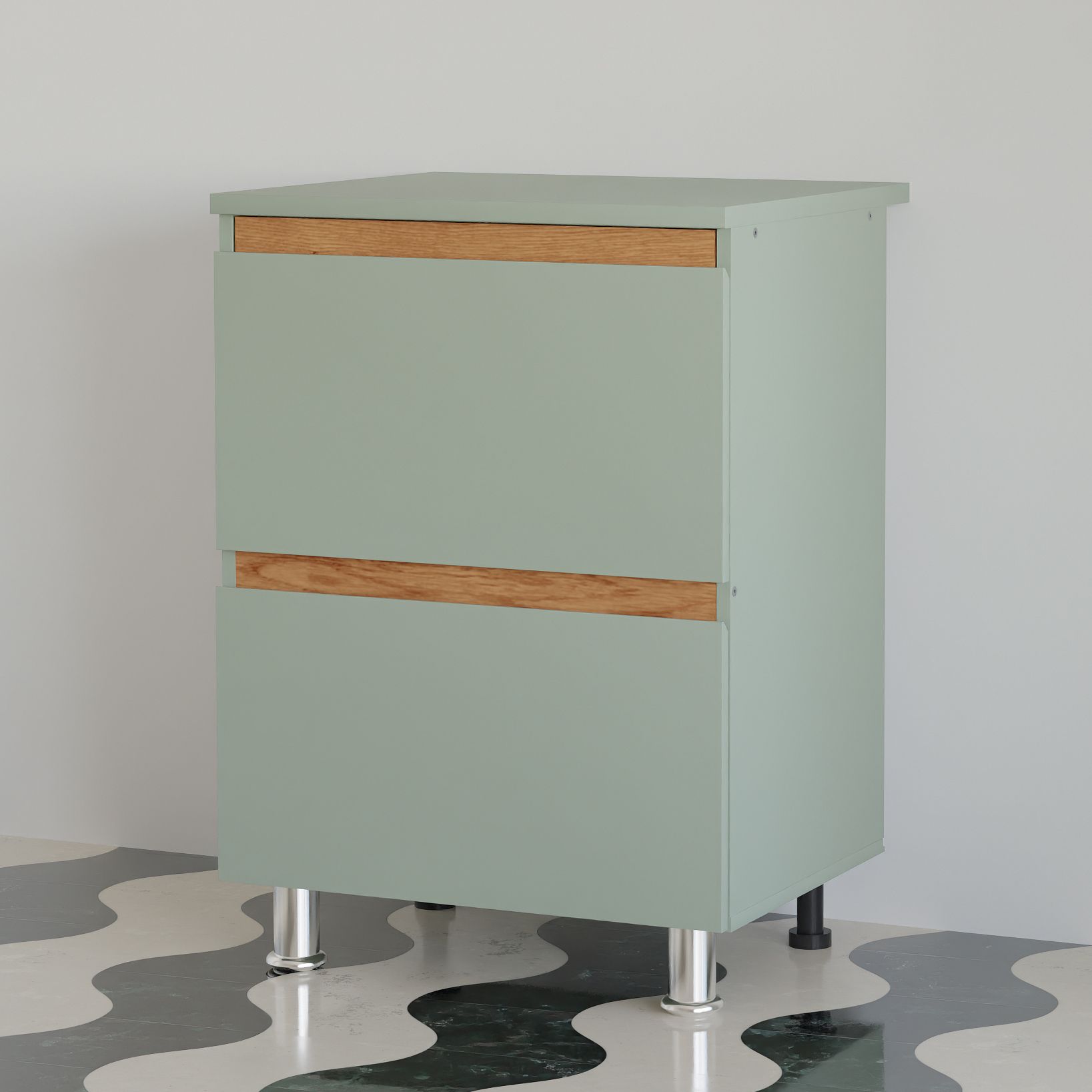 Тумба на кухню изготовлена из качественного ламинированного ДСП (ЛДСП) и дополнена декоративными вставками из массива дуба, что обеспечивает долговечность и привлекательный внешний вид. При изготовлении шкафа использовалось только безопасное для человека ЛДСП в соответствии с европейскими нормами классов содержания формальдегида (не более 10 мг на 100 г). Имеет нежный зеленый цвет, поэтому мебель всегда будет придавать комнате приятный и светлый внешний вид. Задняя стенка и дно ящиков выполнены из белого ДВП с целью облегчения конструкции, делая её более привлекательной и долговечной.