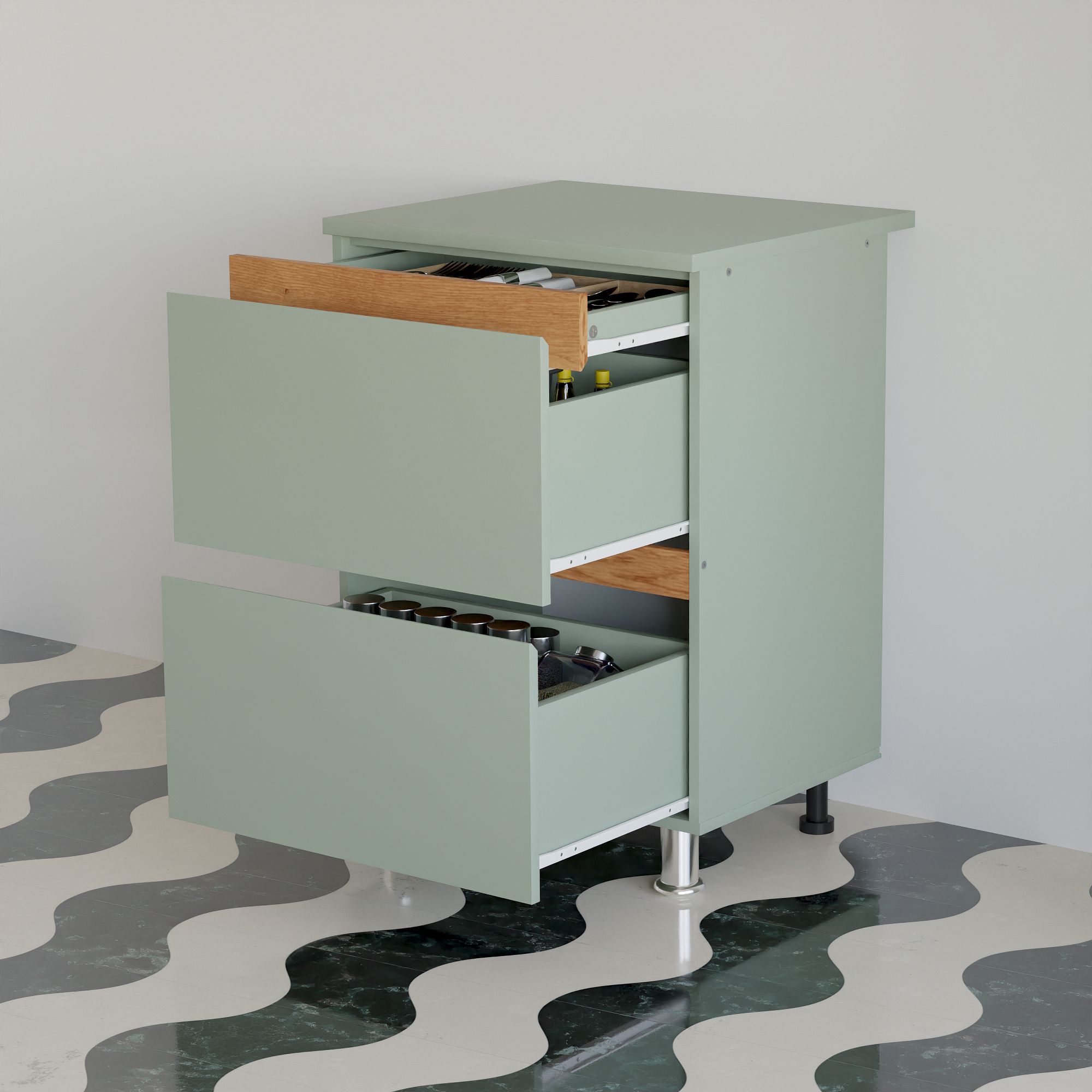 Все ящики оборудованы телескопическими направляющими полного выдвижения от известного европейского производителя Boyard, что обеспечивает плавность и полное выдвижение каждого ящика. Скрытые ручки с гладкими скосами позволят использовать ящики с удовольствием, предоставляя легкость доступа и уборки. Ящики рассчитаны на нагрузку до 10 кг, что позволяет хранить тяжелые кухонные принадлежности без опасений.