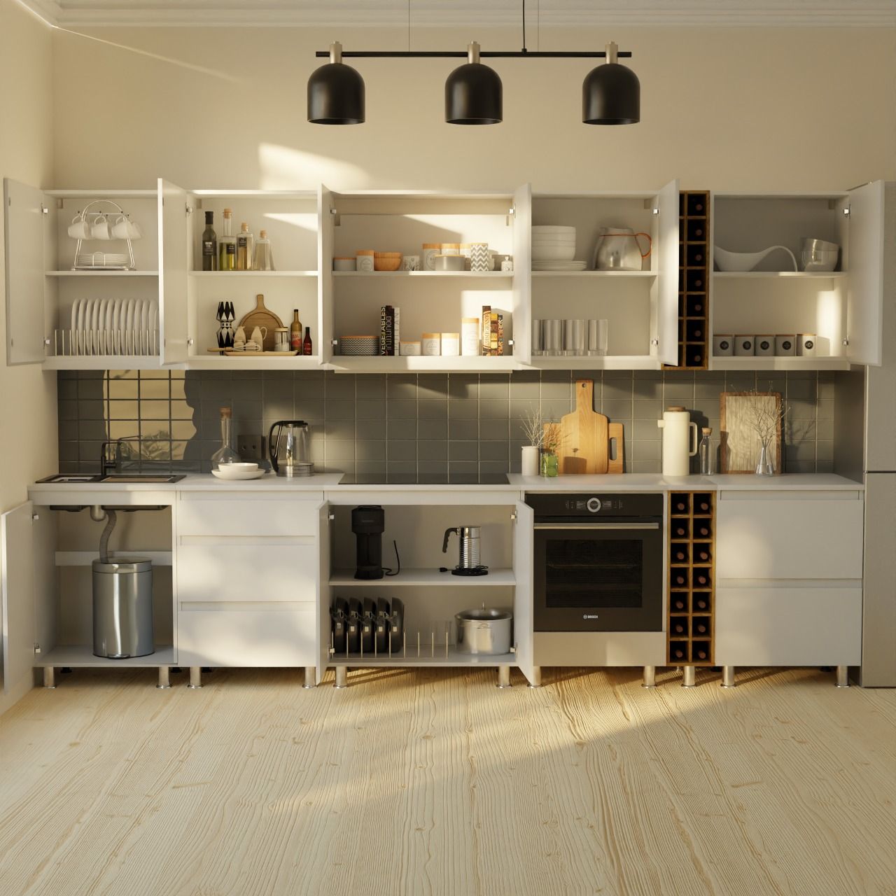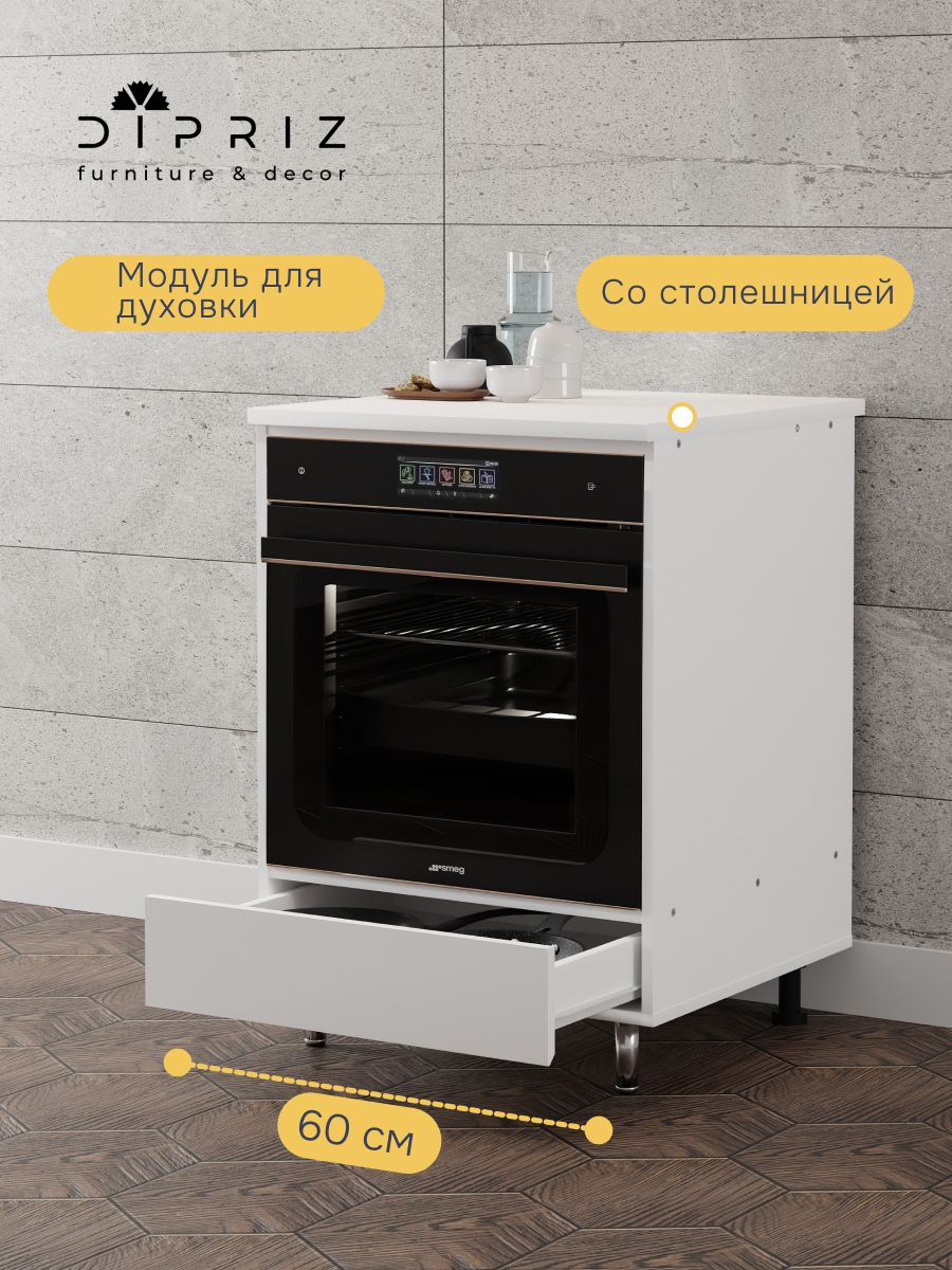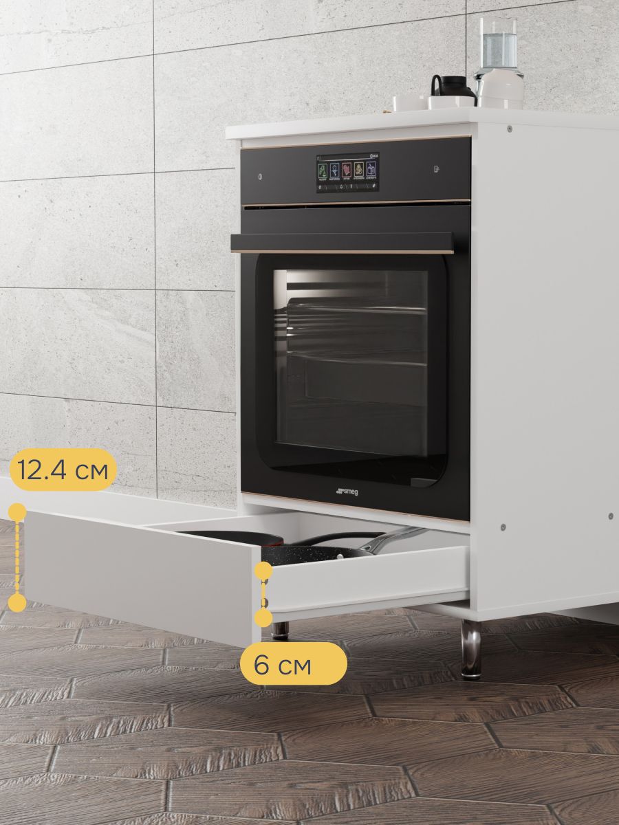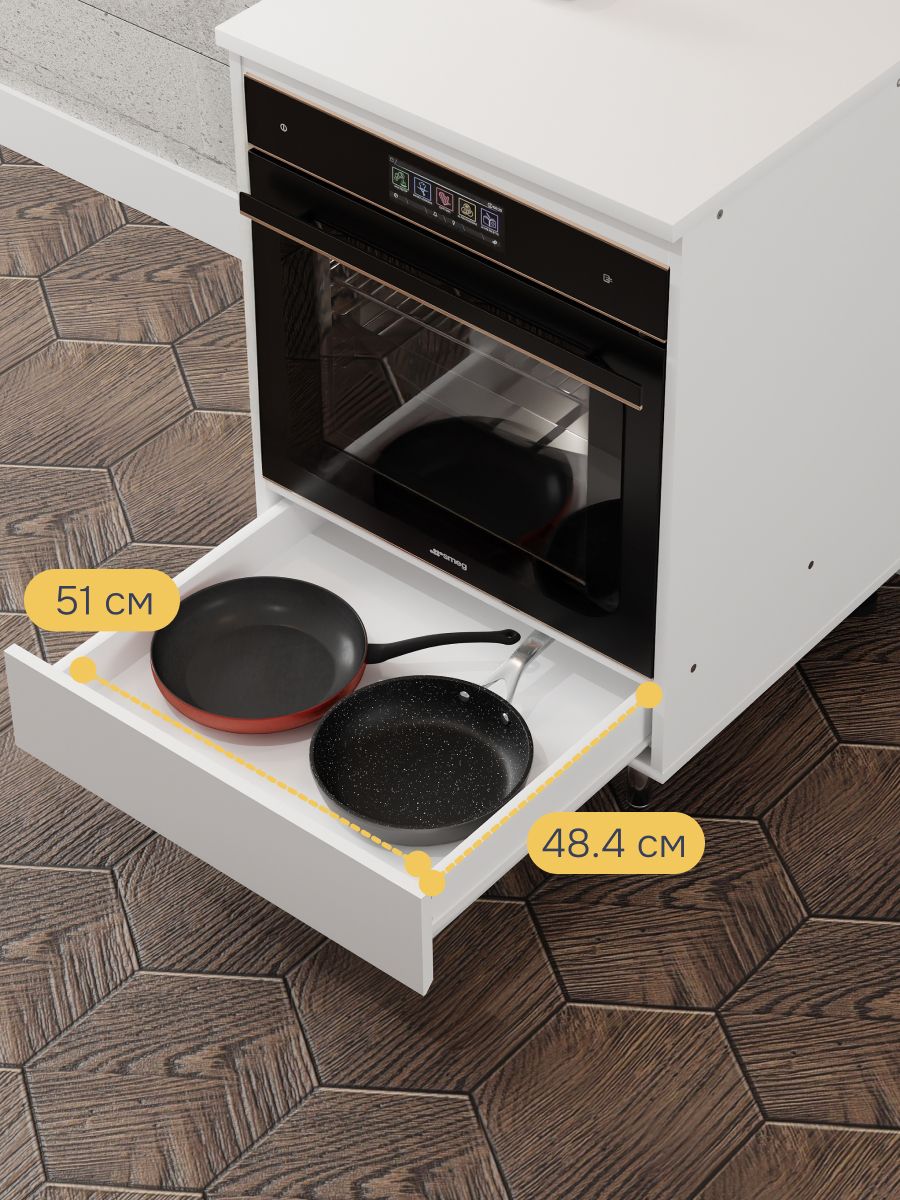 Модуль под духовой шкаф оснащен достаточным пространством для размещения большинства современных духовых шкафов. Открытая задняя стенка рассчитана на монтаж необходимых коммуникаций, дно белого шкафа под духовой шкаф выдержит необходимую нагрузку, что позволит использовать его без опасений. Вместительный ящик под духовым шкафом позволит организовать все кухонные приборы в чистоте и порядке