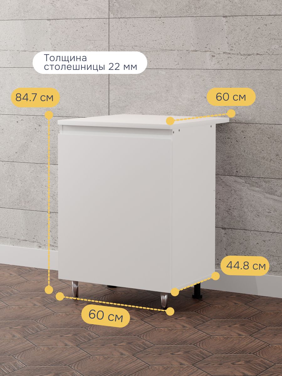 - Прочная столешница - Столешница из прочного белого ЛДСП размером 60х60 см, толщиной 22 мм выдерживает нагрузку в диапазоне 30-40 кг, обеспечивая прочность и долговечность при использовании.