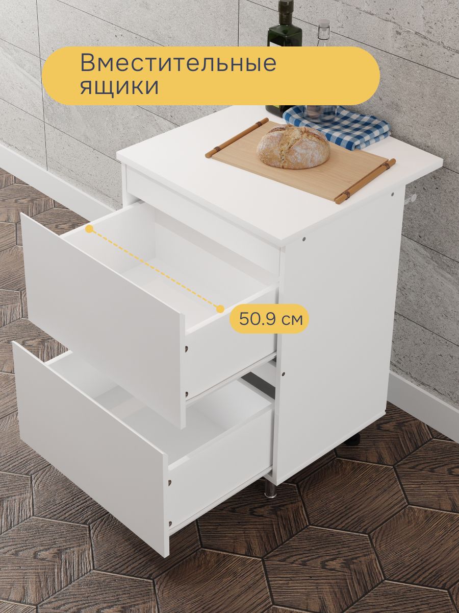 - Прочная столешница - Столешница из прочного белого ЛДСП размером 60х60 см, толщиной 22 мм выдерживает нагрузку в диапазоне 30-40 кг, обеспечивая прочность и долговечность при использовании.