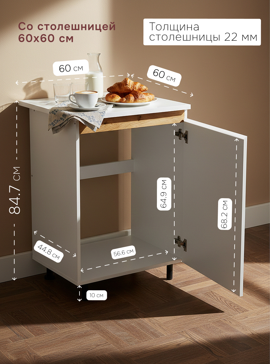 - Прочная столешница - Столешница из прочного белого ЛДСП размером 60х60 см, толщиной 22 мм выдерживает нагрузку в диапазоне 30-40 кг, обеспечивая прочность и долговечность при использовании.
