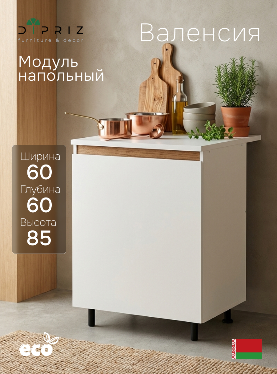 Конструкция тумбы под раковину оснащена распашной дверью и открытой задней стенкой для монтажа необходимых коммуникаций. Размеры кухонного шкафа в собранном виде (Ширина х Глубина х Высота, см) - 60х60х85 см, что позволит использовать его как в качестве небольшой кухонной тумбы, так и для создания полноценного кухонного гарнитура серии Валенсия. Вариант тумбы под раковину поставляется со столешницей размерами 60х60 см, толщина - 22 мм. Столешница выполнена с гладкими краями и кромками, что предотвращает случайные травмы и удары при использовании.