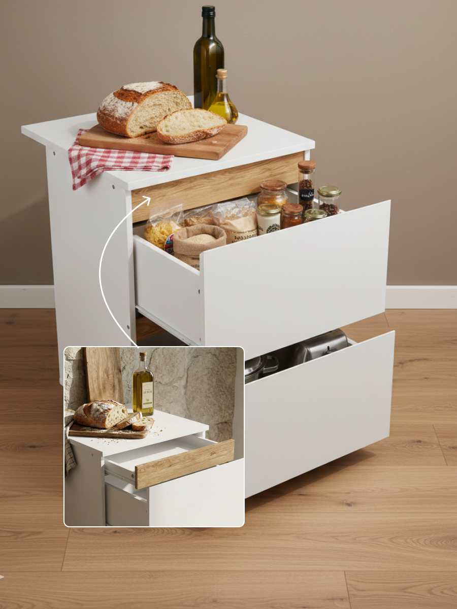 Все ящики оборудованы металлическими роликовыми направляющими, что обеспечивает плавность и полное выдвижение каждого ящика. Скрытые ручки с гладкими скосами позволят использовать ящики с удовольствием, предоставляя легкость доступа и уборки. Ящики рассчитаны на нагрузку до 10 кг, что позволяет хранить тяжелые кухонные принадлежности без опасений.
